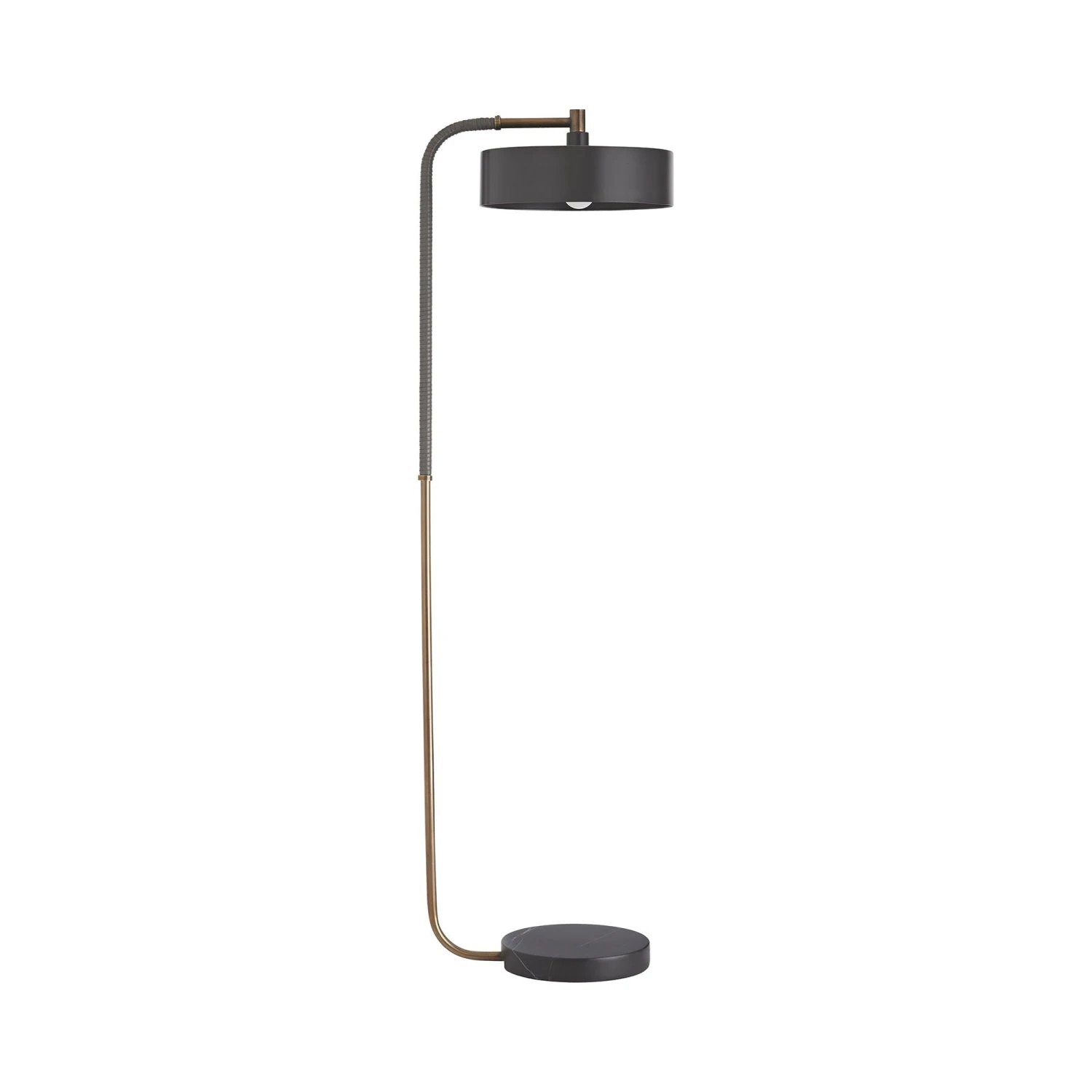 Infuse your space with modernist flair and a mixed media sensibility. The Aaron Floor Lamp from Arteriors pairs a C-shaped metal frame with a black marble base and a gray leather accent to create richness and distinction. A bronze finish drum shade caps the design and a dimmable switch on the cord allows for precise lighting control to create the perfect ambiance for every occasion.