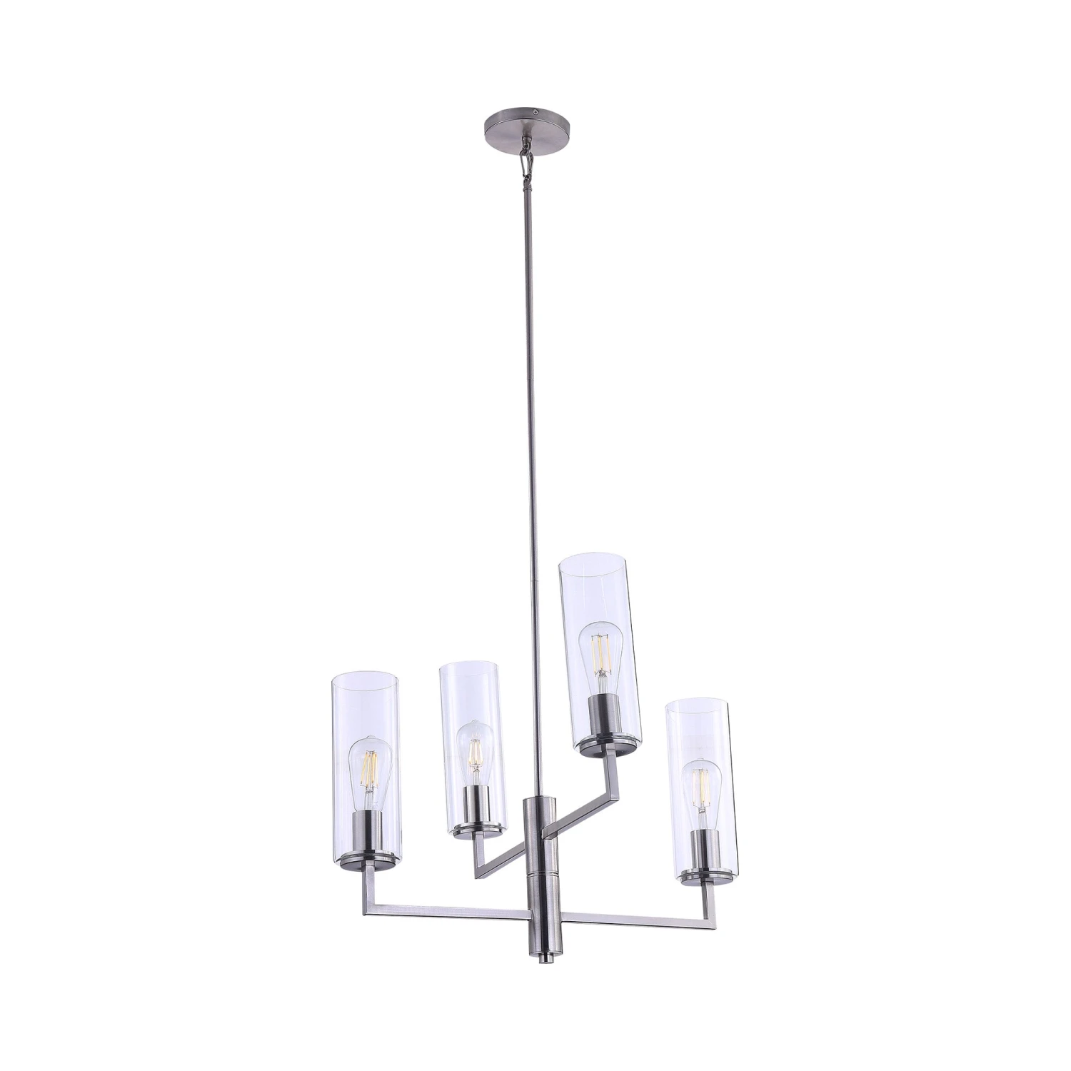 Create an ultra-modern aesthetic with the clean lines of the Acacia Chandelier from Minka Lavery. Designed in a gleaming brushed nickel finish, this understated, chic chandelier presents a series of staggered cylindrical clear glass shades, giving off a bright illumination across dining room tables and entryway foyers.