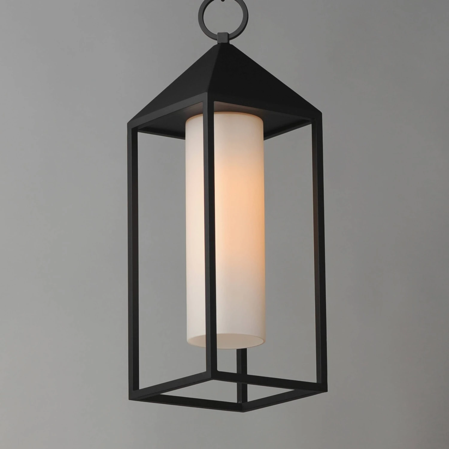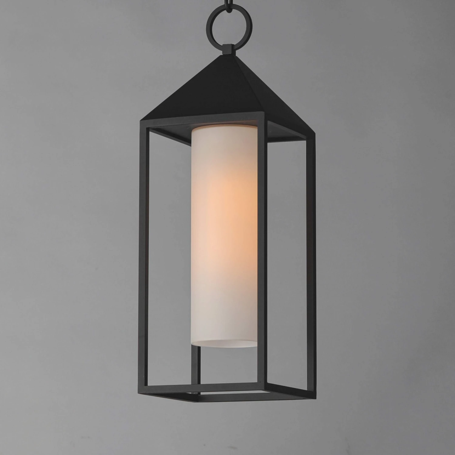 An inspired charm sneaks into conventional lantern fare as the Aldous Outdoor Pendant Light from Maxim Lighting perks up exterior covered porches and other venues. Clean lines reflect simplicity with black finish aluminum carving out an open frame, and a cylinder interior glass shade coordinating perfectly. Add this fixture to a low-key setting and enjoy its versatility.
