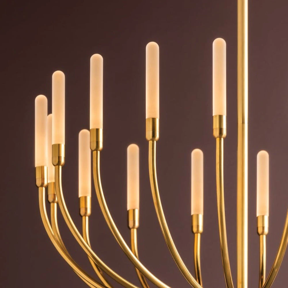 The Amalthea LED Chandelier from Corbett Lighting makes good use of symmetry in silhouetting, delivering a fresh contemporary style to a dining room or living room. Sweeping curved arms and a center stem showcase the brilliant warmth of vintage brass creating a branch-inspired design. Acrylic tubes cap each arm as they glow with ambient, energy-efficient lighting.