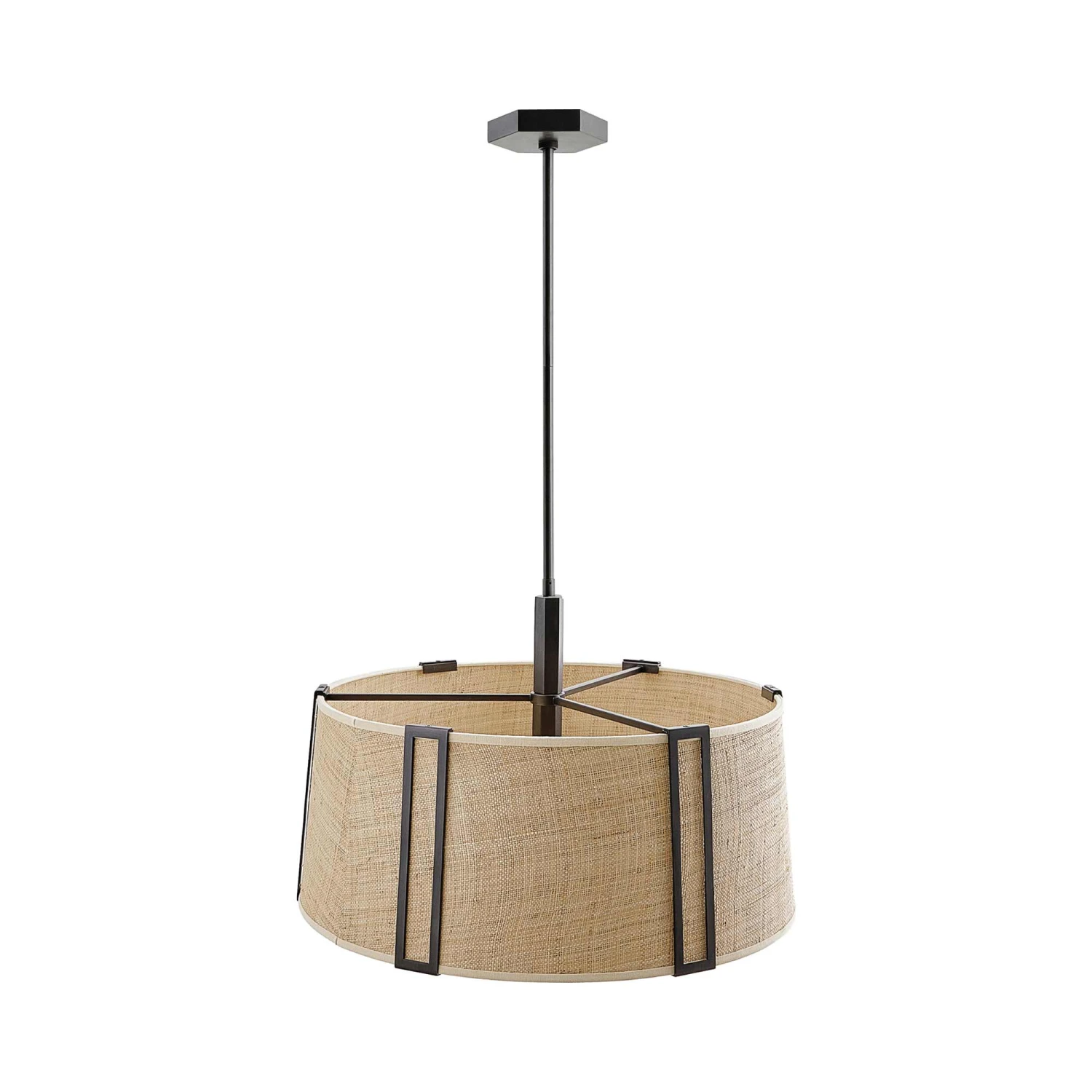 Earthy, natural charm appears in finishes and design elements in a light fixture with a mix of modern and industrial flavor. Metal framing and matching accents add a path to style as the Amida Chandelier from Arteriors softens the mood in a kitchen, dining room, or foyer, emulating an easy feel with natural grasscloth creating a tapered drum shade.