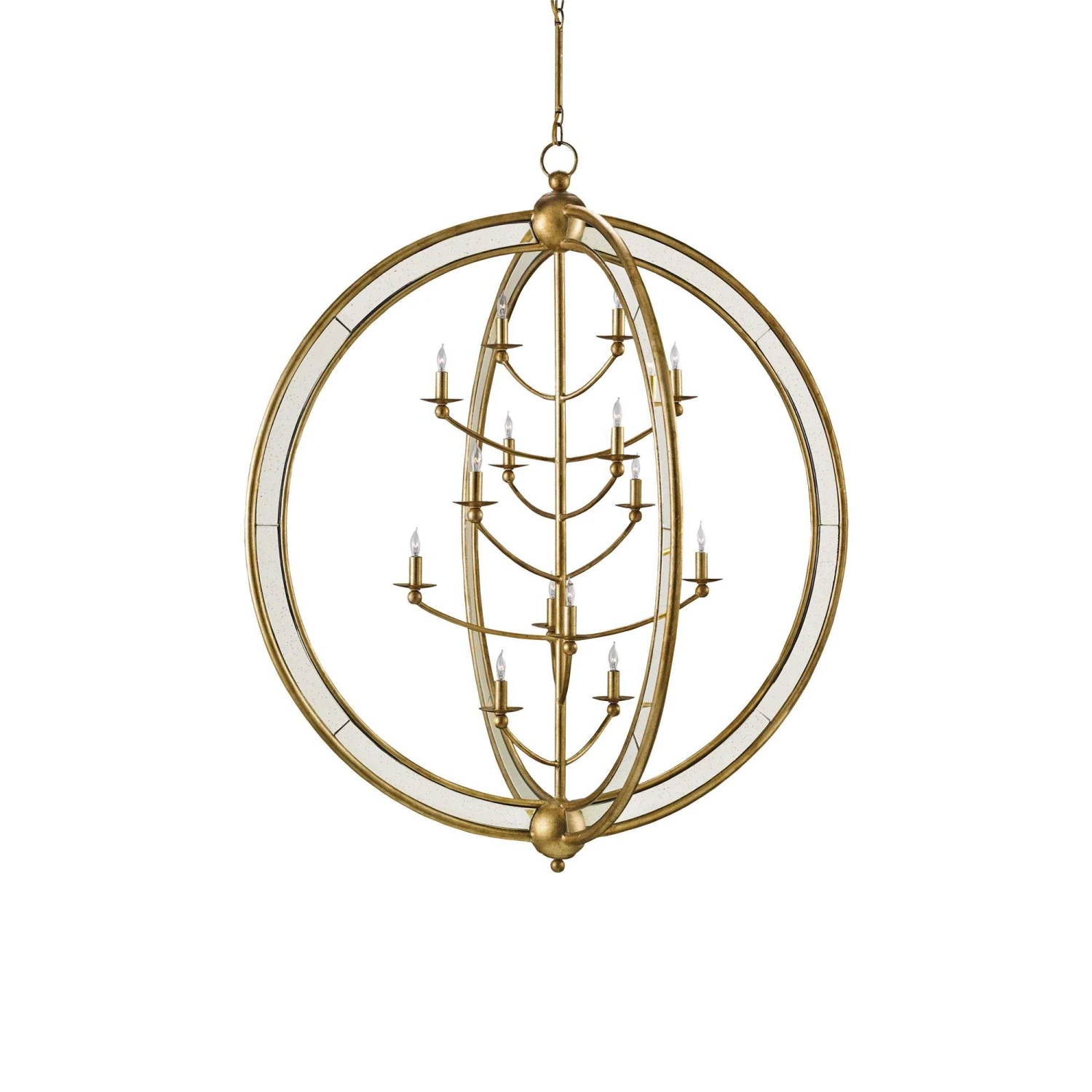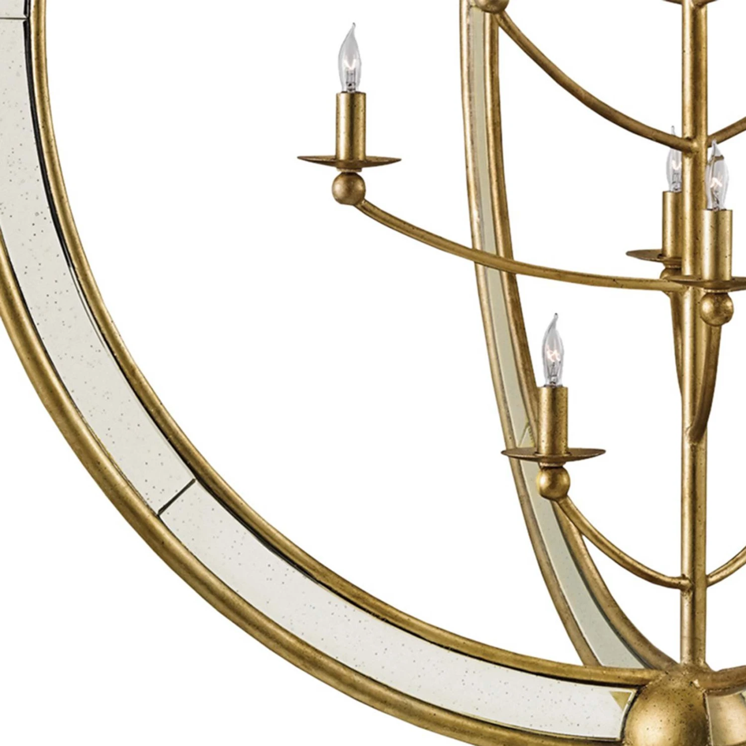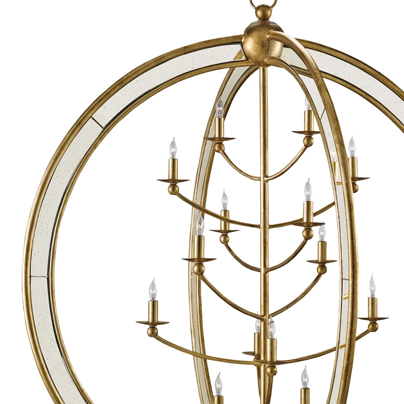 Showcasing an abundance of detail, the Aphrodite Orb Chandelier from Currey and Company creates a luscious mix of Art Deco and fully contemporary design motifs. Metalwork is essential to its configuration of an open ring with metal edging and antique mirror panels, and a smaller ring intersecting. Delicate candelabra lights stem off of gracefully curved arms, part of the gallery inspired aesthetic that will lift the mood.