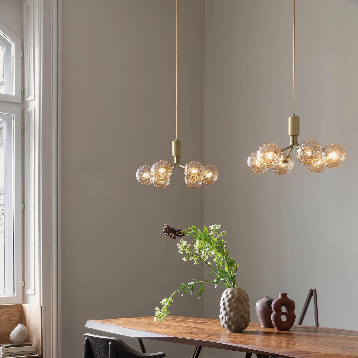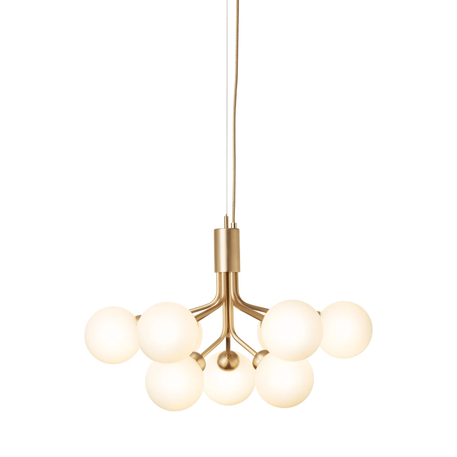 Cheerful design elements form a self-sustaining Art Deco feel in a light fixture supplying no shortage of charm. The Apiales Chandelier from Nuura celebrates conventional metal framing, adjusting its silhouette for symmetry and angles. Glass orbs radiate with ambient lighting as they take on a pearl-like vibe.