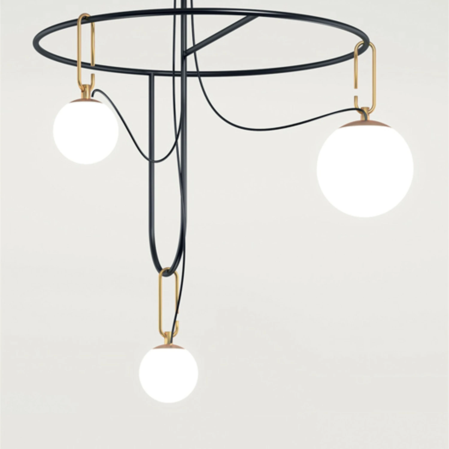 Glowing white blown glass globes suspend dramatically from the NH S4 Circular LED Suspension Light from Artemide, offering a minimalist-leaning retro expression that elevates interiors instantly. Energy-efficient LED lighting and revealing wires lend a modernized aesthetic to this stunning suspension chandelier.