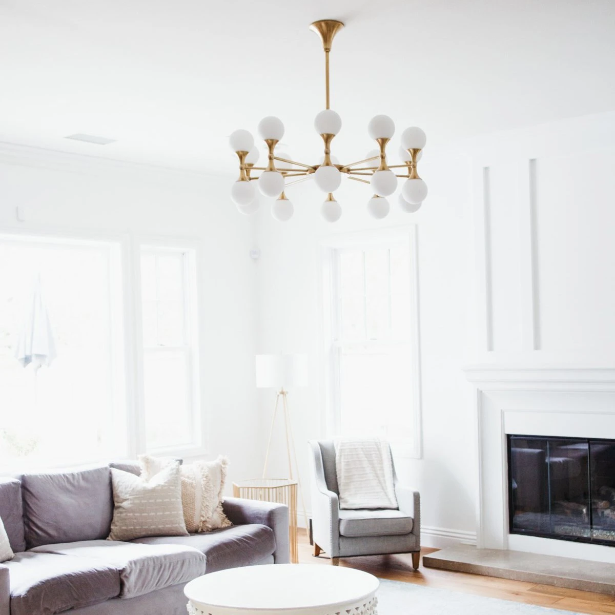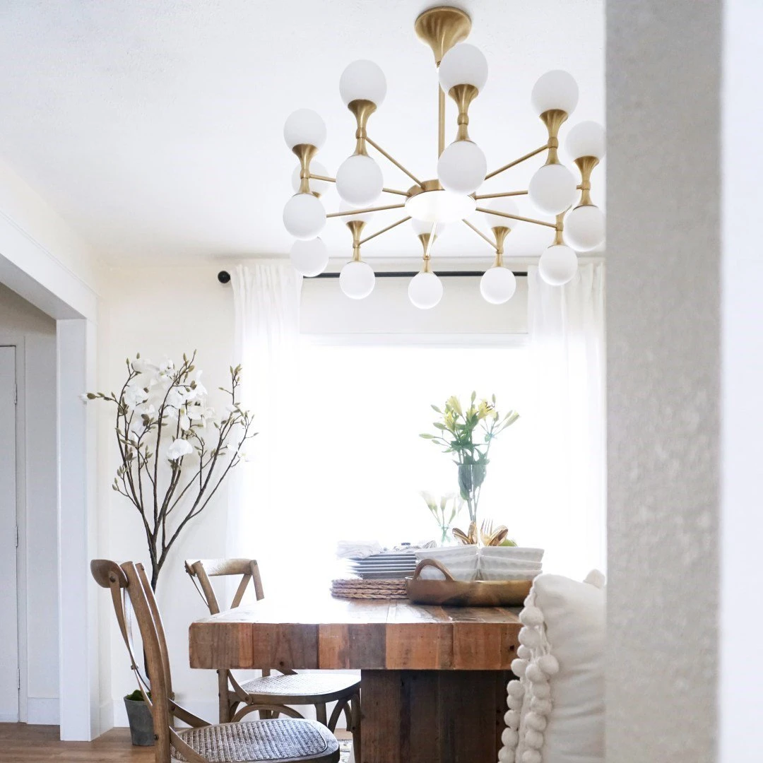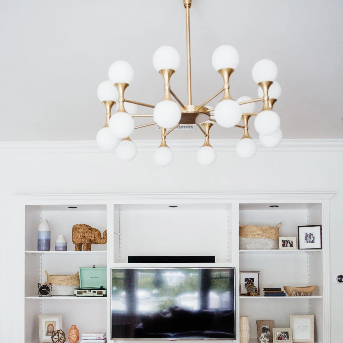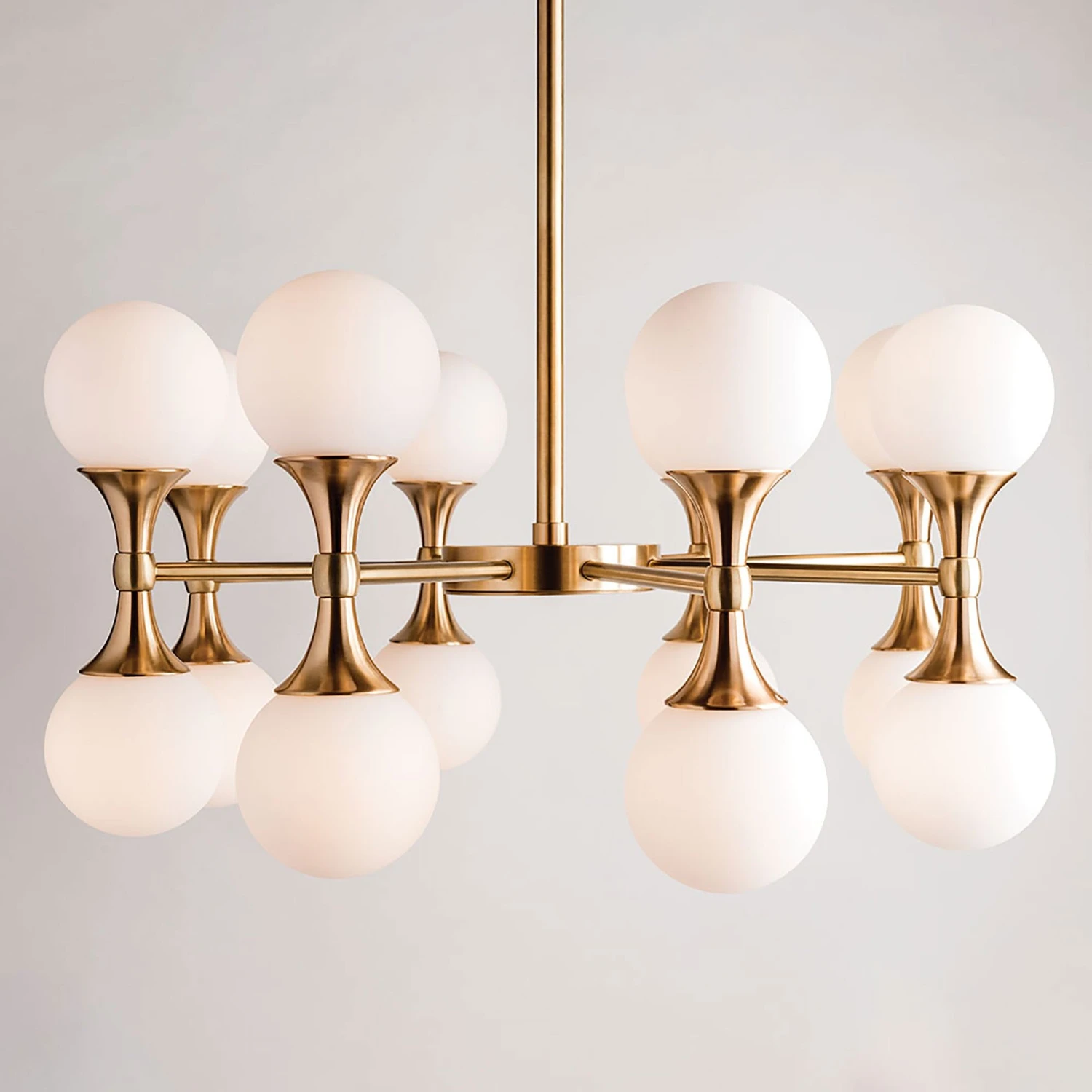 Delight in simplicity and symmetry in our Astoria family. Bubbles of light balance on and balloon forth from trumpets of cast metal. Opal-etched glass diffusers poise in balanced rows, above and below, along a wheel of light, concealing warm, dimmable LED bulbs.