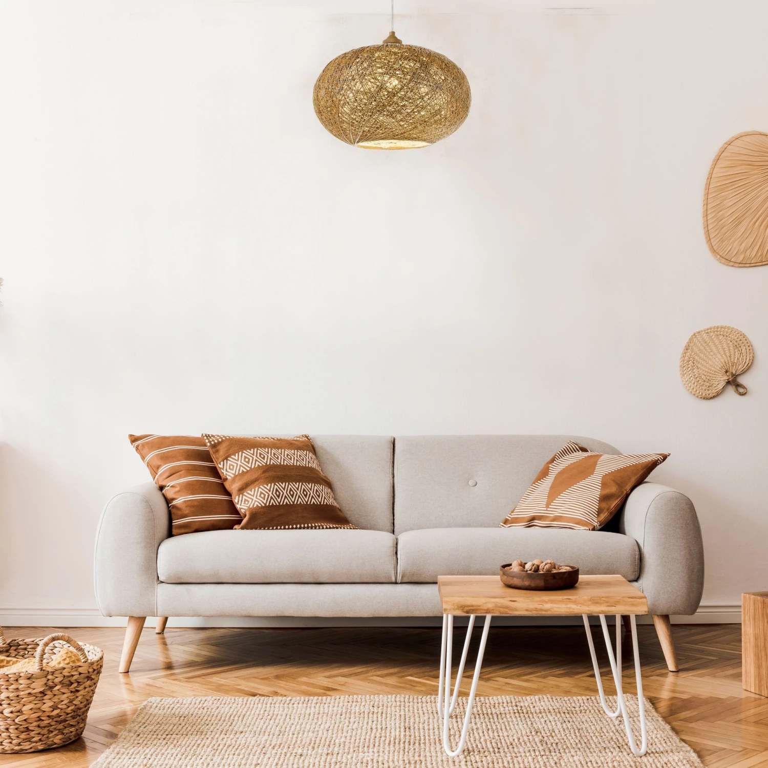 Spherical dual shades constructed of woven string in two tone finish combinations, Natural with White inner and Chocolate with White inner. Shades are treated for weather resistance and are U.L. approved for damp location which make them perfect for outdoor living spaces.