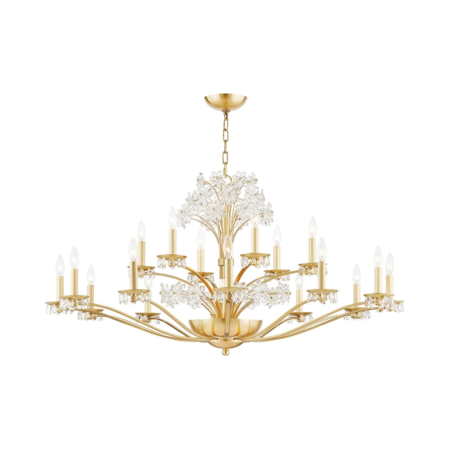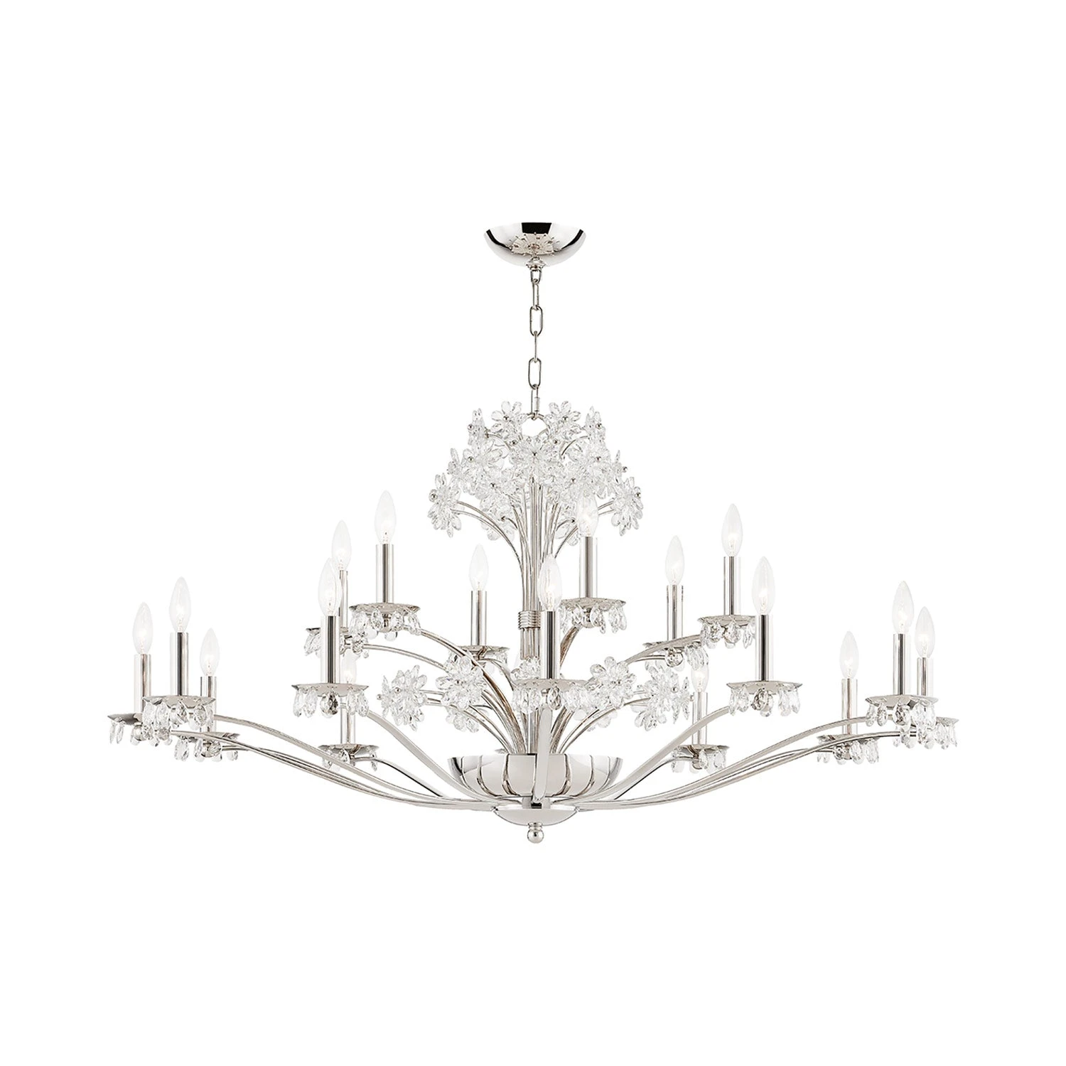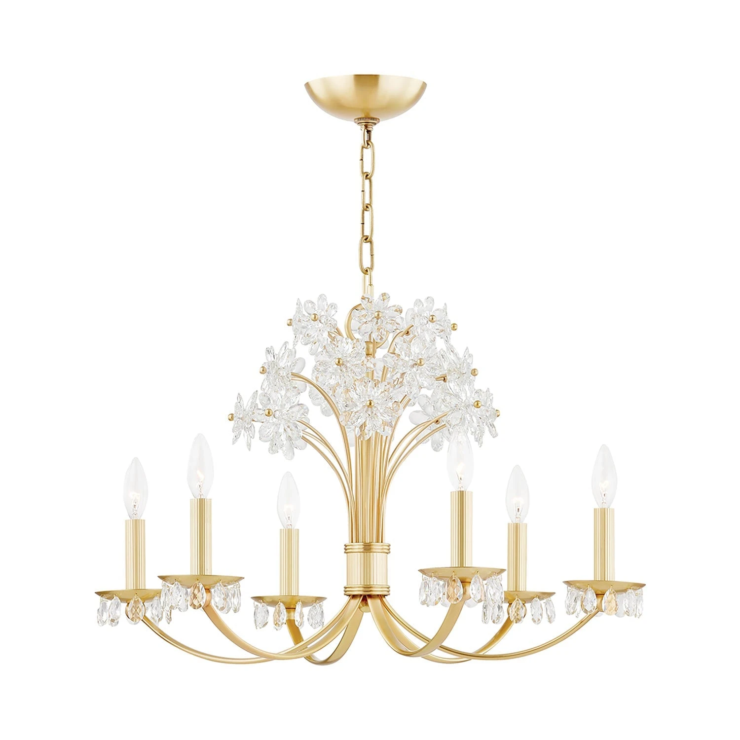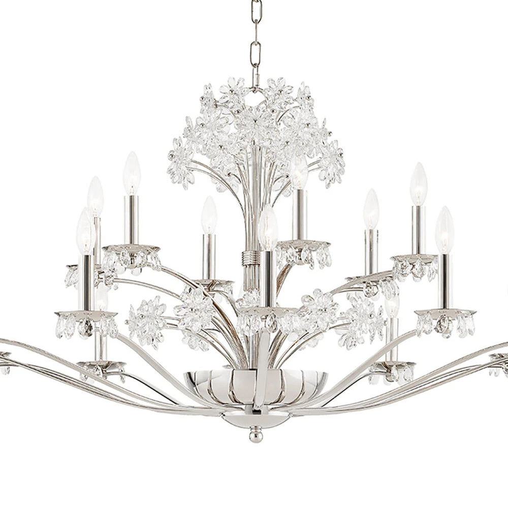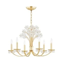 A touch of floral splendor indulges in a botanical motif as the Beaumont Chandelier from Hudson Valley Lighting delivers a delicate form of glam. Symmetry is key in this fixture fashioned of gleaming metal, with curved arms and candelabra mounts complementing a sprig of glass petal emblems creating a virtual bouquet. The mix of glass and illumination offers an incredible lighting effect.