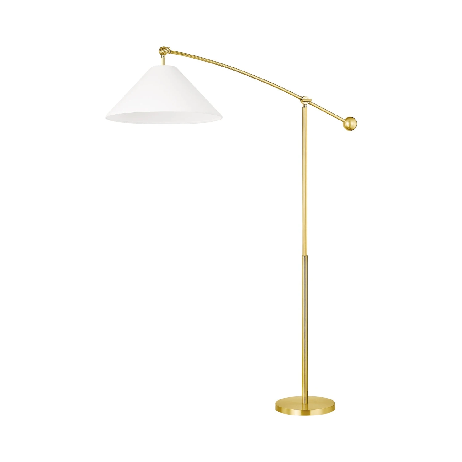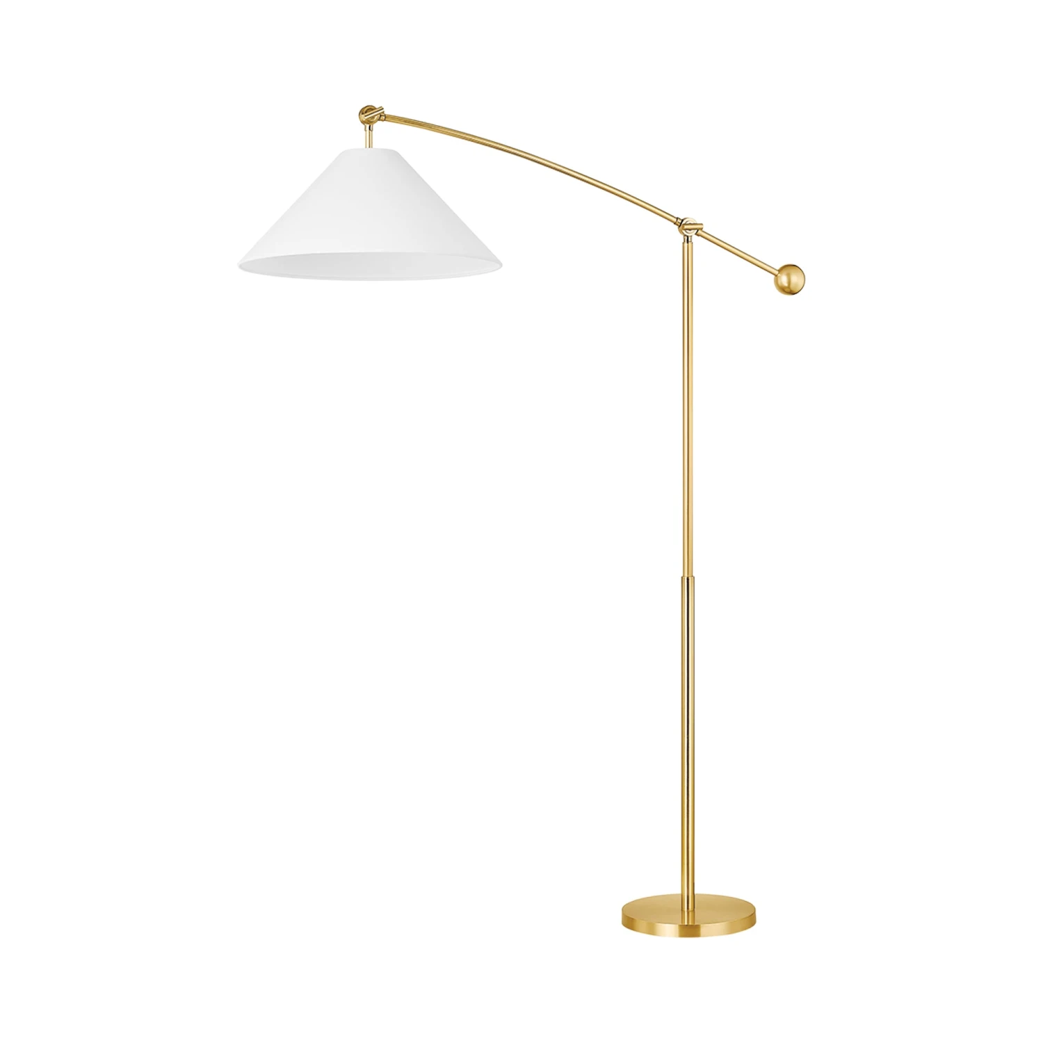 The Birdie Floor Lamp from Mitzi takes its cue from classic conventional lighting, adding updated elements to enrich its delicate look. Asymmetry is key in a lamp with a weighted arm capped with a dangling linen shade, and aged brass finish metal framing creating certain warmth. Adjustable light settings set up a customized flow of illumination.