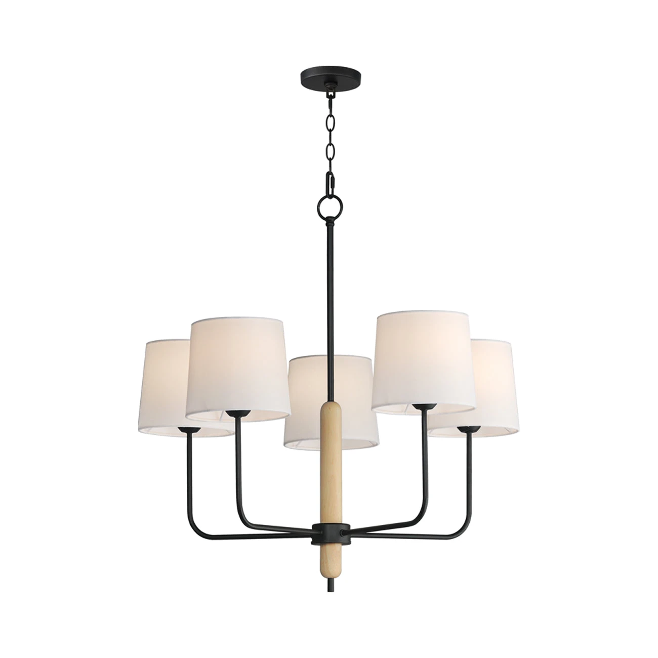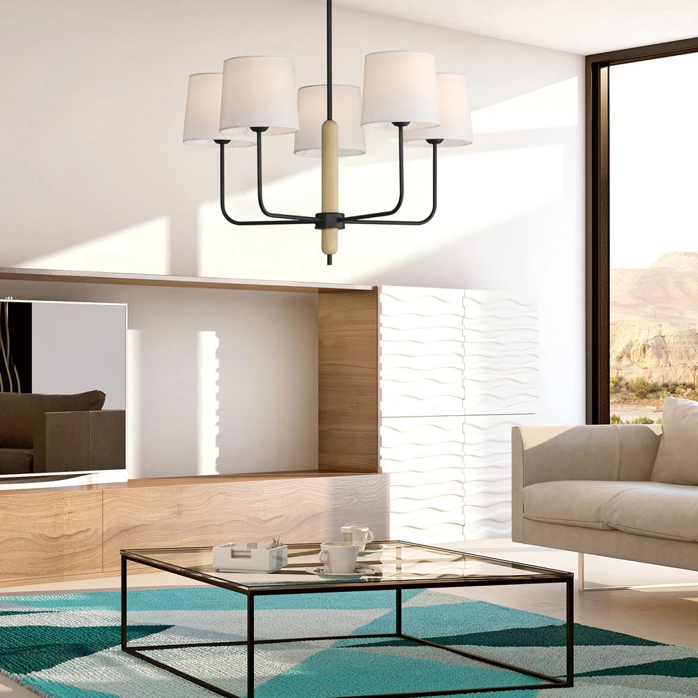 An elegant design with softening elements creates a winning look for illuminating dining spaces and foyers. We love the silhouetting and neutrality brought by the Bozeman Chandelier Bozeman Chandelier from Maxim Lighting and its uplifting style, beginning with matte black metal framing and tubular natural white oak elements. Symmetry shows up in the arrangement of angled arms topped with petite linen shades, adding options of placement in farmhouse and industrial venues.