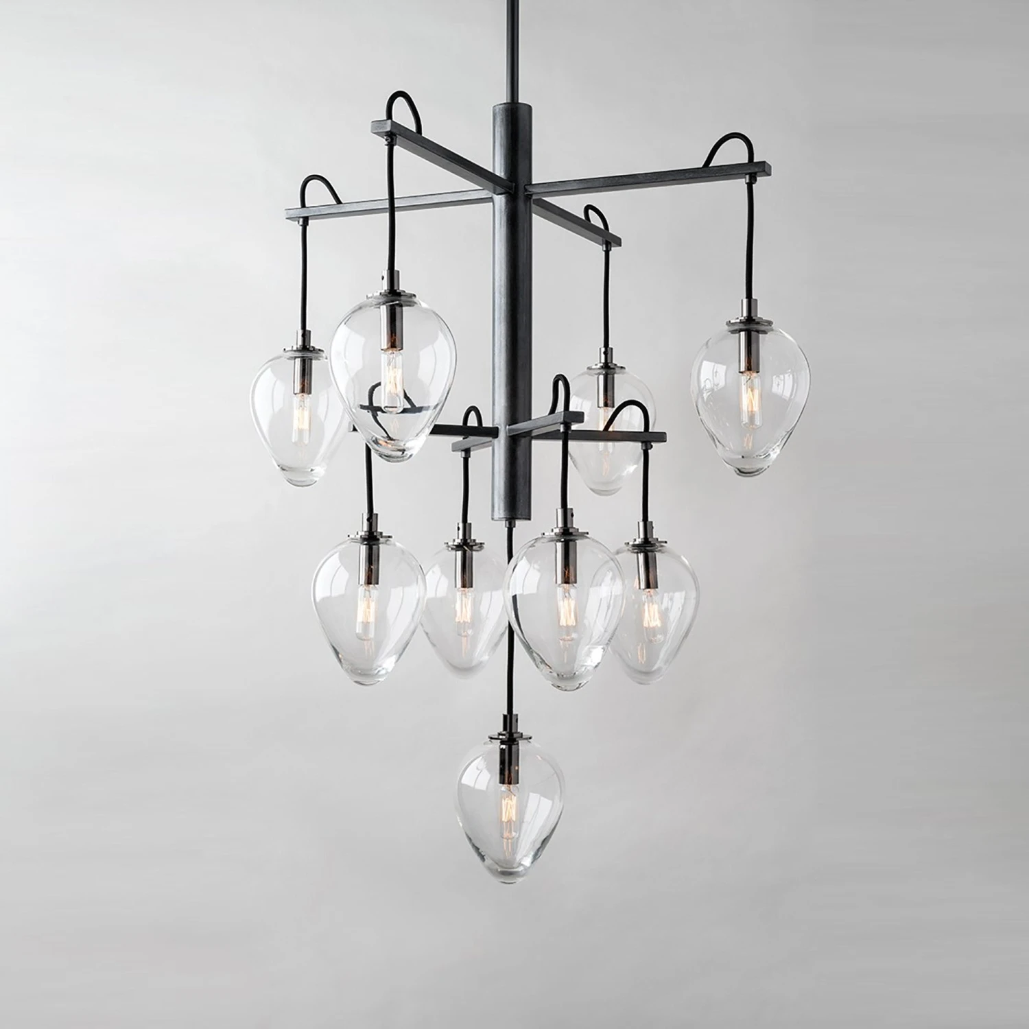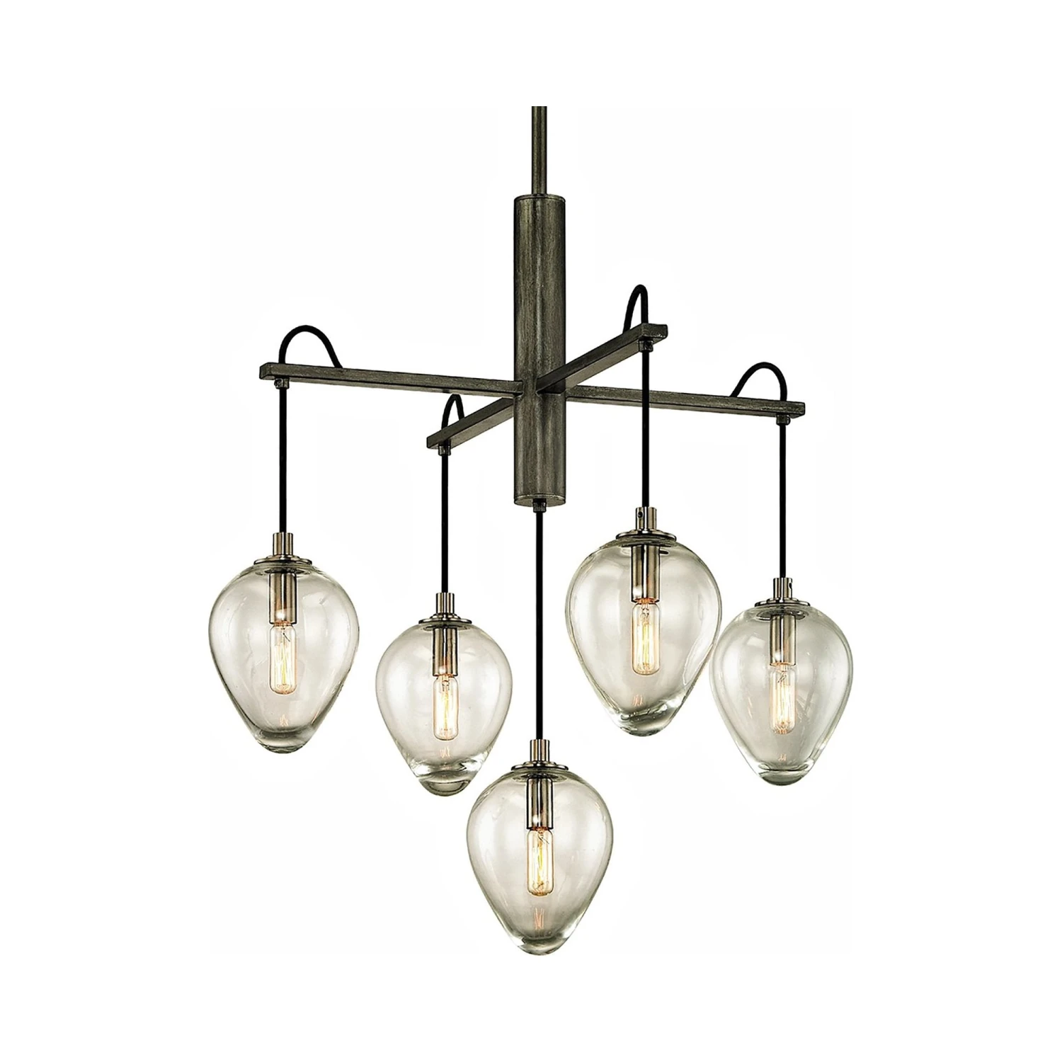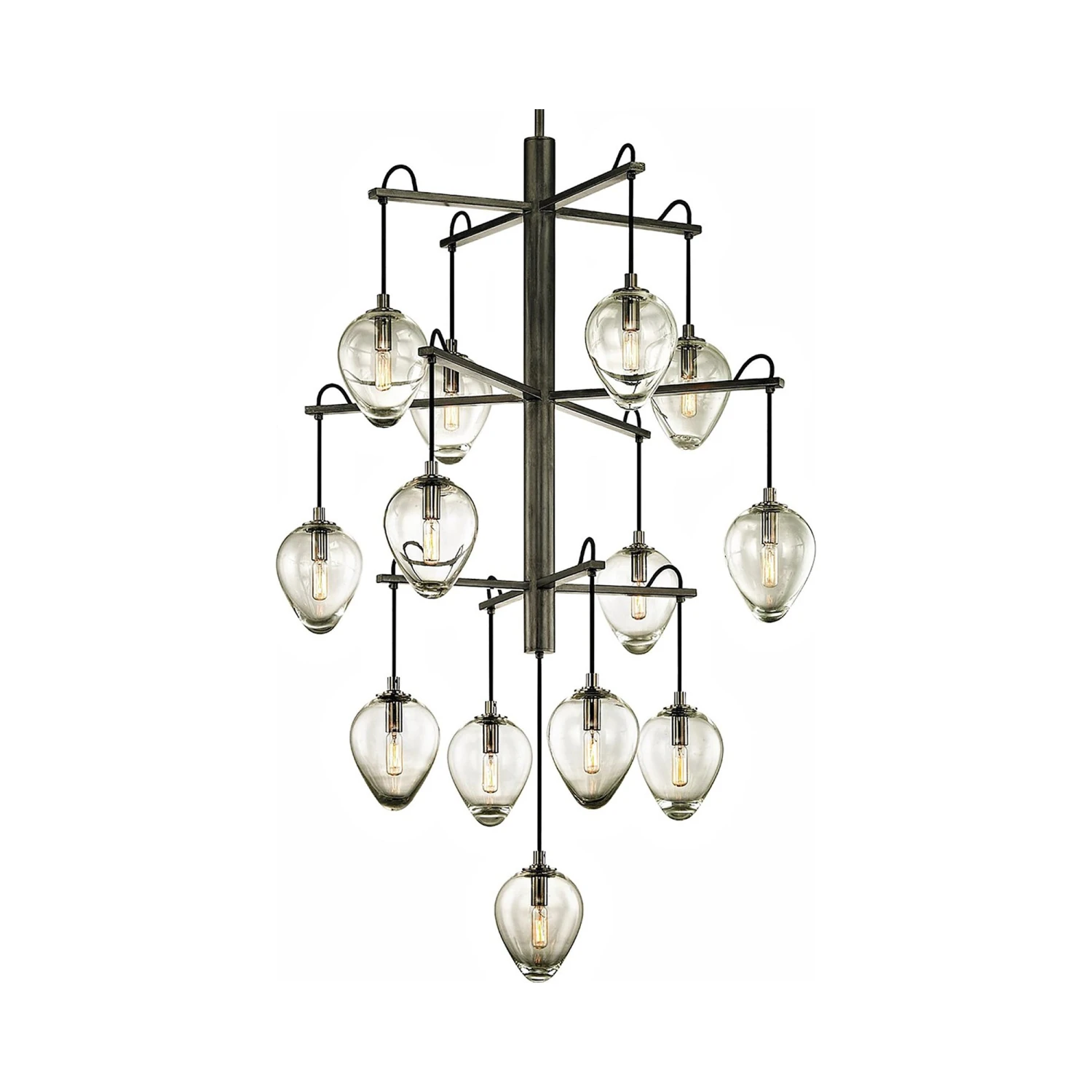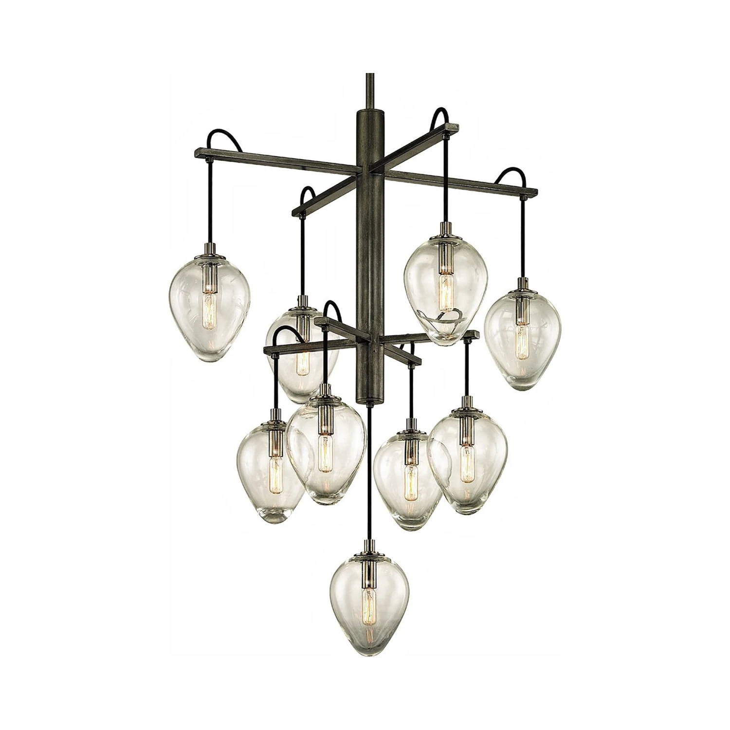 Carefully styled to add an artistic feel to a custom space, the Brixton Chandelier from Troy Lighting features a linear perpendicular frame fashioned of gunmetal finish metal with smoked chrome accents and sleek, delicate clear glass diffusers, becoming a focal point in a dining or living room.