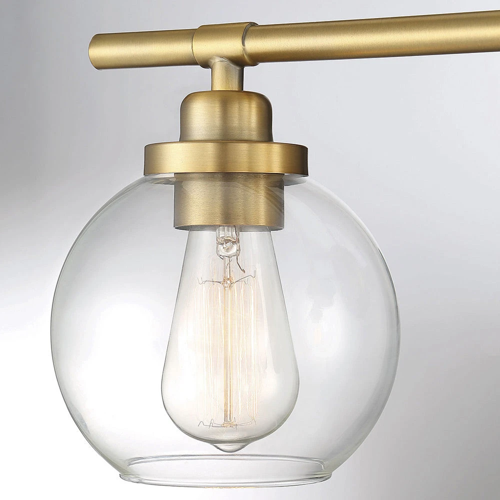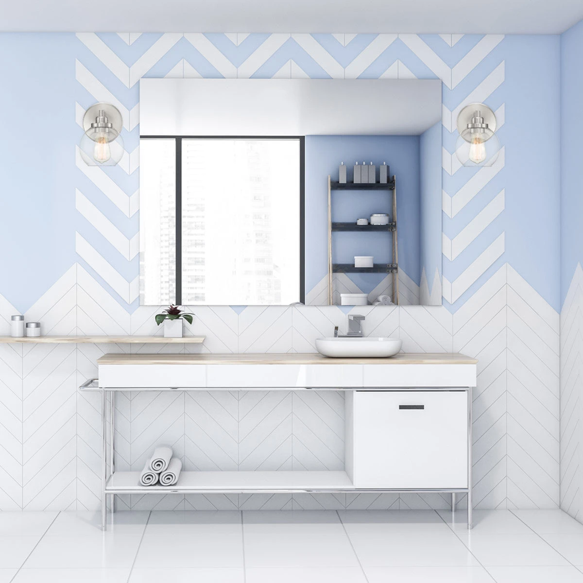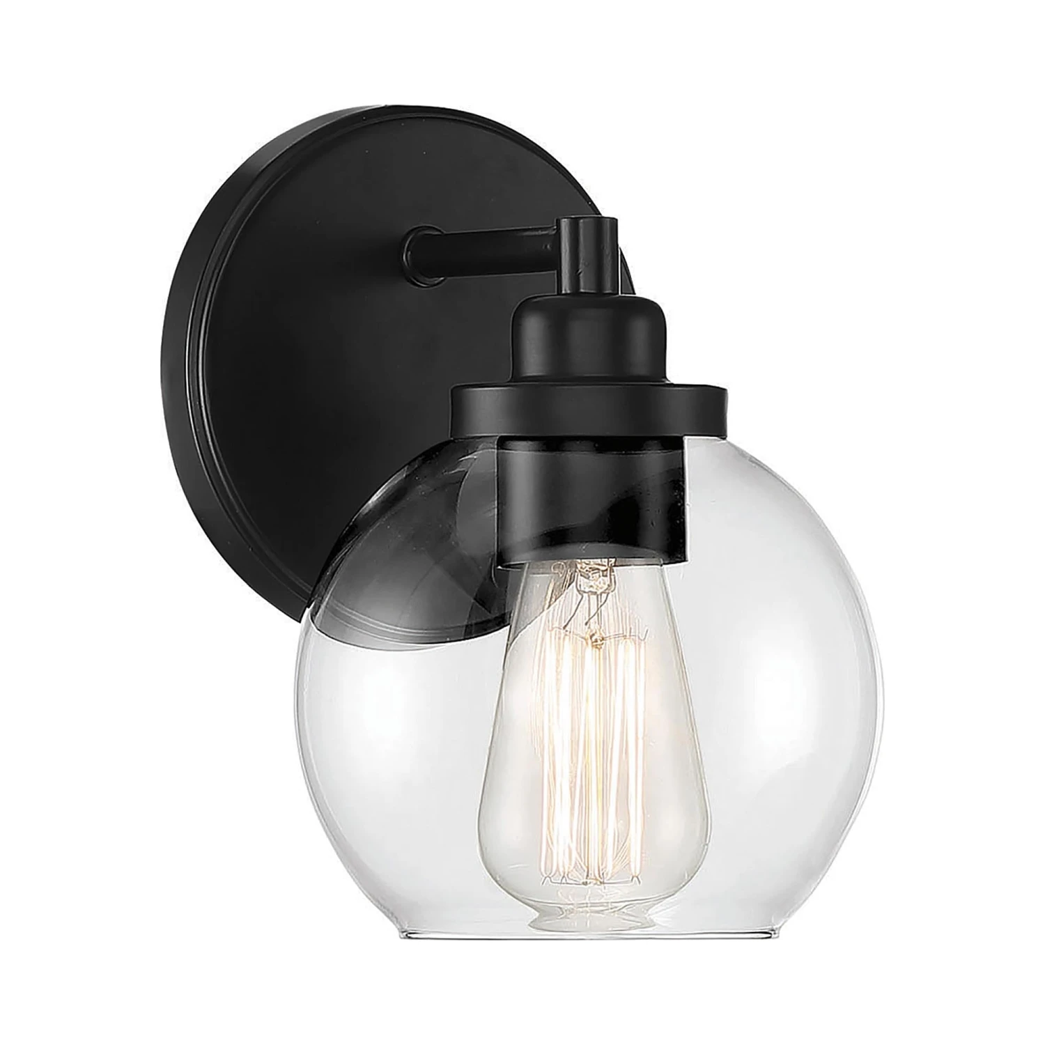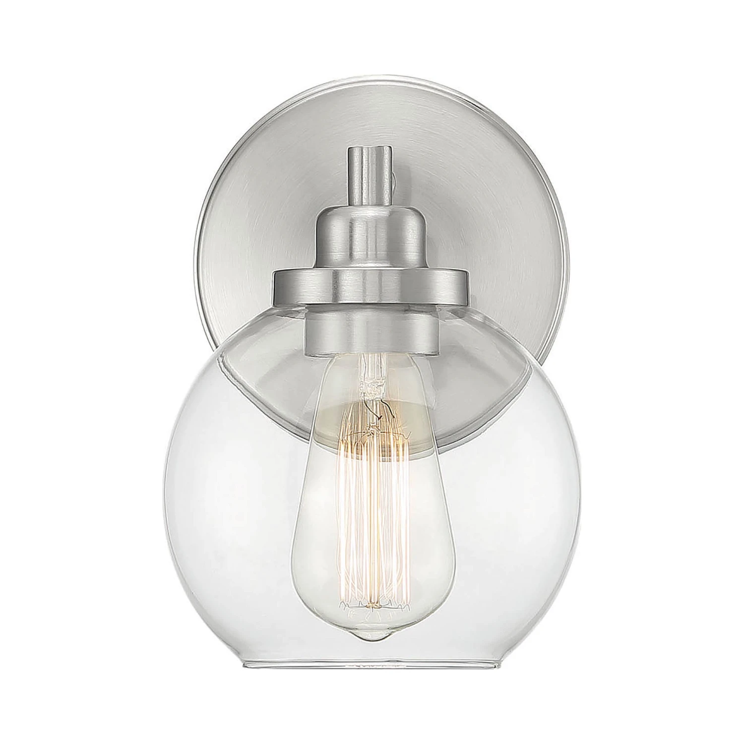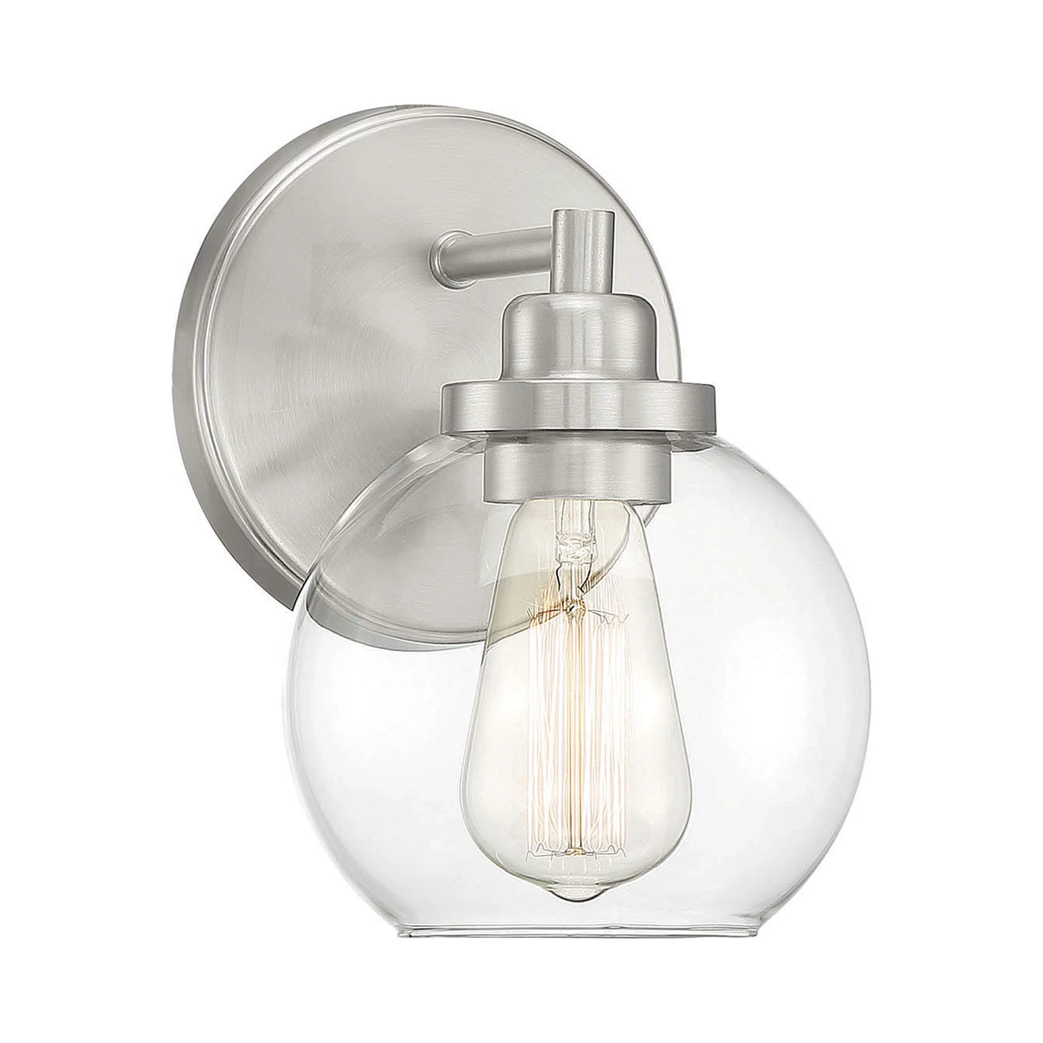 Classic elegance with a familiar style is nonetheless stylish and inviting as a source of light for an ensuite or guest bath. The Carson Bath Wall Light from Savoy House embraces basic shaping with a circular metal wall mount and industrial-inspired metal accents. An open globe shade radiates from the sparkle of clear glass, offering a tasteful way to complete a custom setting.