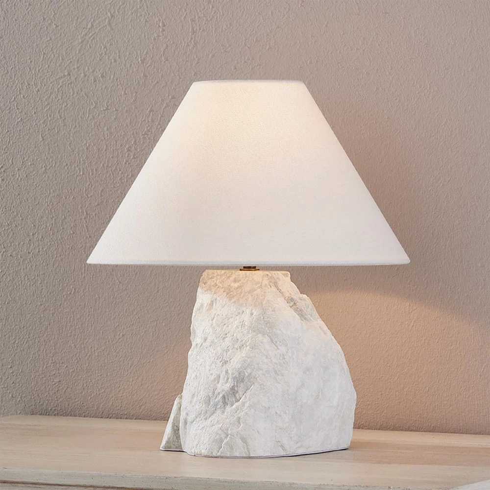Edgy natural design creds tempt the daring to expand aesthetic consideration when the Carver Table Lamp from Troy Lighting lands in a casual or semi-formal space. Feast your eyes on a gritty boulder silhouette shaping the stone finish of a complicated yet extraordinary composition. Topped with a coordinating white linen shade, this lamp delivers on the promise of raw, earthy elegance.