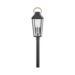 Clean lines hint at a sleek modern motif creating a tasteful exterior fixture in the Casway Outdoor Post Light from The Great Outdoors. Custom landscaped settings and walkways deserve stylish highlighting, and this post light delivers with a boxy lantern-inspired frame fashioned of oil rubbed bronze metal with soft gold highlights. A multi-light candelabra-style bulb socket with gold accenting expands its rustic yet contemporary palette.