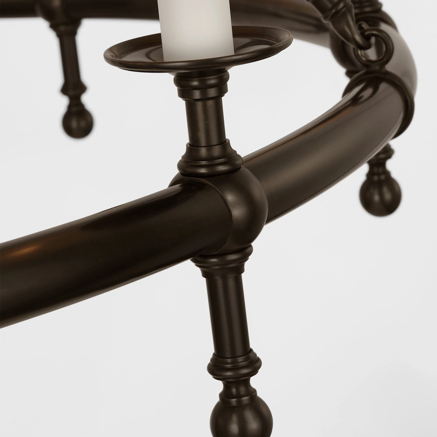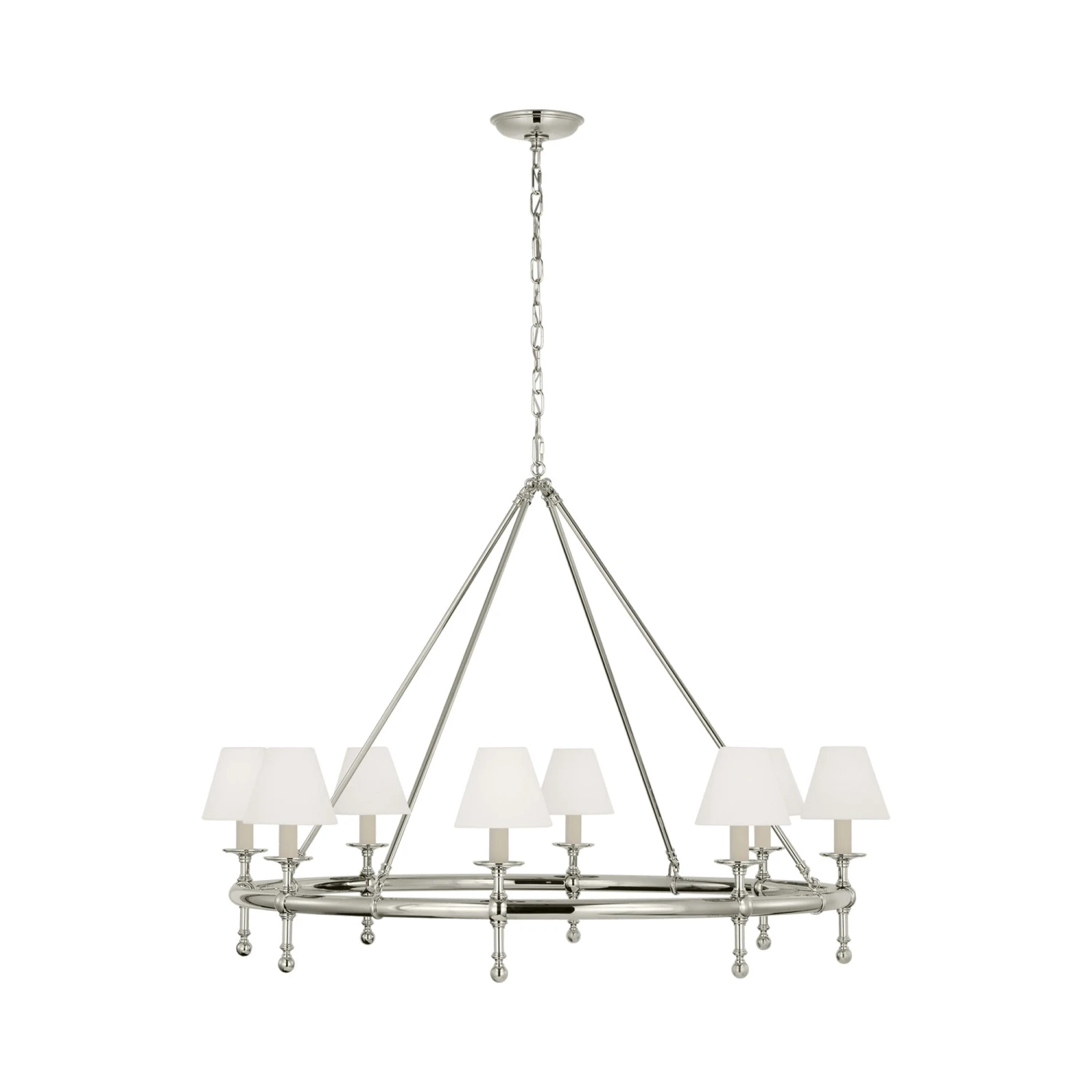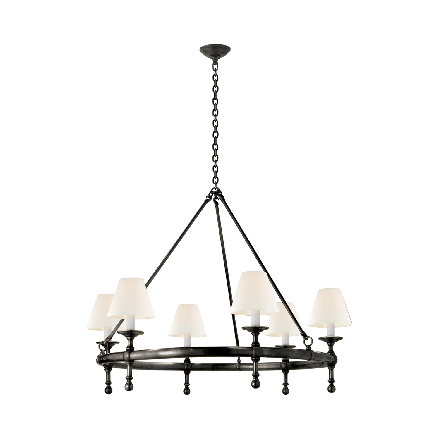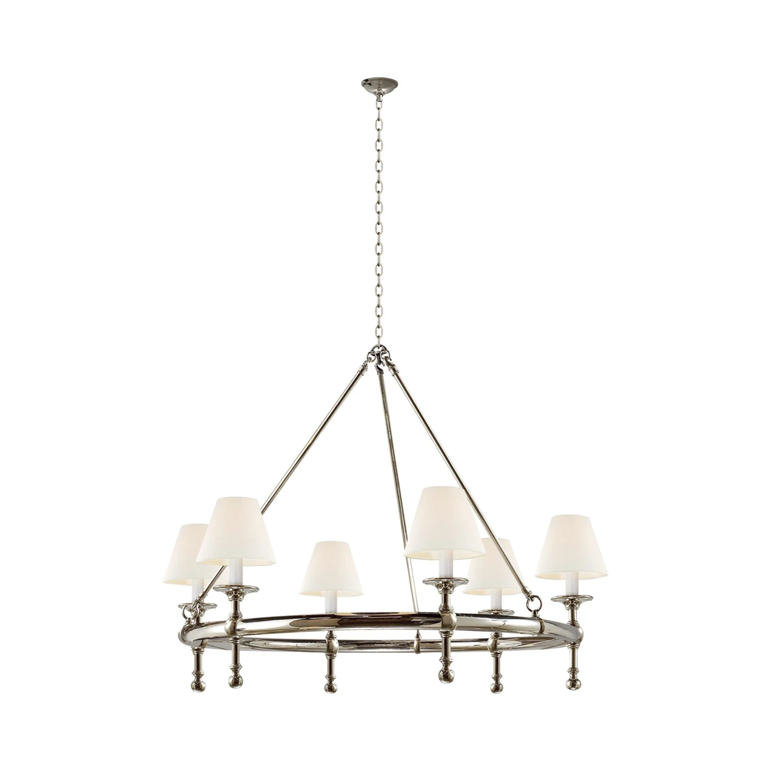 A signature design statement follows as the Classic Ring Chandelier from Visual Comfort Signature adds its bold personality mixed with soft traditional elements. Highlight and illuminate dining ensembles, living rooms, and foyers with a standout fixture delivering tempting traditional shaded lamps in a circular fashion, as intricately turned metal stems balance gritty industrial cabling.