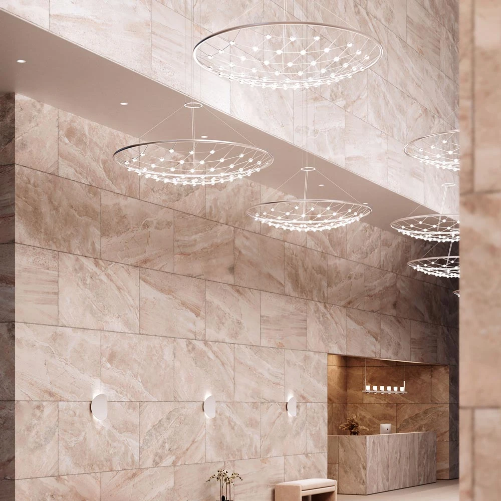 Glowing LED lights are studding within the diamond mesh that enchants the Constellation® Galaxy Matrix Round LED Pendant Light from Sonneman. Simply stunning over a sitting area or sophisticated dining table, the pendant pairs a ring frame with an airy woven mesh to create a look that’s both modern and accessible.