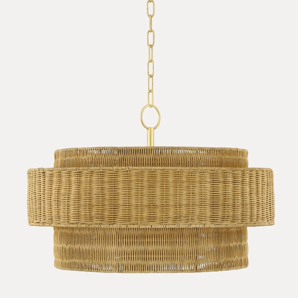 The wispy lightness of nature and coastal influence transforms a casual space as the Danica Pendant Light from Mitzi leaves behind easy elegance in its wake. Layering of cylinder shapes fashioned from wicker invokes a hint of geometric simplicity, with a delicate aged brass metal chain keeping focus on the island influence this pendant embodies.
