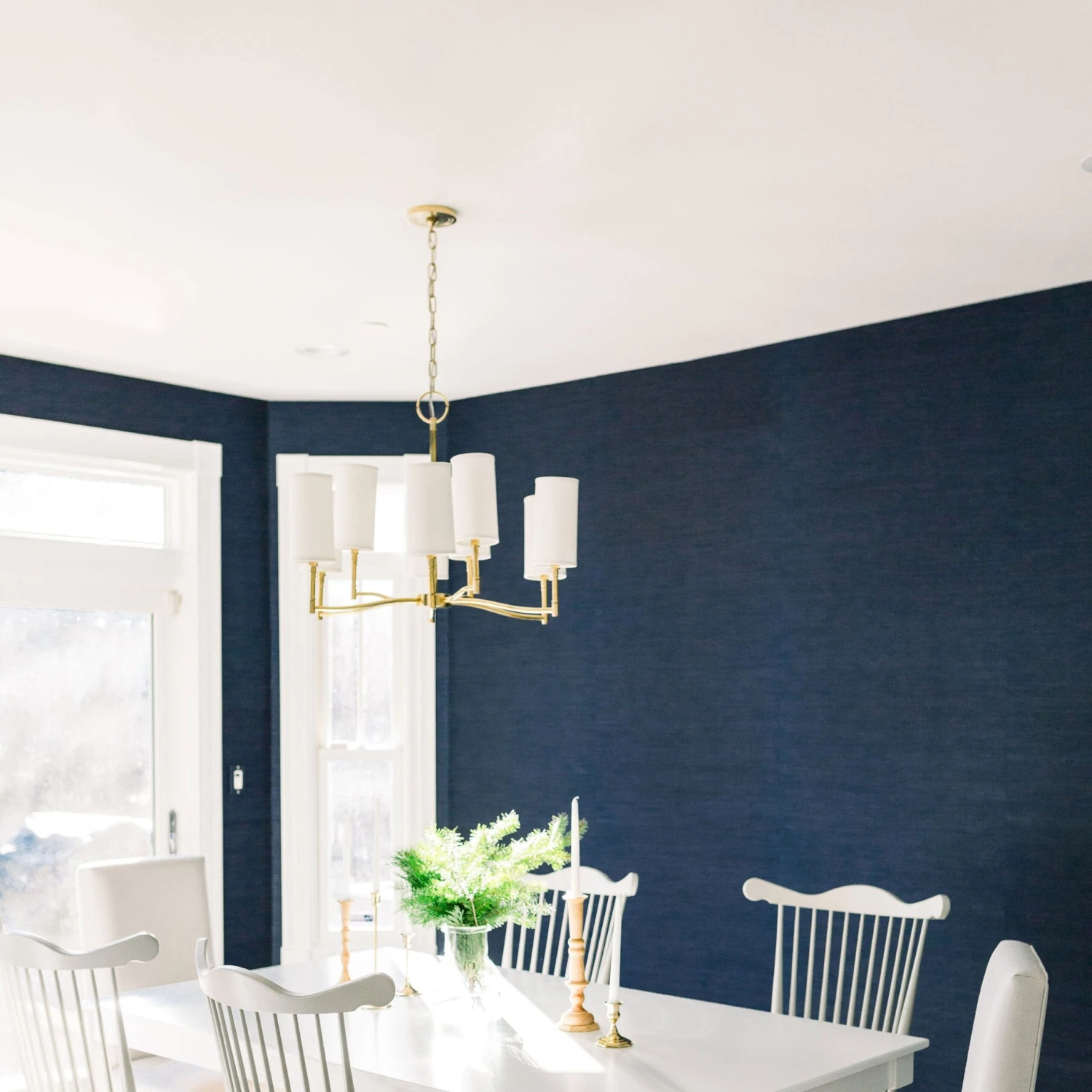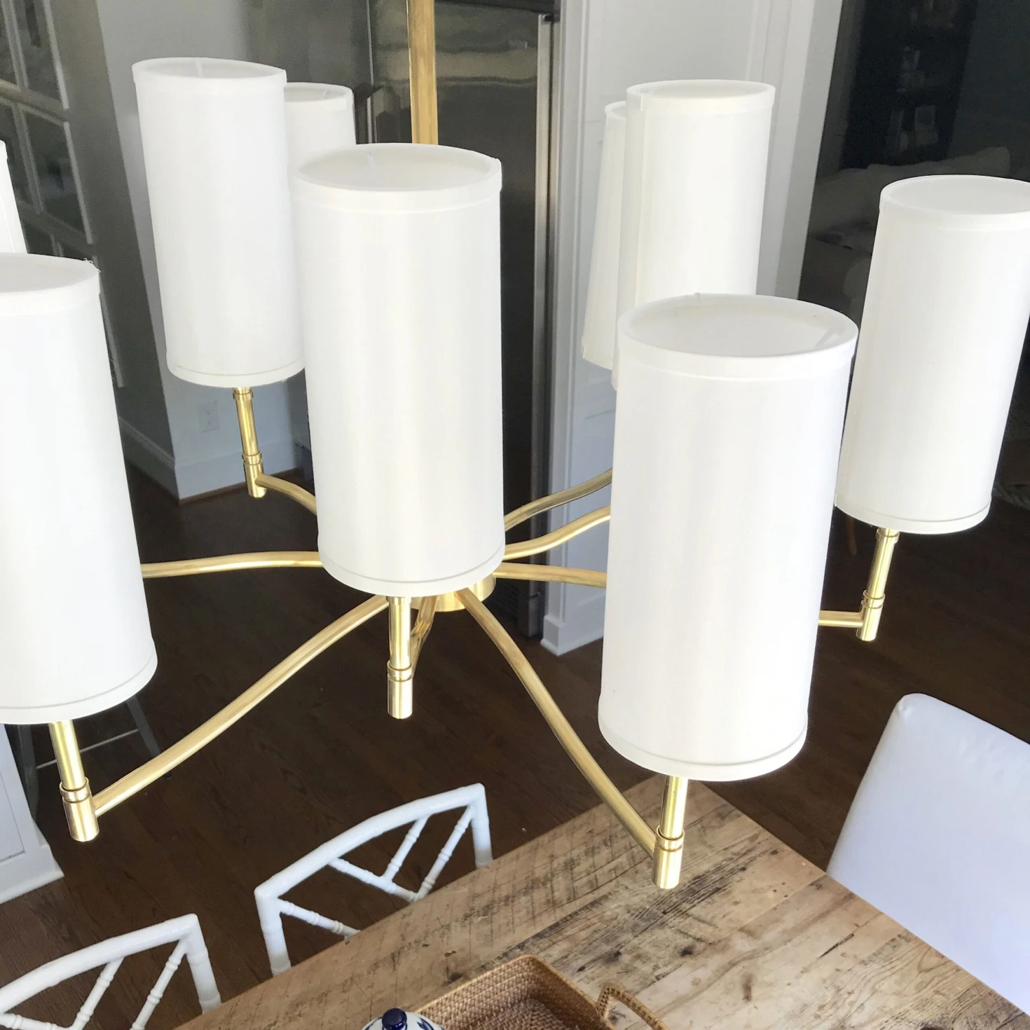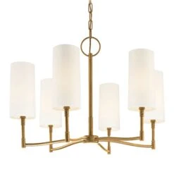 Modeled off the basic idea of the curved-arm chandelier, Dillon’s arms are gently undulating waves bearing candle sticks. Long, cylindrical silky shades add a sense of visual weight to Dillon’s slight frame. Restrained stepping unifies the airy transitional fixture. Wall sconce versions create an opportunity to match while making a fine addition to any space on their own.