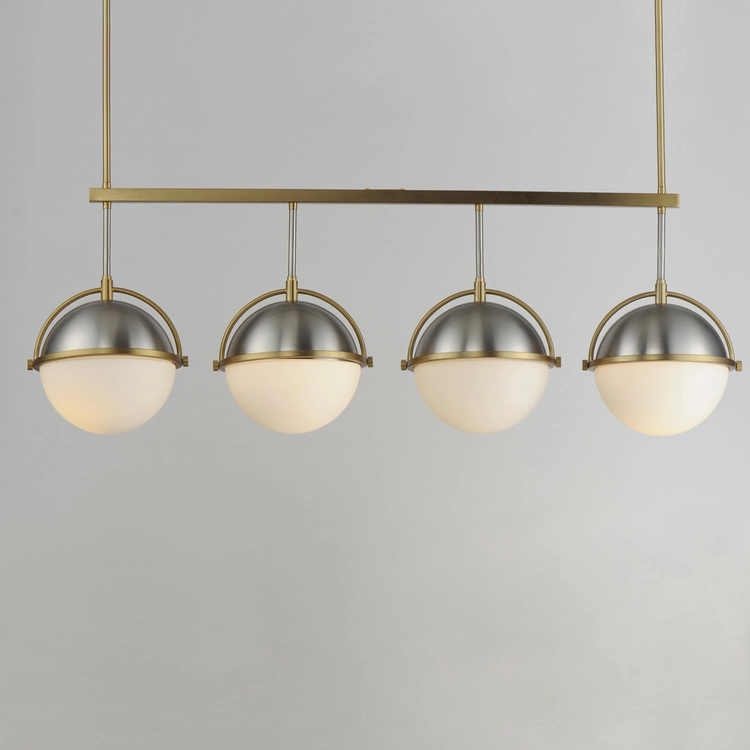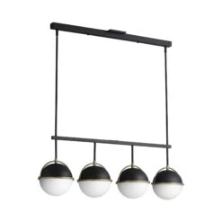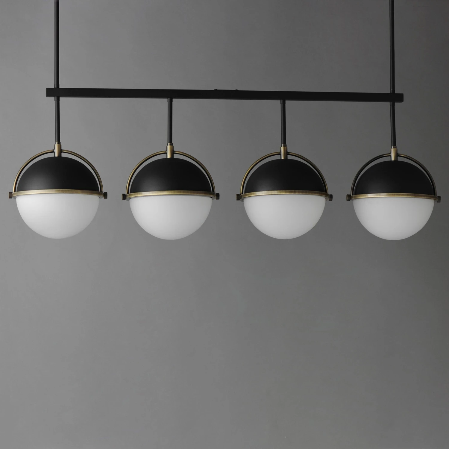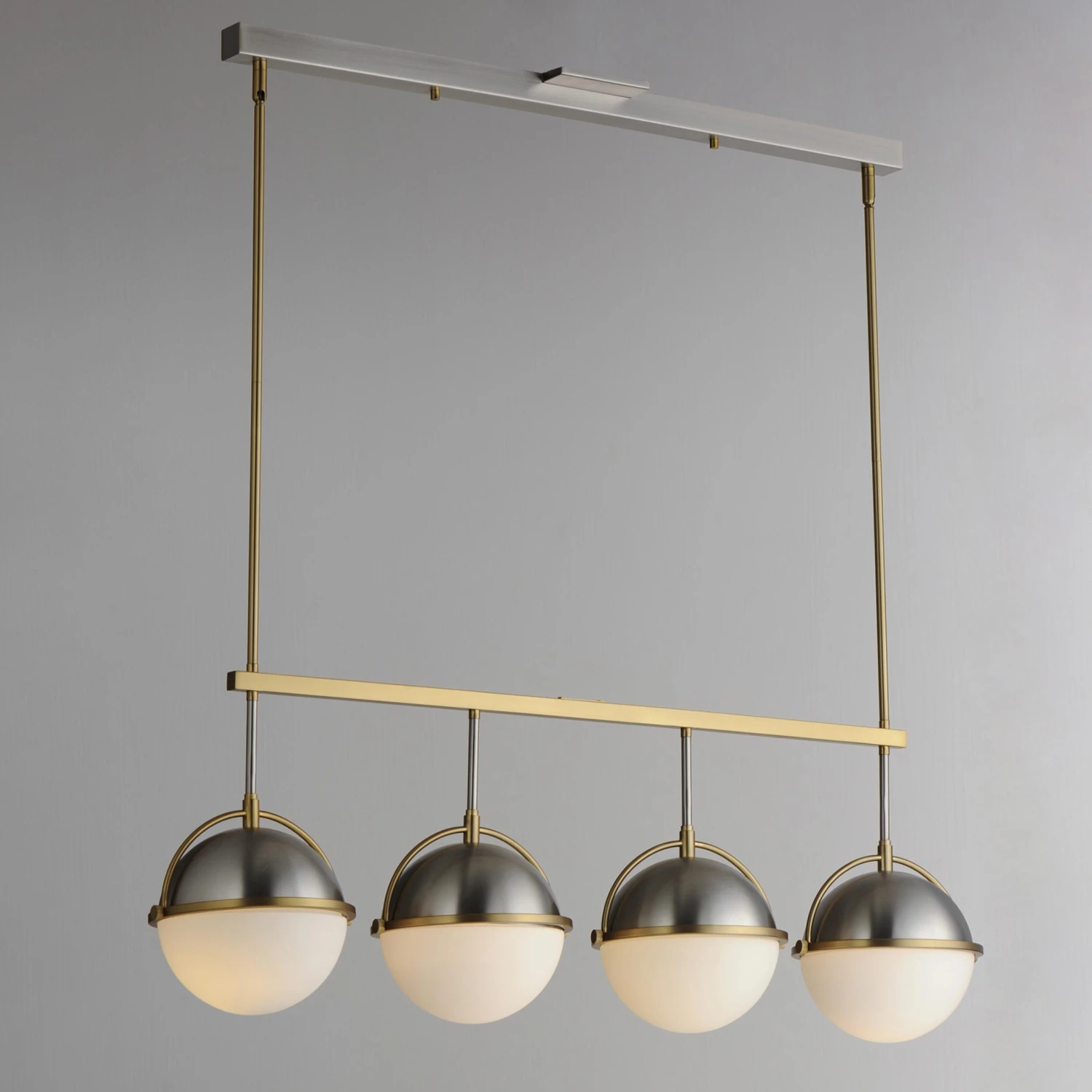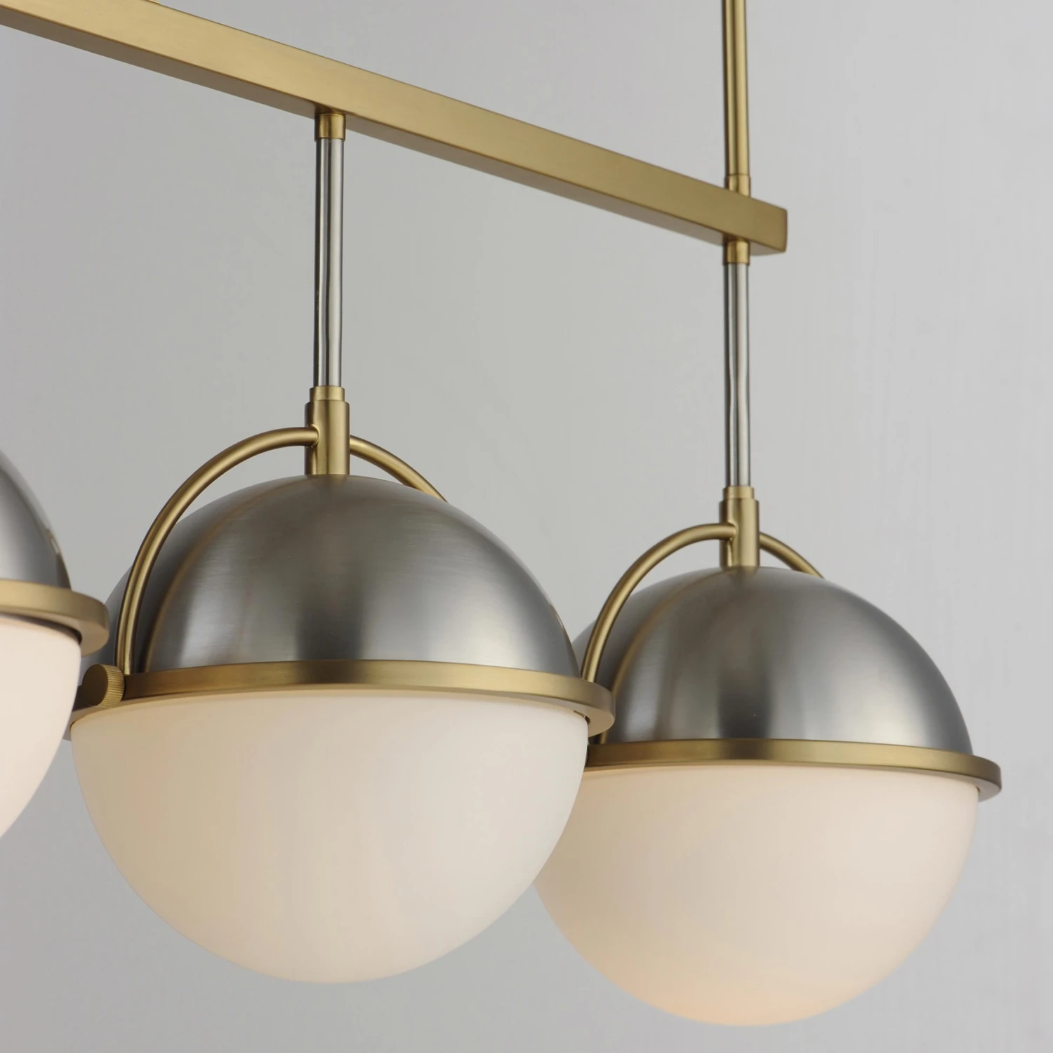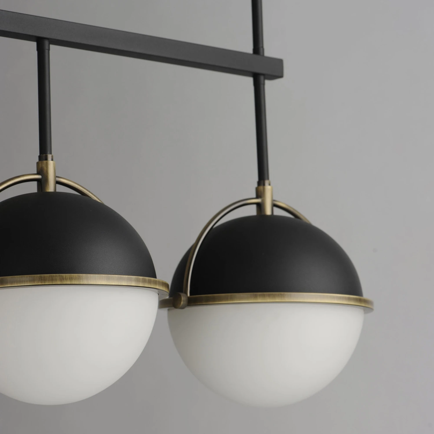Fashionable iteration of both linear and circular elements define the Duke Linear Pendant Light from Maxim Lighting. Dip into a retro version of industrial and deco influence with a multi-light fixture perfect for islands and other horizontally oriented spaces. Whimsical glass globes with half-dome steel holders are accented with subtle arcs and slender trim, adding a nautical aesthetic.