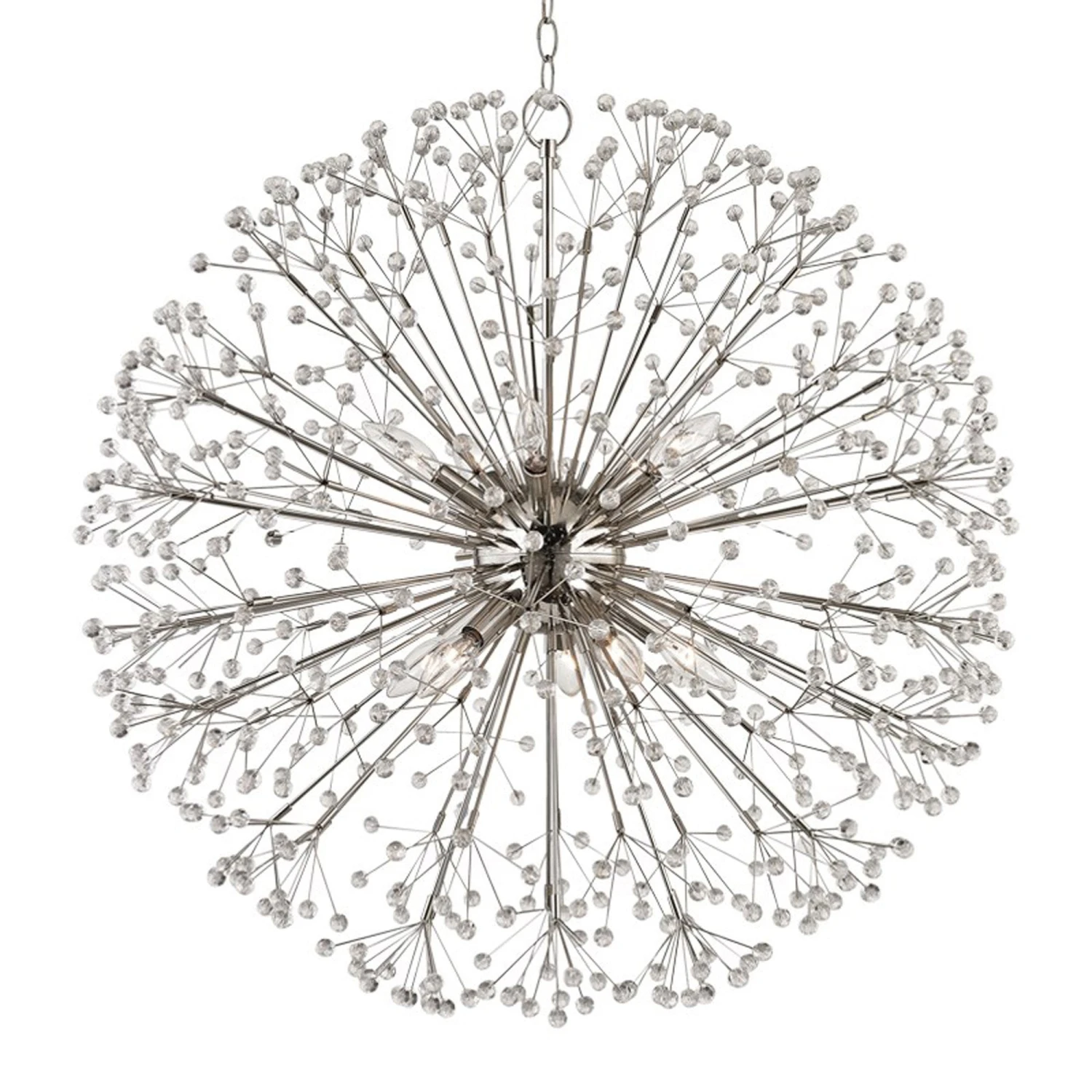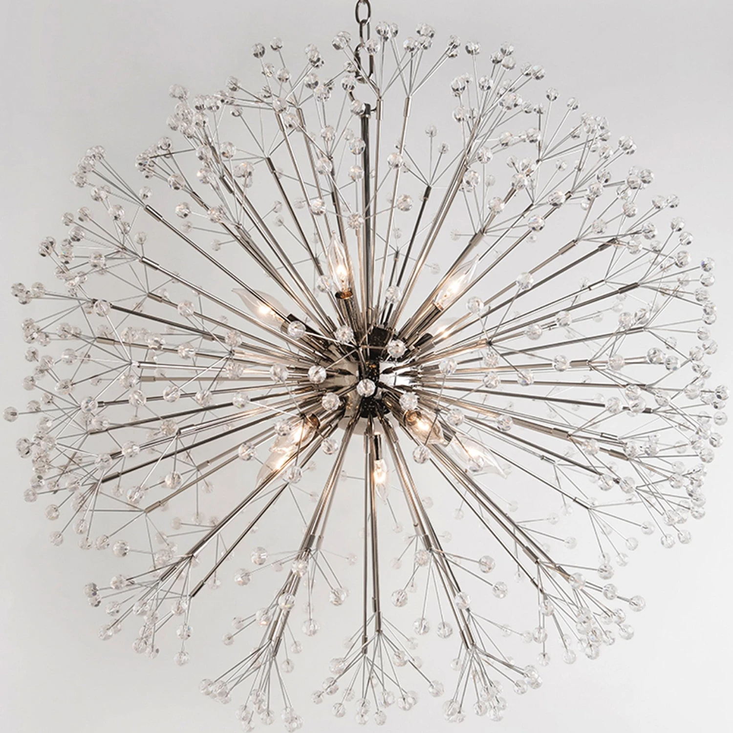 The earthly and the extraterrestrial combine in this beautiful, branching family. Faceted crystal spheres bedazzle at the end of every branch, luminously refracting the light. Like a star being born, Dunkirk is at once organic and out of this world. When Sarfatti designed the first chandelier that launched the Sputnik-style craze, it had been fireworks he was trying to emulate. There is something both of the firework exploding and the fixtures Sarfatti inspired in this opulent piece.