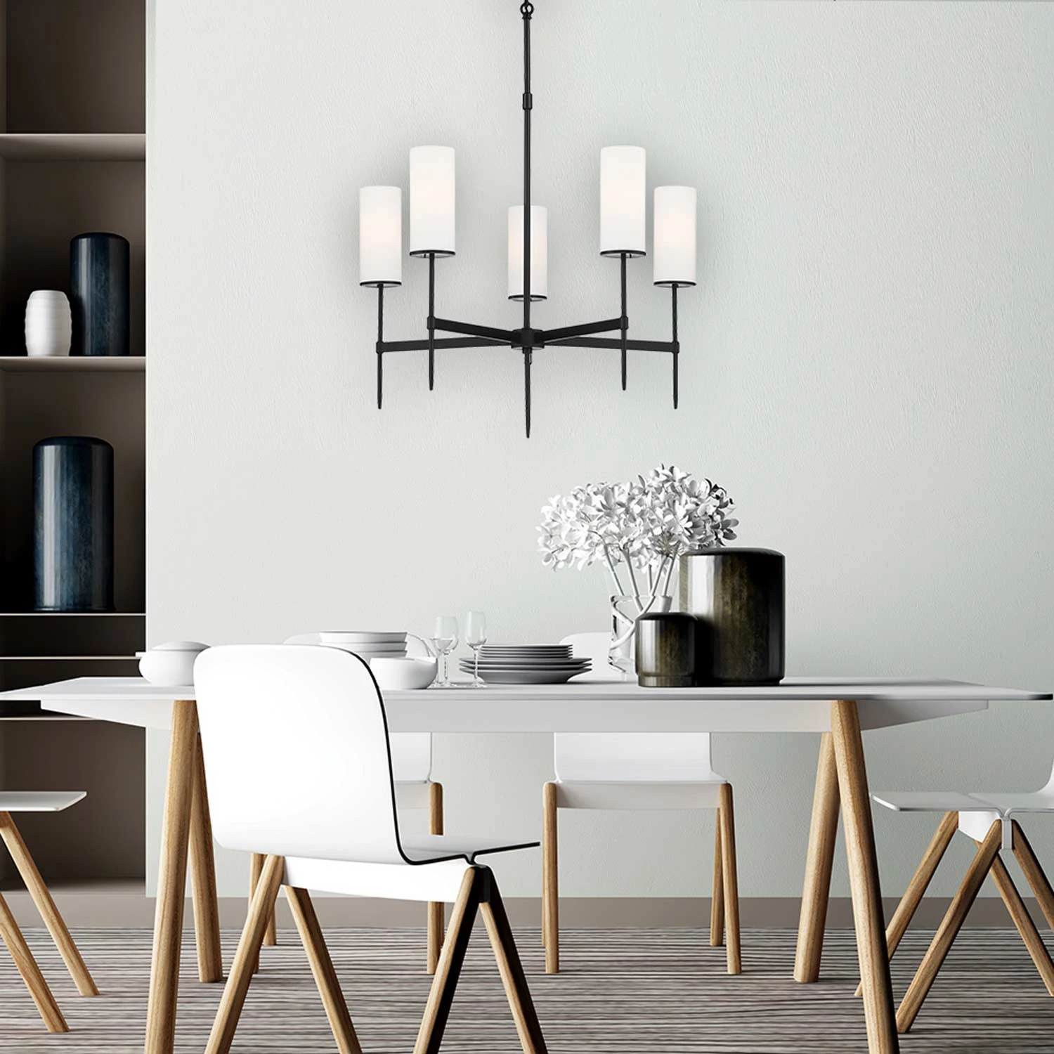 Cosmopolitan attitude takes a page from bold industrial style, adding a taste of artistry for good measure. Highlight a dining ensemble or foyer with the First Avenue Chandelier from Minka Lavery and embrace the crisp contrast of coal finish metal and sleek etched white glass shades. An elongated design is both optically impactful and impressive.