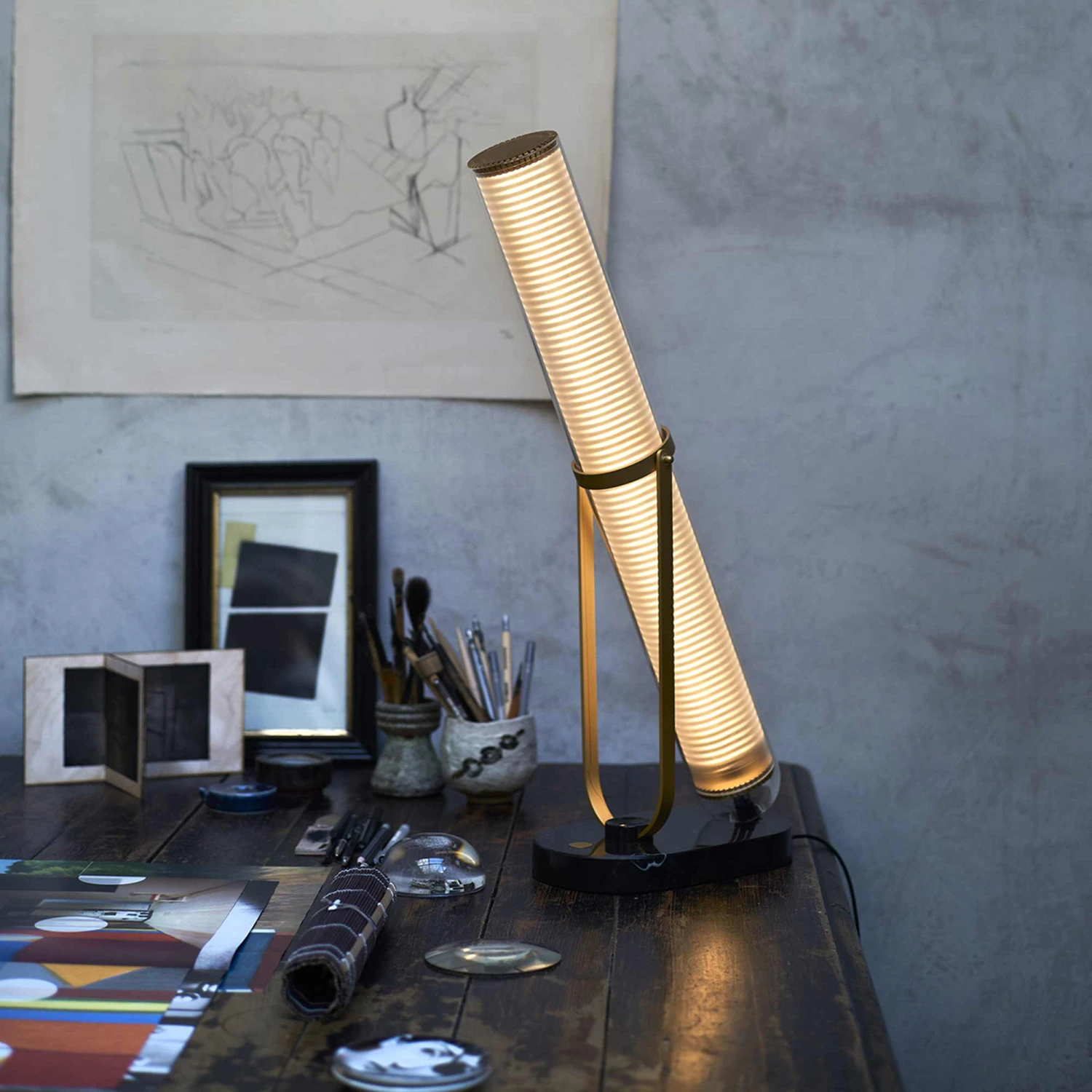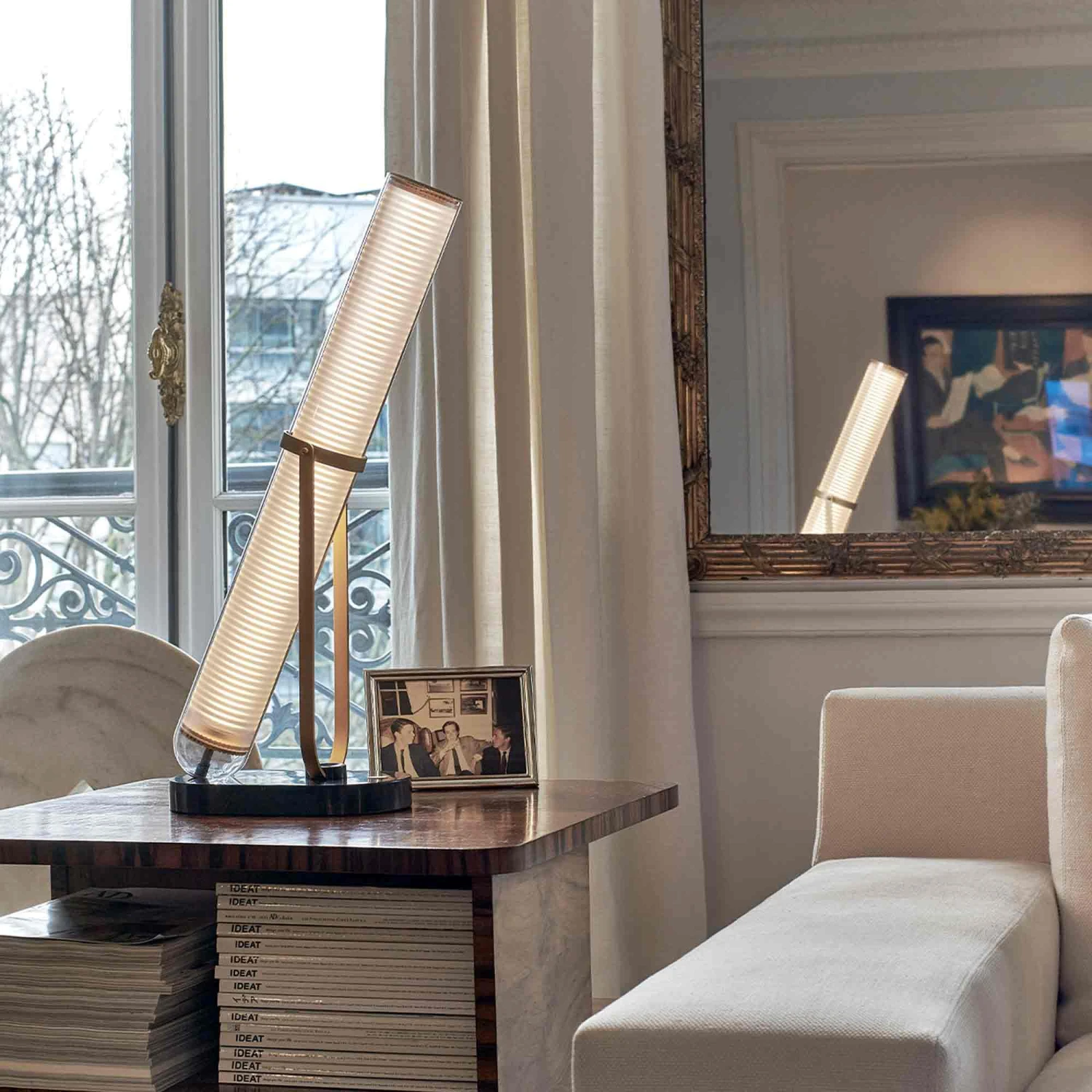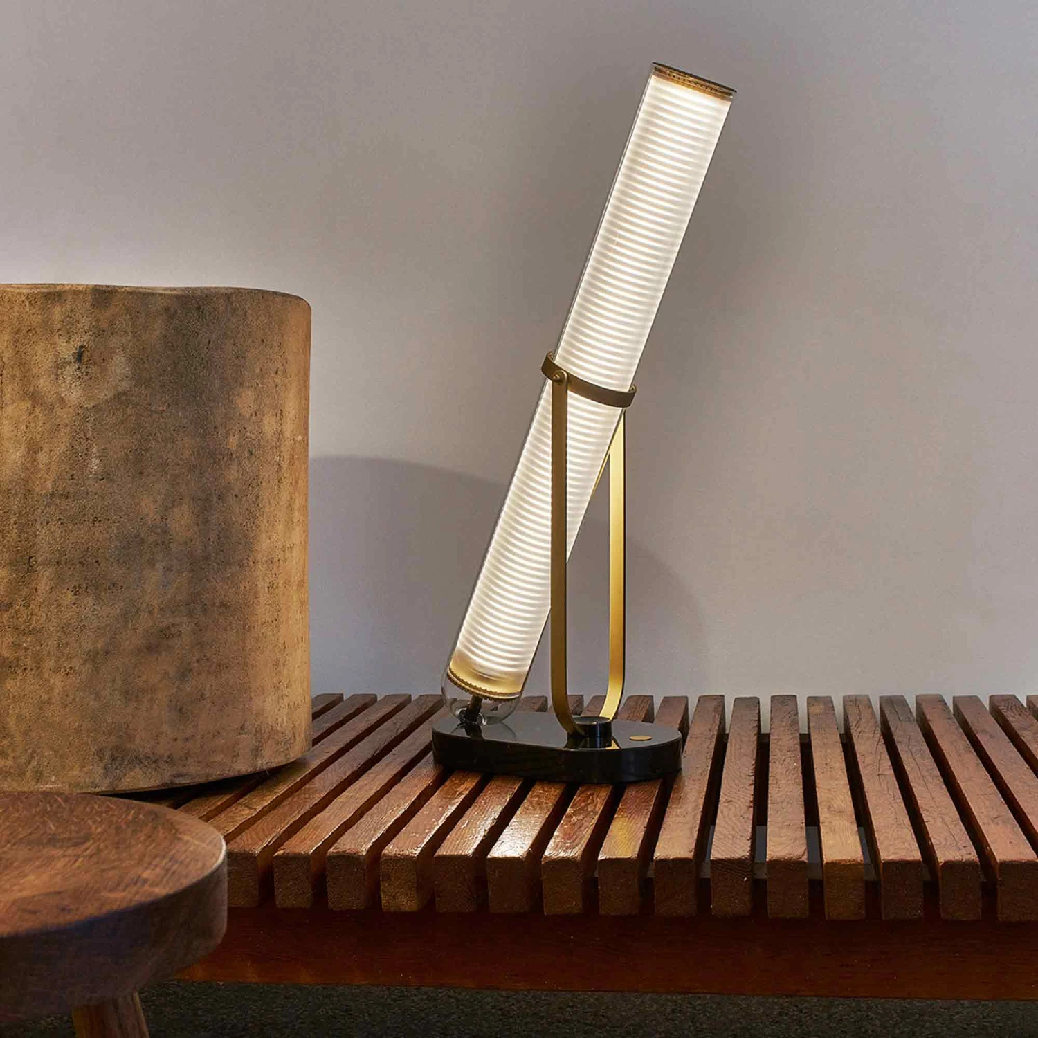 Frechin Table Lamp was made up of a marble and aluminum base, and a borosilicate glass tube. This lamp by comparing timeless materials and a poetic approach to technology illuminates spaces and offers a sensory experience of optics.