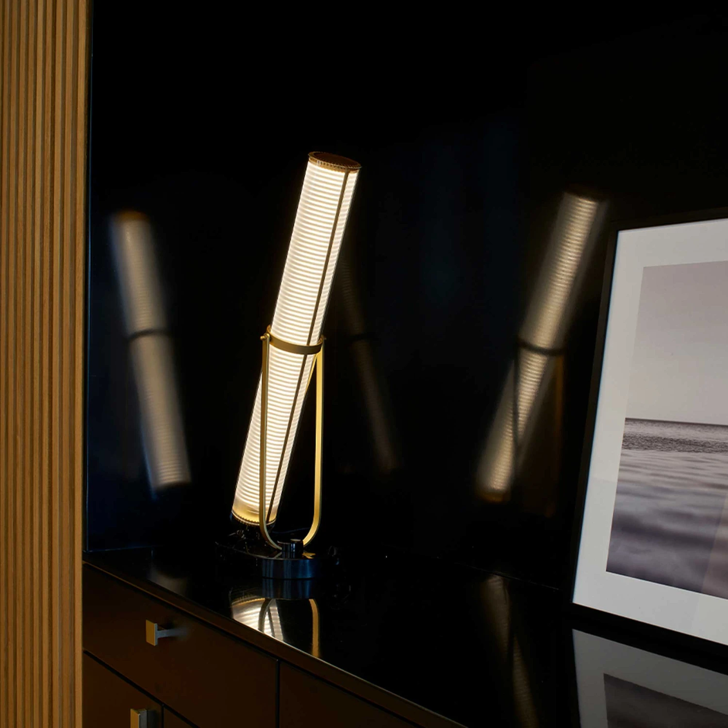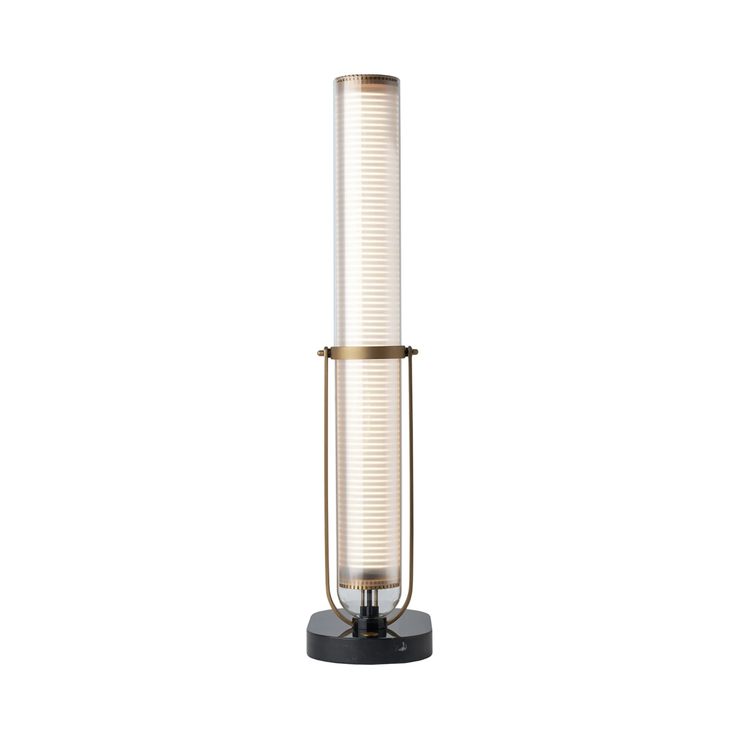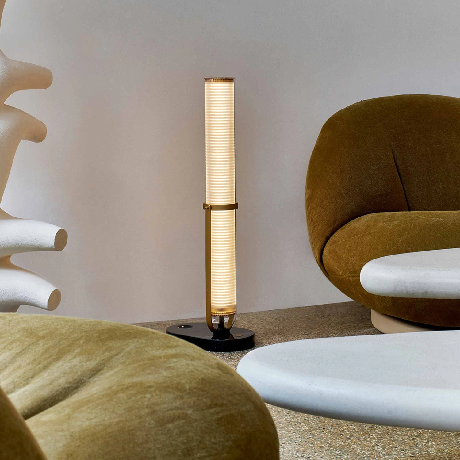 Frechin Table Lamp was made up of a marble and aluminum base, and a borosilicate glass tube. This lamp by comparing timeless materials and a poetic approach to technology illuminates spaces and offers a sensory experience of optics.