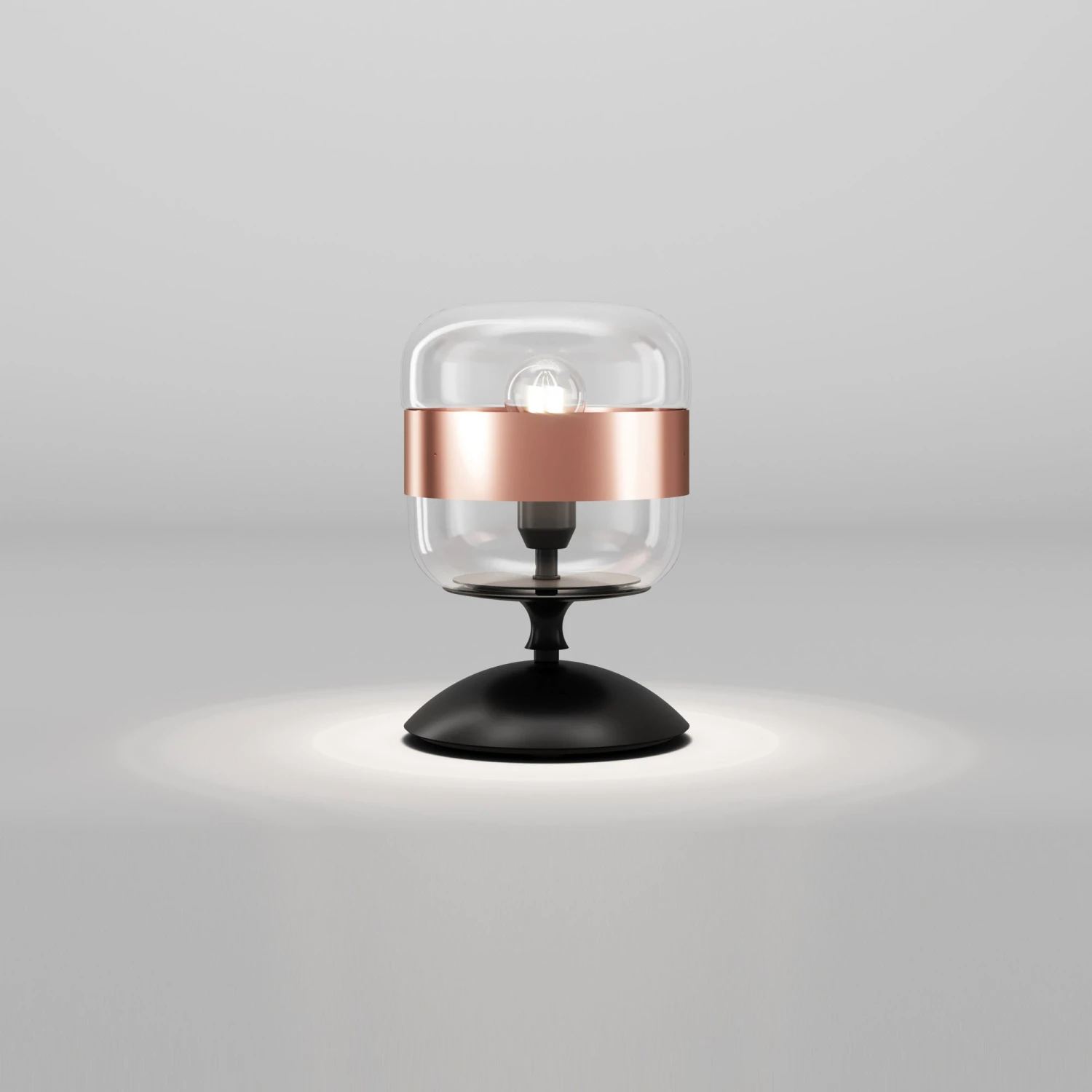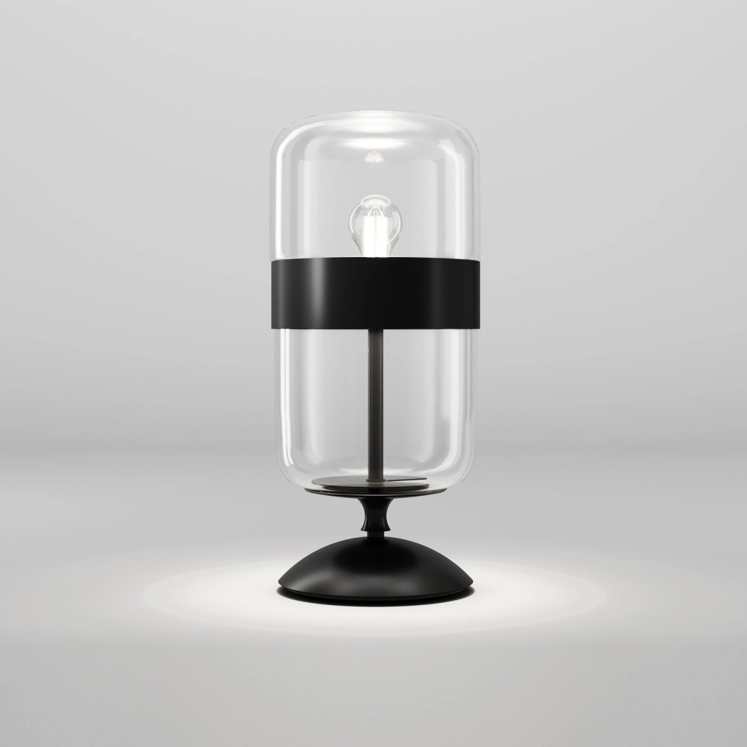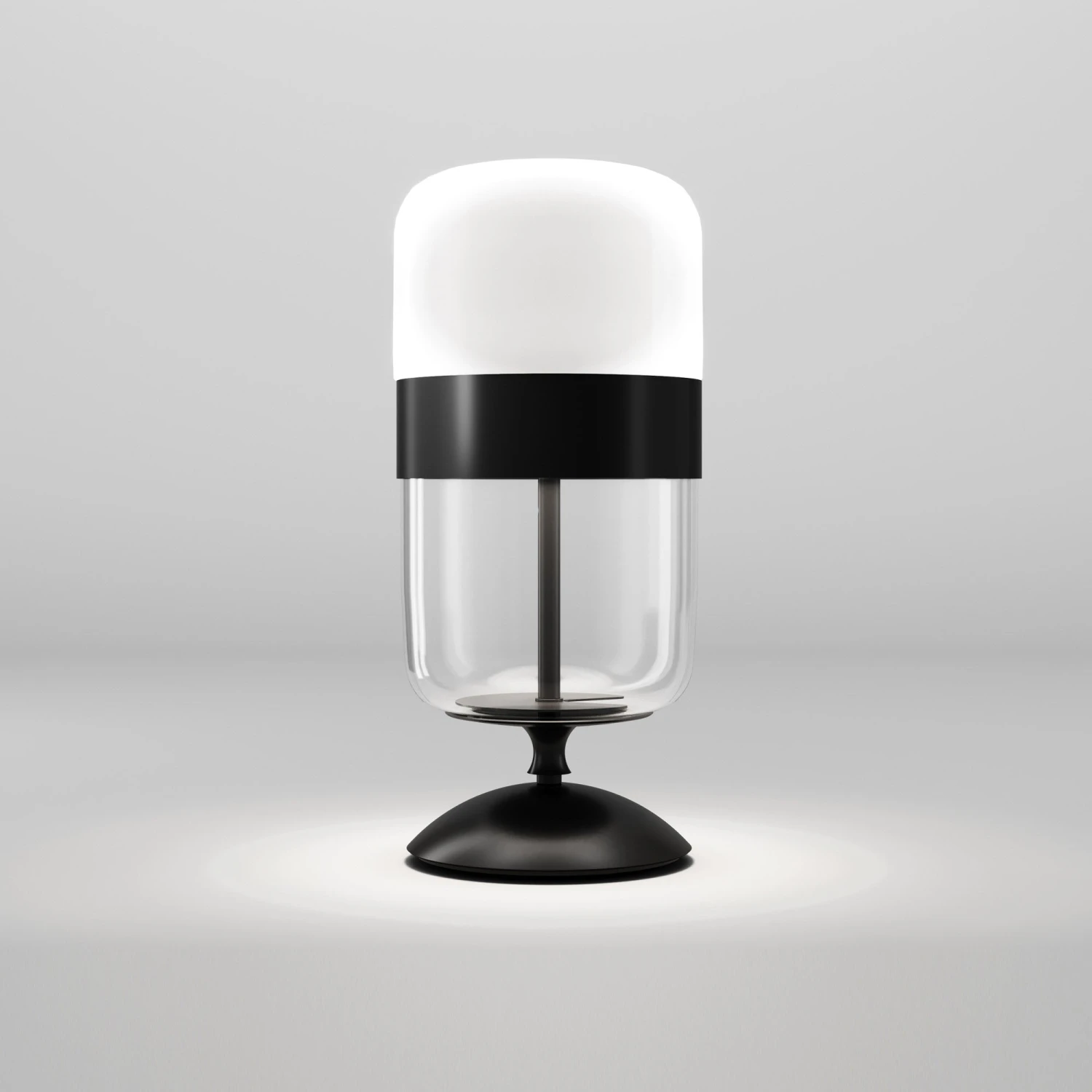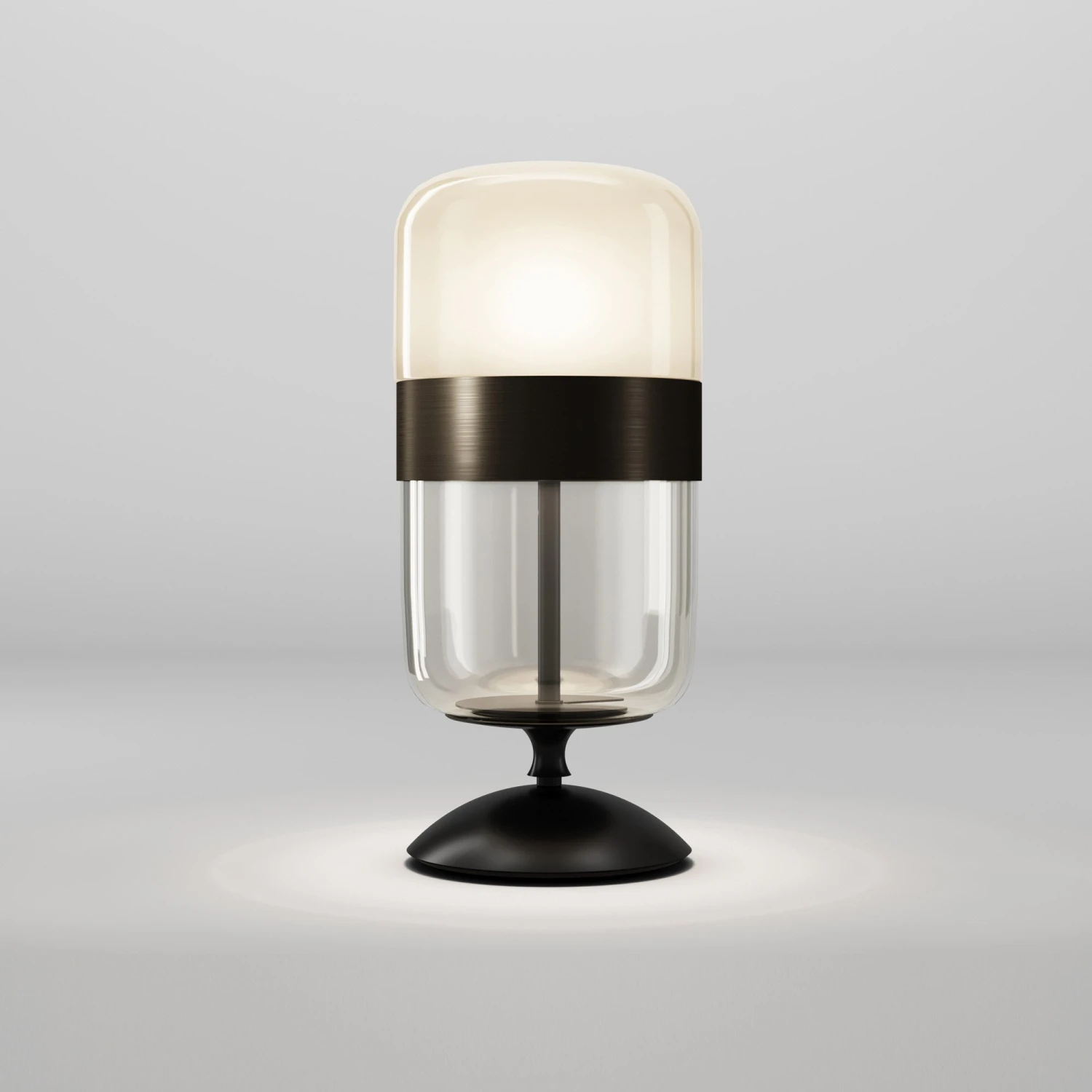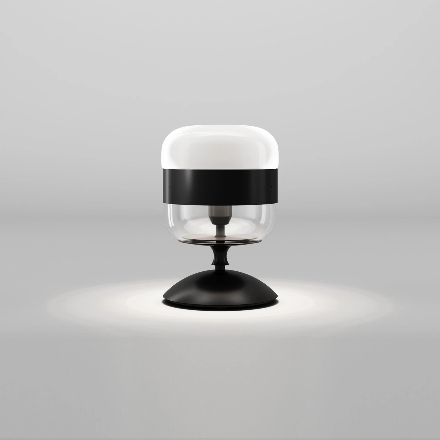 Glam and palette contrast become critical design elements in the Futura Table Lamp from Vistosi, an exceptional light source with a chic, fashionable and functional purpose. Blending smoothly shaped glass with a band of metal and a metal frame, this eye-catching table lamp offers a bold look with a hint of Art Deco influence.
