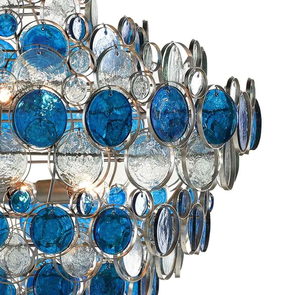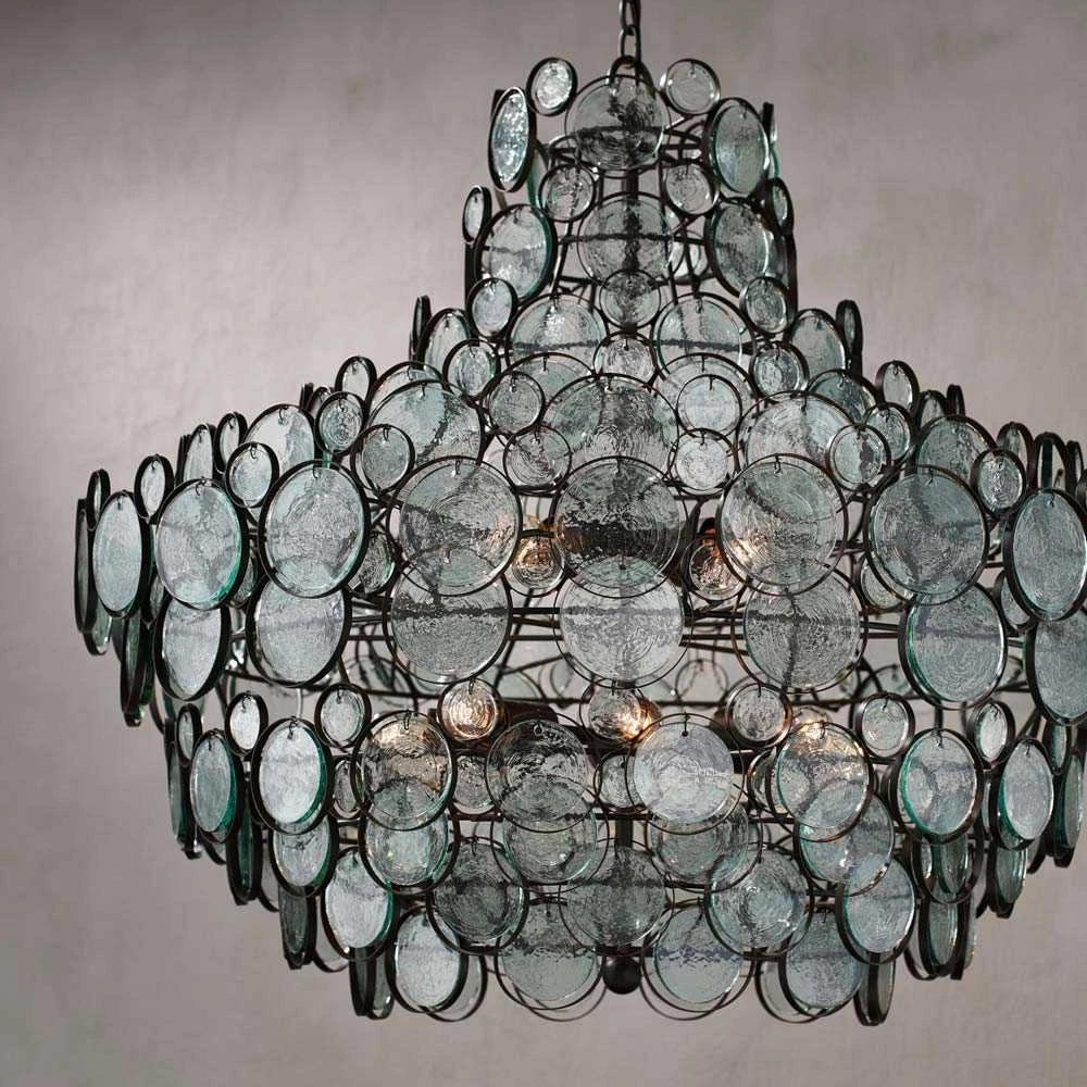 Embrace the foundational impact of glass as art in the Galahad Glass Chandelier from Currey and Company. This boho-inspired fixture delivers a tiered design of recycled glass discs affixed to wrought iron in clean rows. A dramatic design motif captures attention as it enhances dining ensembles and foyers.