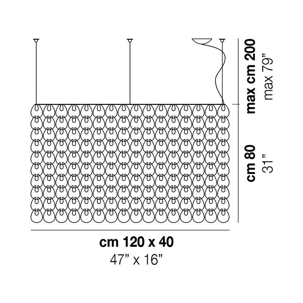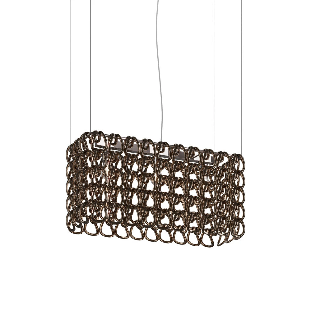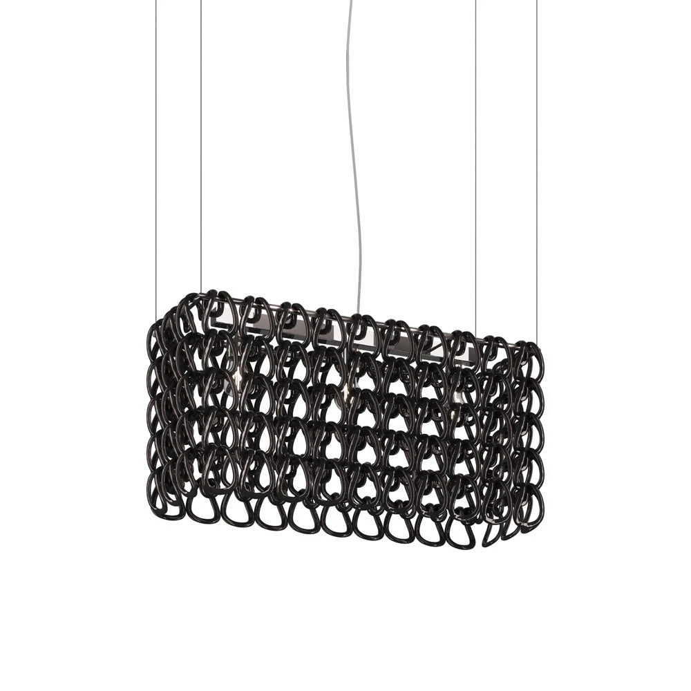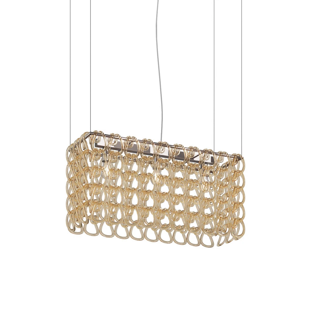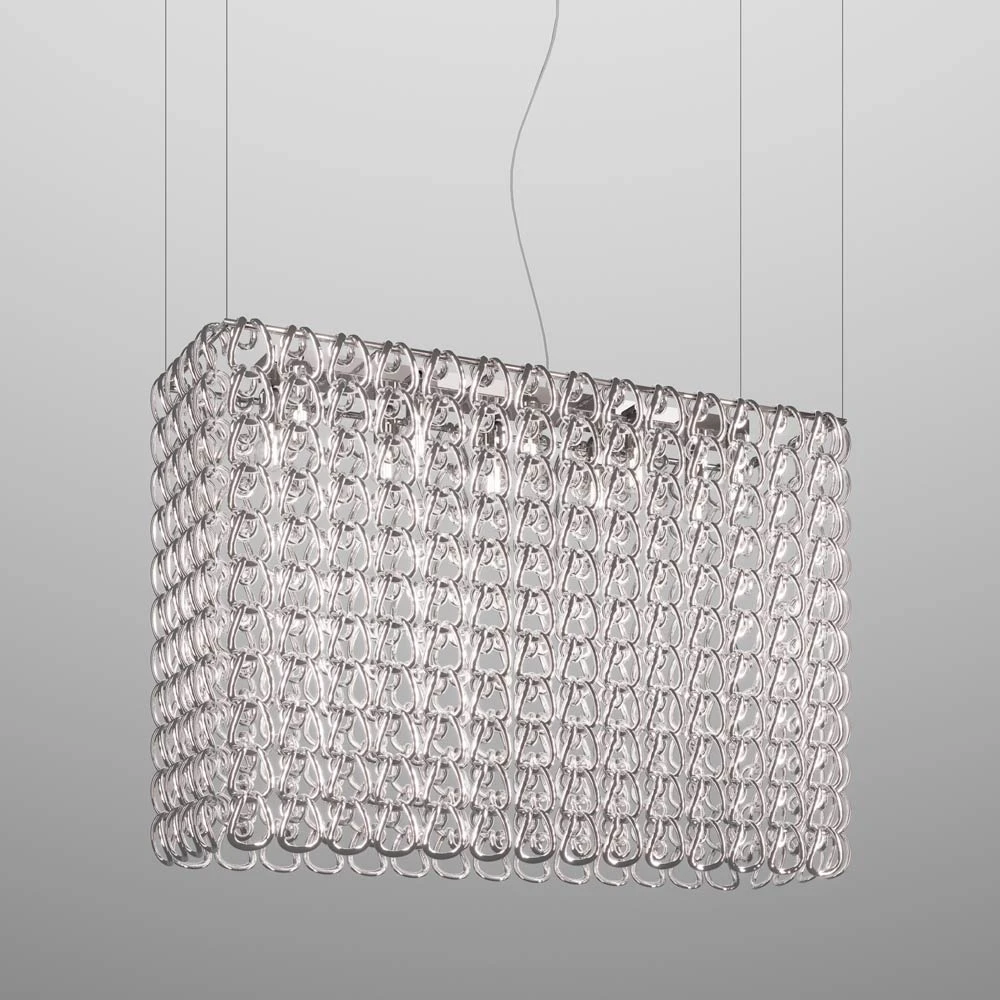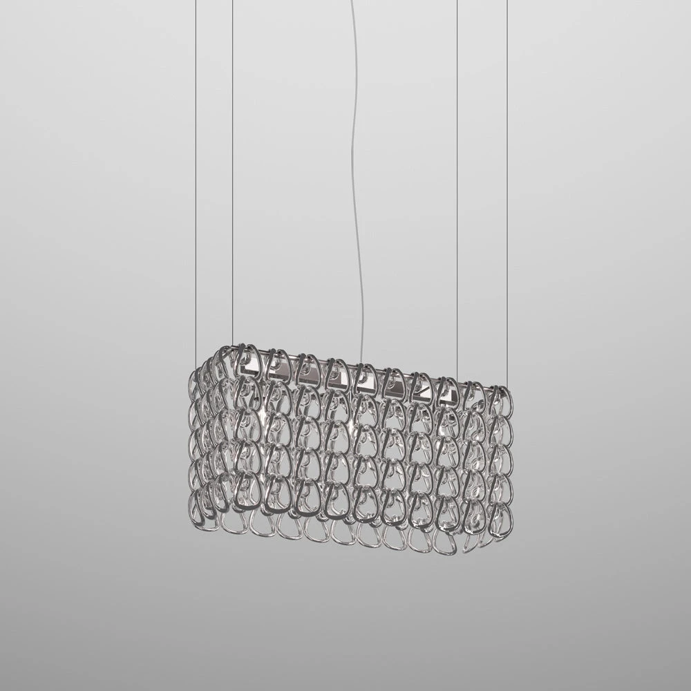 Decadence tells the story of an art form transitioning into room deco as the Giogali Rectangular Pendant Light from Vistosi plays the starring role. Revel in an exquisite gallery-inspired look with an orderly rectangular formation of delicate glass loops arranged around metal framing. This fixture is a superb choice for highlighting an island or bar space, driving home the sleek and stylish power of glass in light reflection.