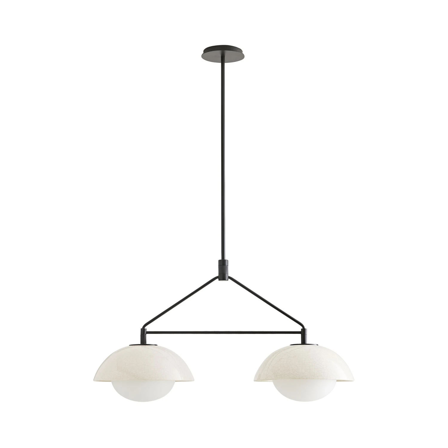 Symmetry and structure steal the show with simple yet artisanal charm, creating a light fixture with neutrality and elegance in one. The Glaze Linear Pendant Light from Arteriors delivers a geometric silhouette with interesting angles as blackened steel armature and rounded ivory stained crackle glaze ceramic shades drill down to basics, shifting design focus to surrounding décor.