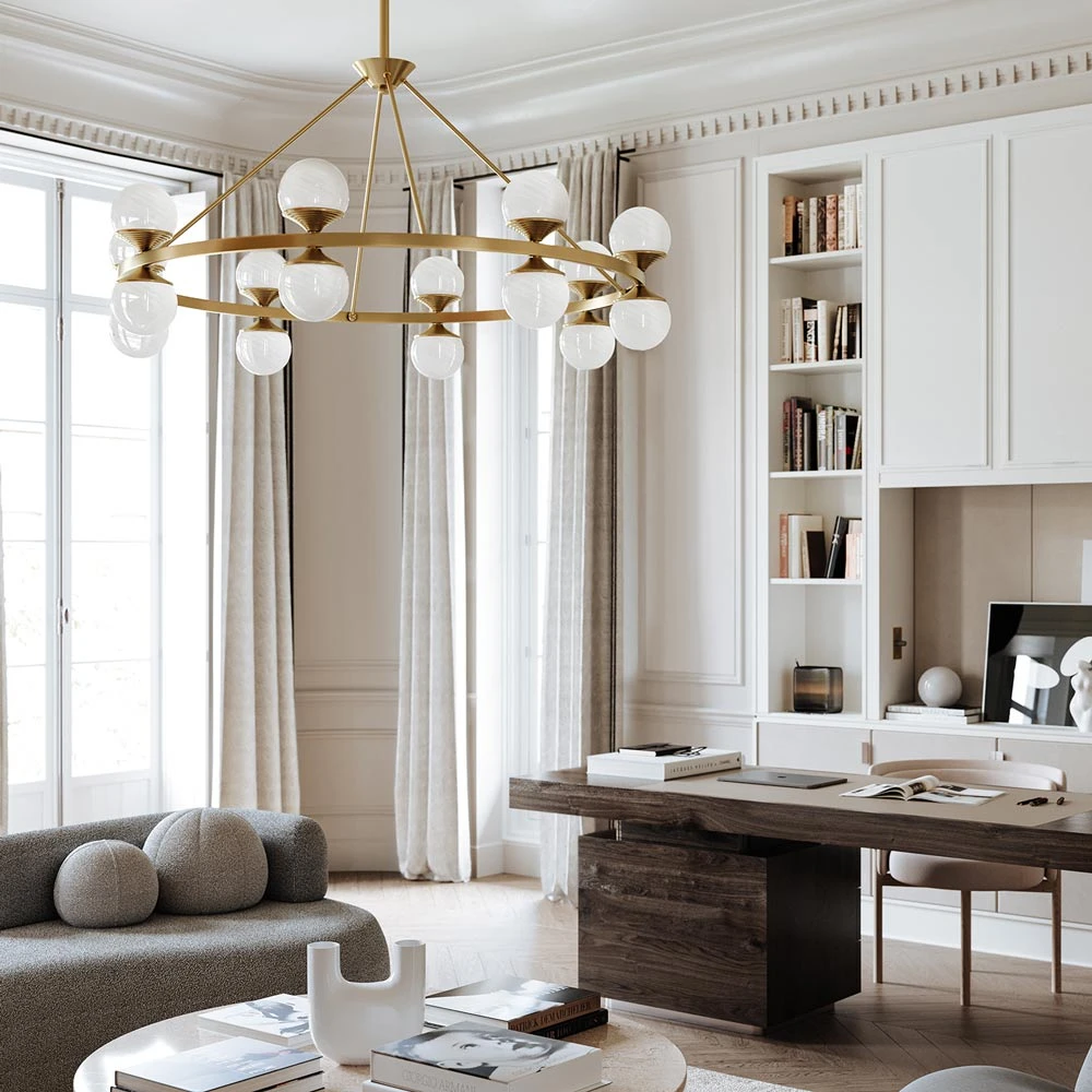 Subtle yet artistic accenting adds style power to a glam fixture with retro influence. The Grafton LED Chandelier from Hudson Valley Lighting indulges in earthy elegance, fashioning carefully placed white Spanish alabaster globe shades around an aged brass finish metal ring frame and balanced with a tripod suspension design. This energy-efficient fixture offers delightful nostalgic charm.
