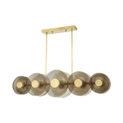 Creative design elements borrow from iconic retro style as the Griston LED Linear Pendant Light from Hudson Valley Lighting offers a festive feel in a modern or transitional space. Working with elements creating optical illusions, this fixture blends graduated sizing of round diffusers with spiraling linear accents and linear, structured framing in warm aged brass metal. Grab a bit of Mid-Century Modern style to light up any space.