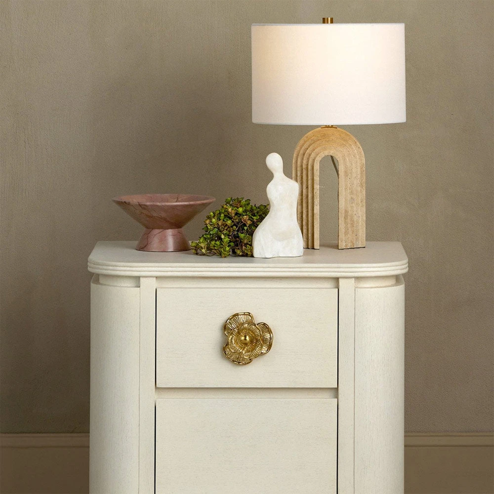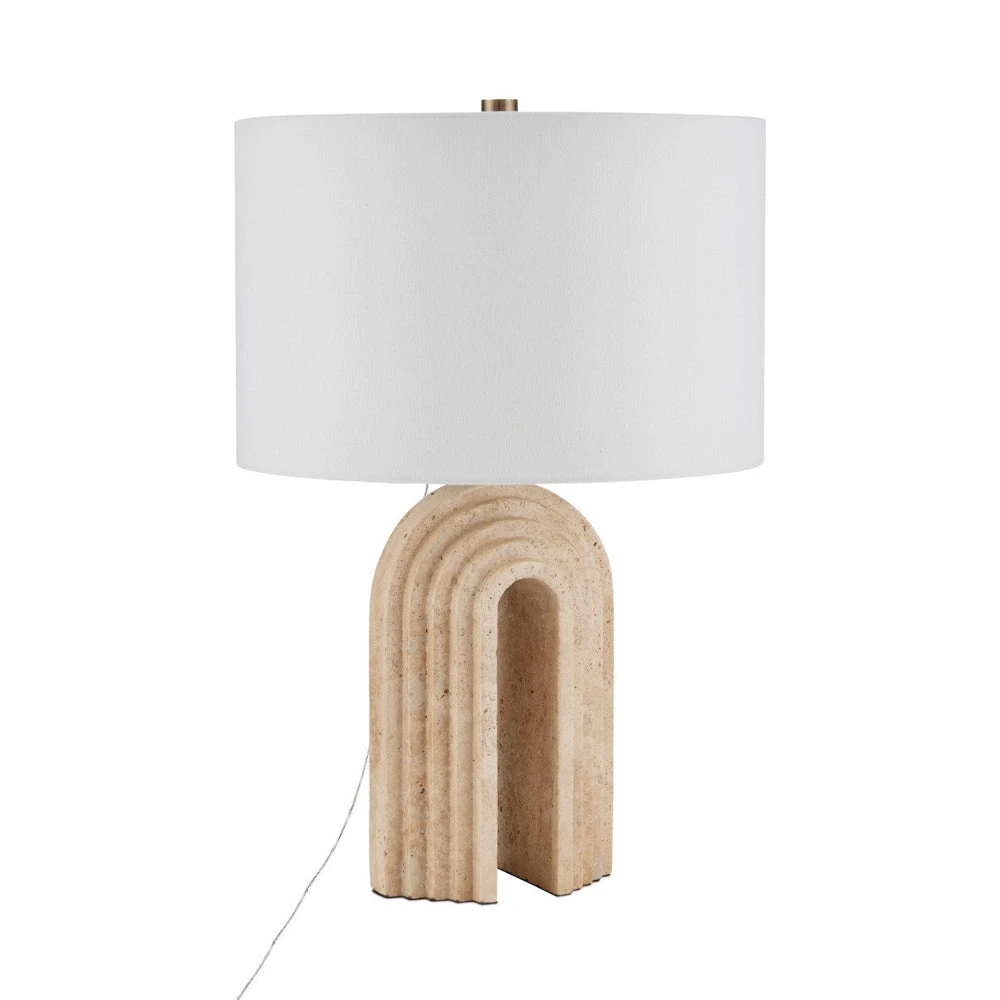 Easy and casual, the Hippodrome Table Lamp from Currey and Company delivers a quirky silhouette to make a cheeky design statement. Its natural finish travertine U-shaped body is dressed up with textural accents forming layered arches, subtle in detail but powerful in versatility. Continuing a soft, earth-inspired look, an off-white linen shade is generously sized.