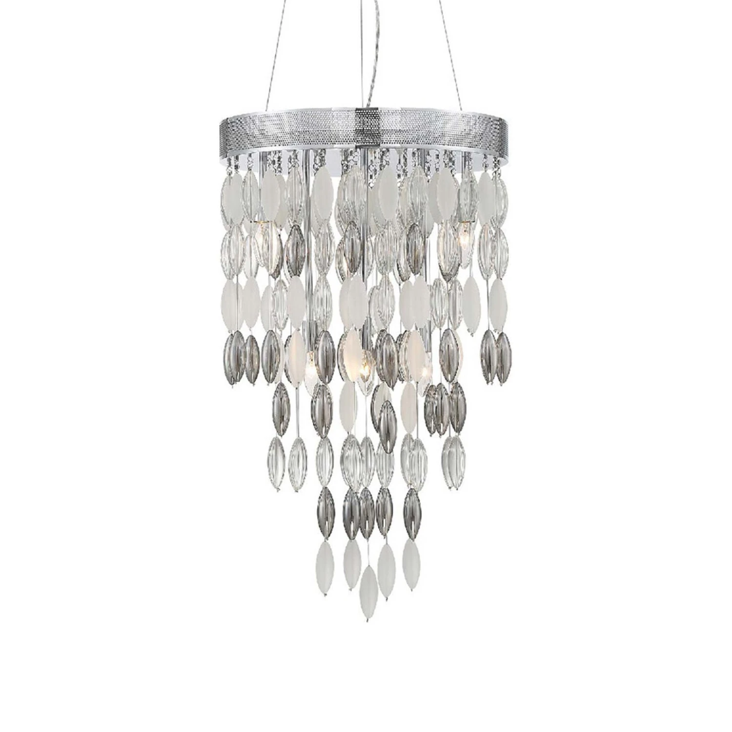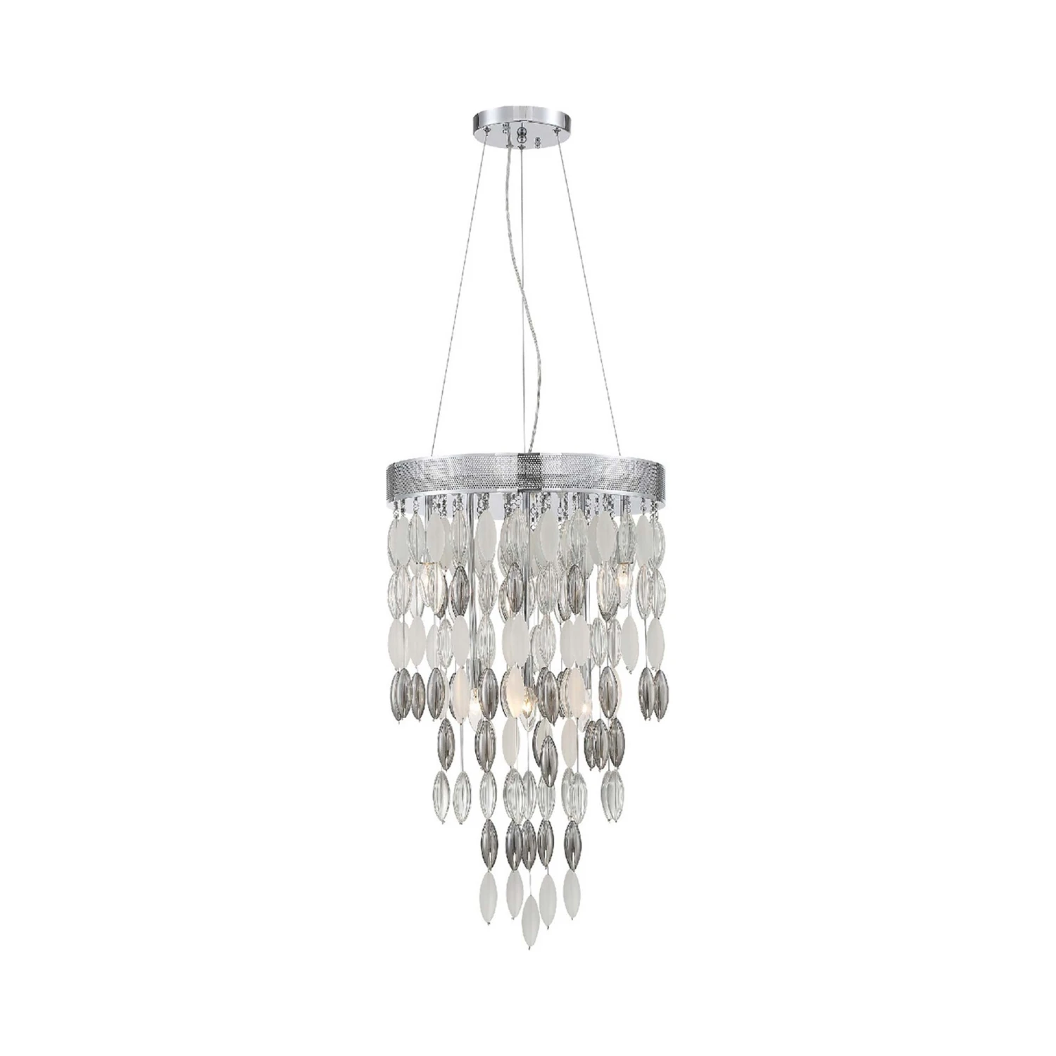 Exceptional artistry and an optically pleasing tapered silhouette create a light fixture that lifts the ambiance in a modern or transitional space. Indulge in measured glam with the Hudson Chandelier from Crystorama and appreciate the assortment of frosted, silver, and clear glass beads cut into leaf-like shapes. Layers of glass dangle from textural metal with a polished chrome finish, adding synchronous radiance and a tastefully sophisticated look.