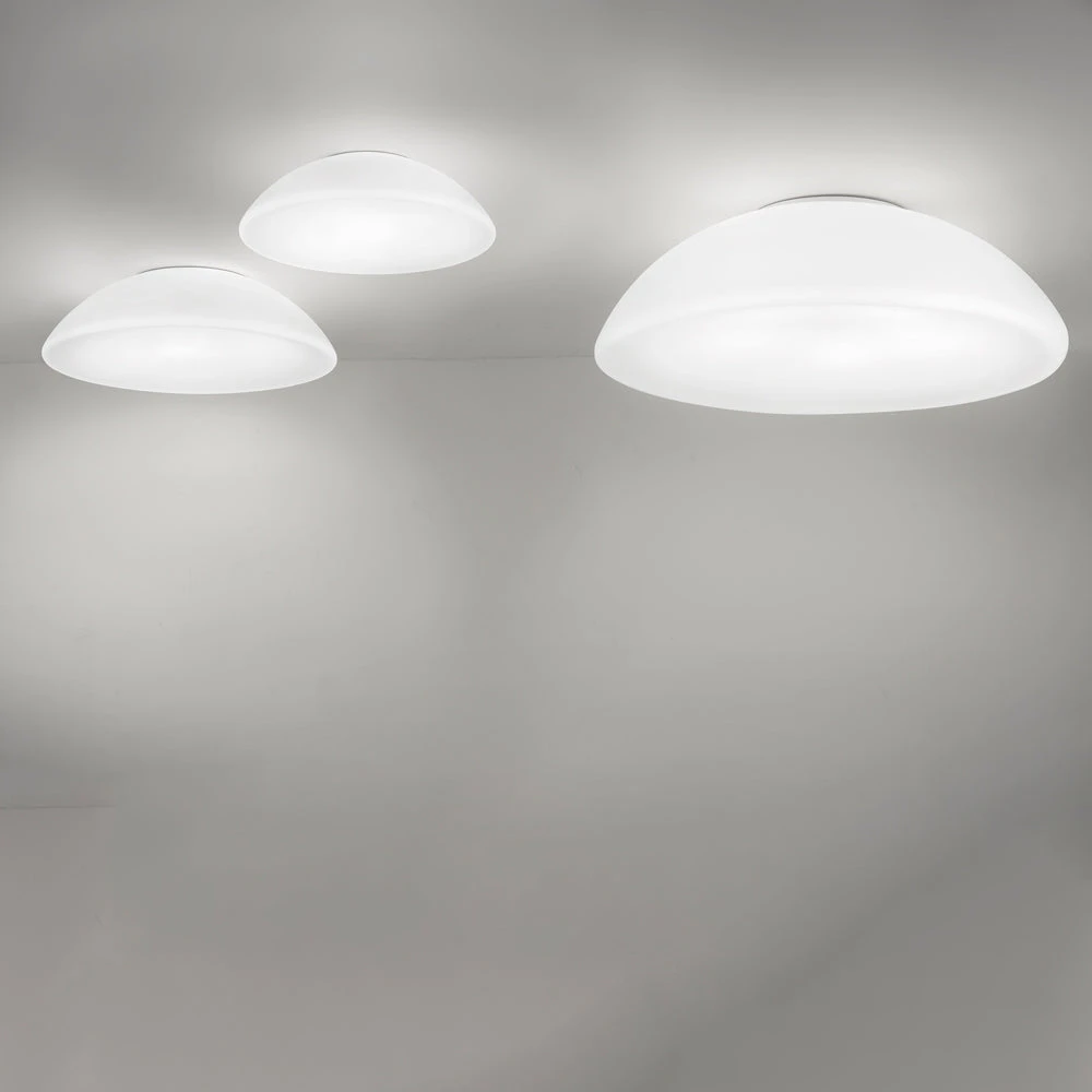 Inspired by retro design influence, the Infinita Flush Mount Ceiling Light from Vistosi reflects on classic fixture styles throughout the ages. This minimalist yet elegant light delivers a whimsical wide saucer silhouette that glows with ambient lighting through a white satin finish glass shade and glossy white framing. Make this light a versatile yet captivating source of illumination that stretches artisanal elements from floor to ceiling.