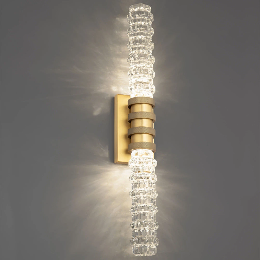 Brilliantly juxtaposing materials, the Kemberly LED Wall Light from Schonbek dazzles with intricate crystals, sculpted to scatter light in a breathtaking display. The layered metal base, adorned with textured ring detailing, creates a striking contrast, merging modern sophistication with timeless refinement.