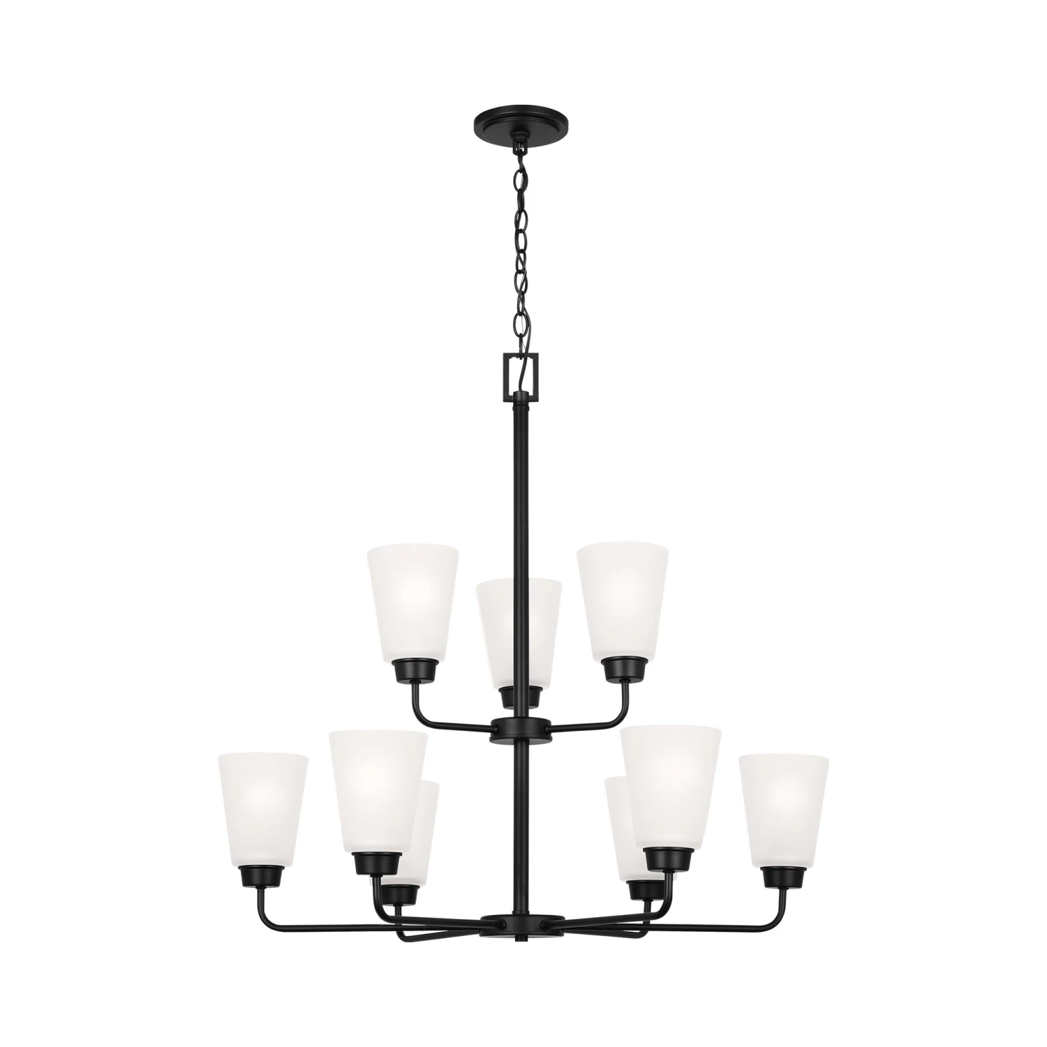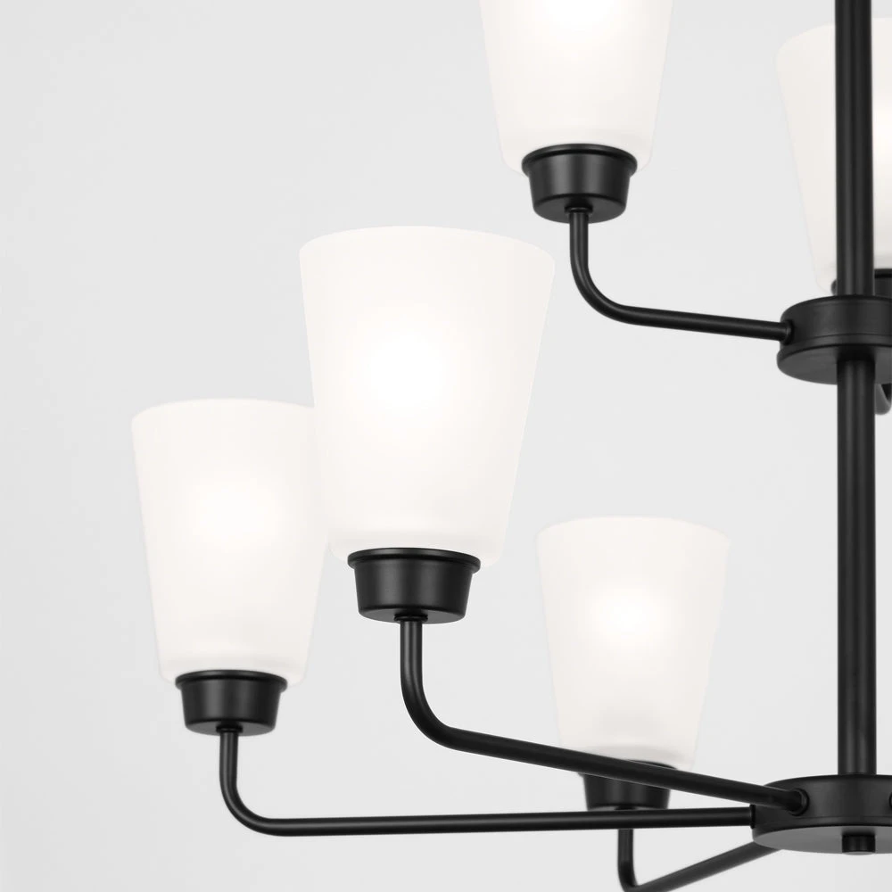 The multi-light design of a timeless fixture offers bold energy to a foyer or dining space. The Kerrville Chandelier from Generation Lighting blends dramatic dark metal framing with milky white shades, making a statement of impact and adding plenty of illumination.