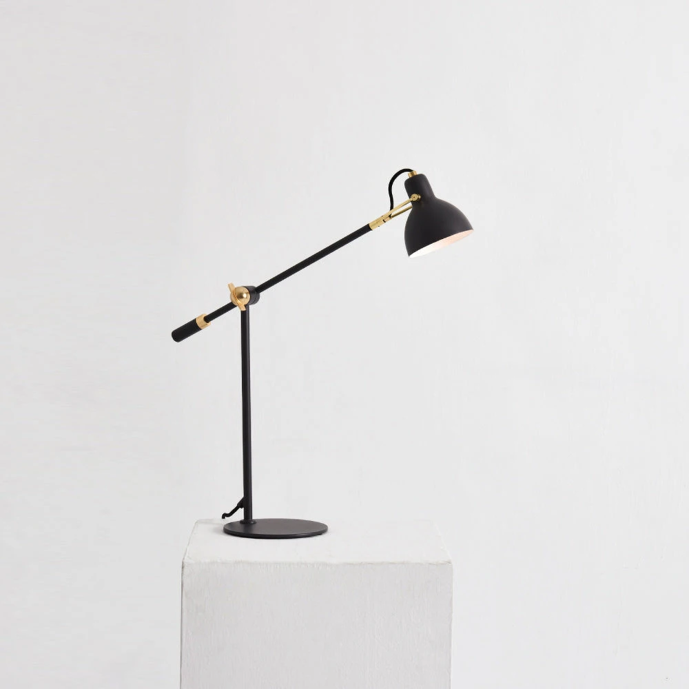Sophisticated styling embraces an industrial motif in the Laito Gentle Table Lamp from Seed Design, complementing a modern office or living space. Change height settings with a rotary arm lamp attached to a studio-inspired metal shade in an asymmetrical silhouette, delivering a crisp look.