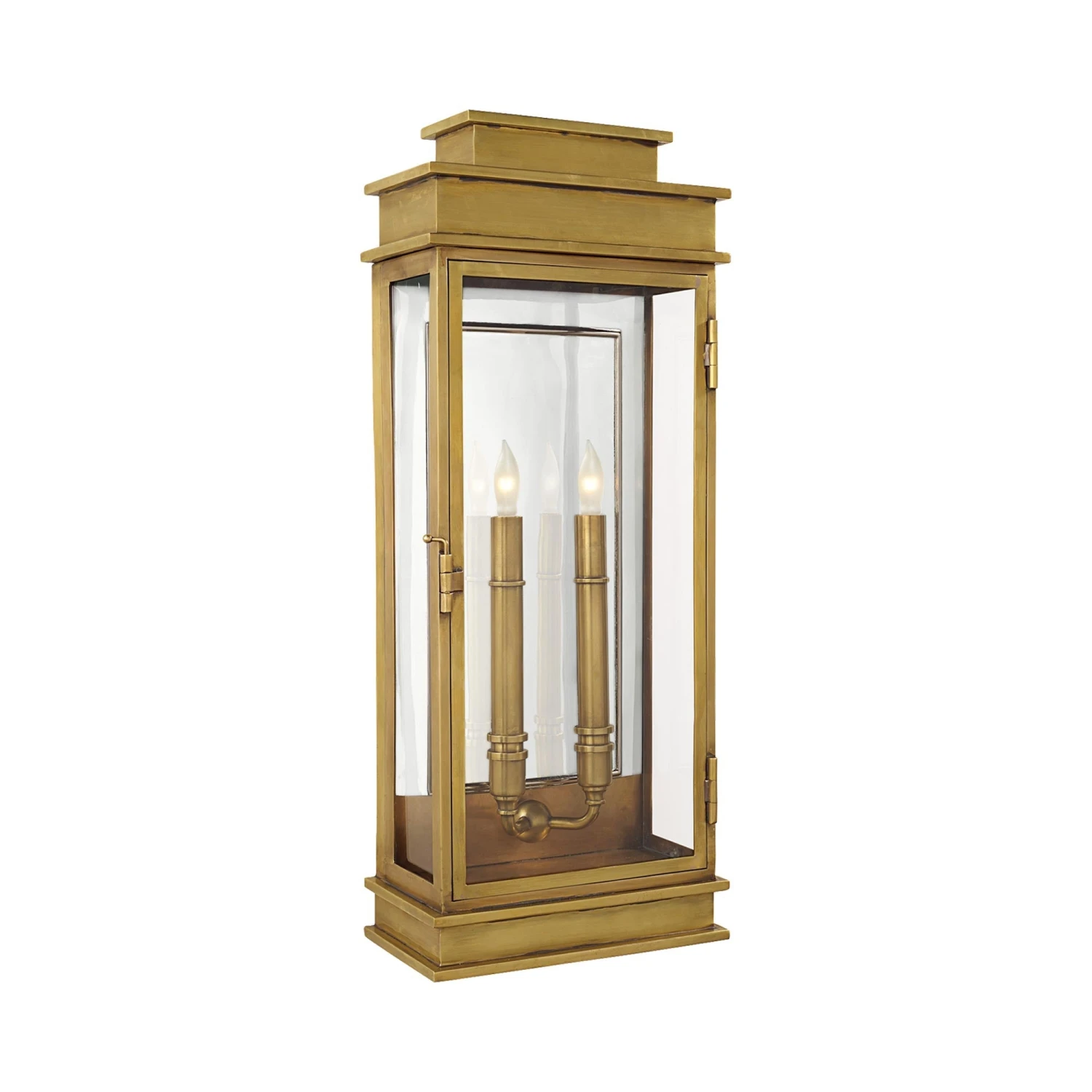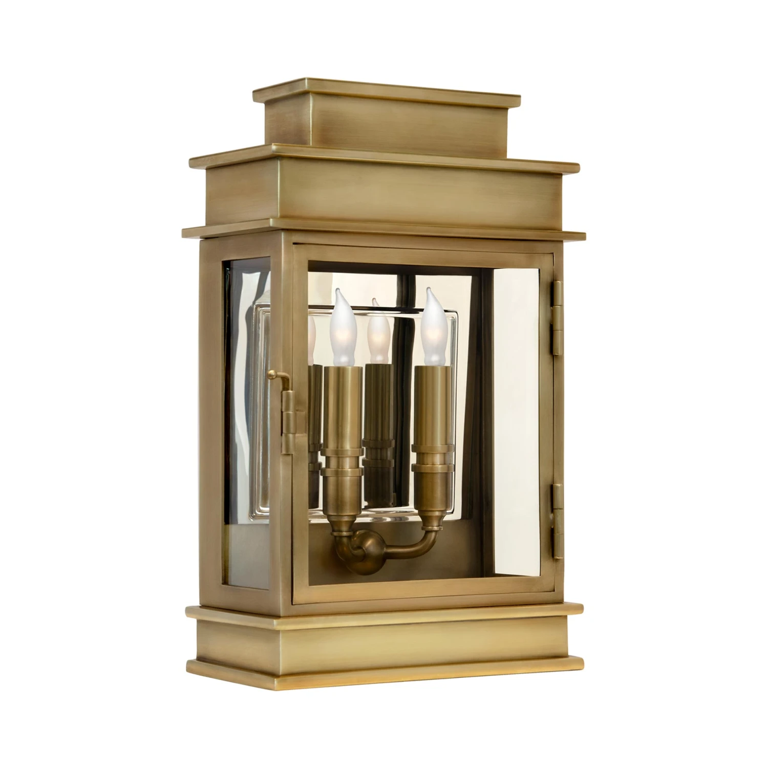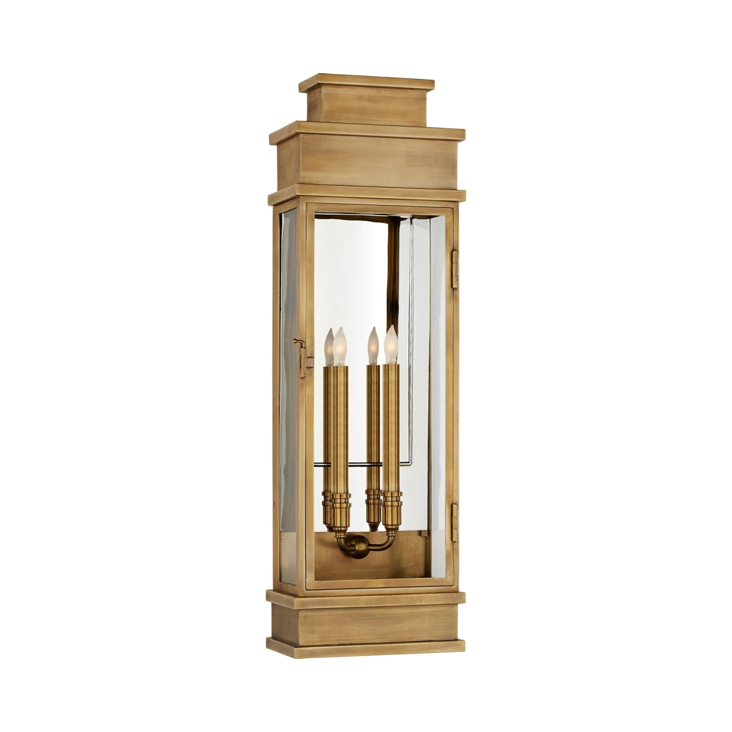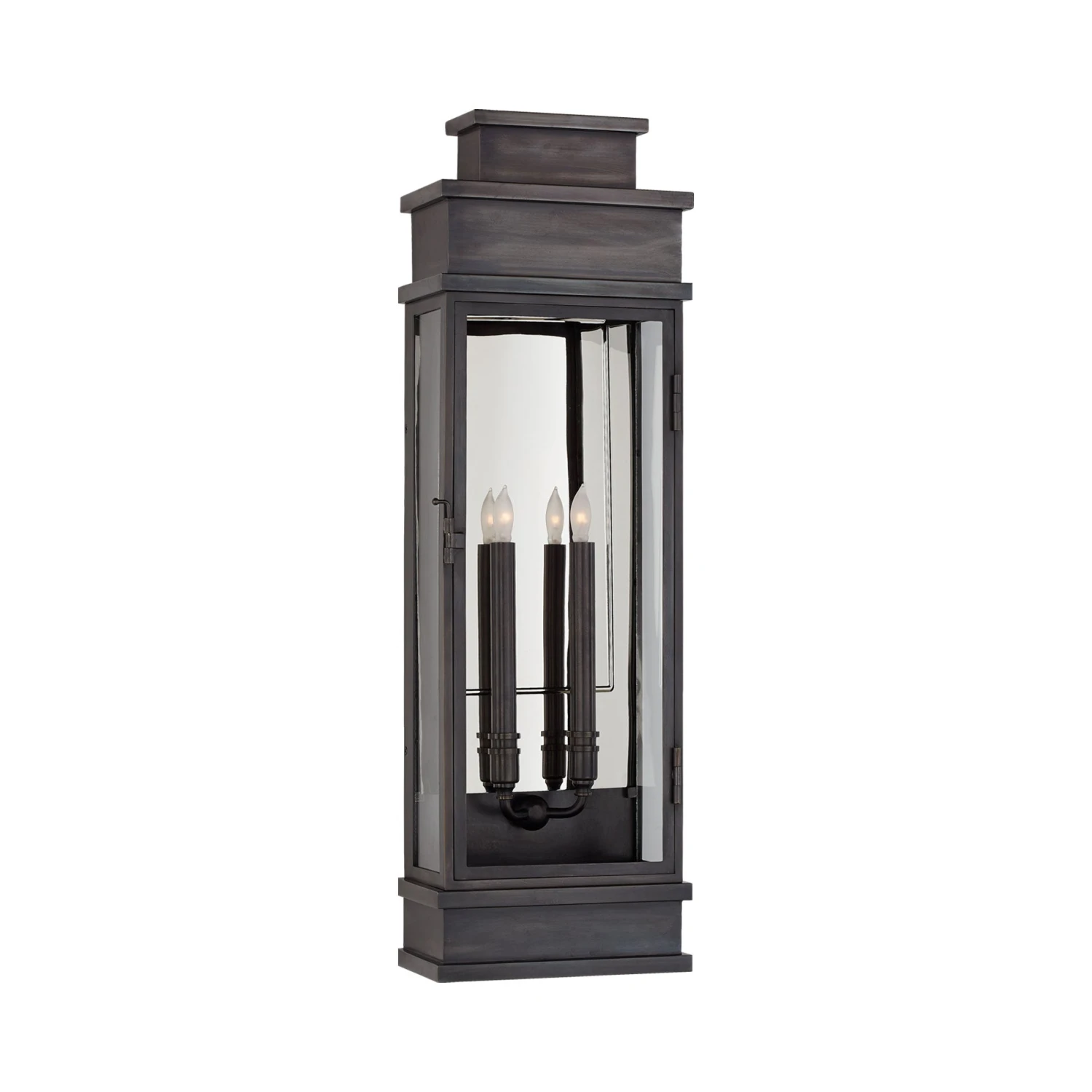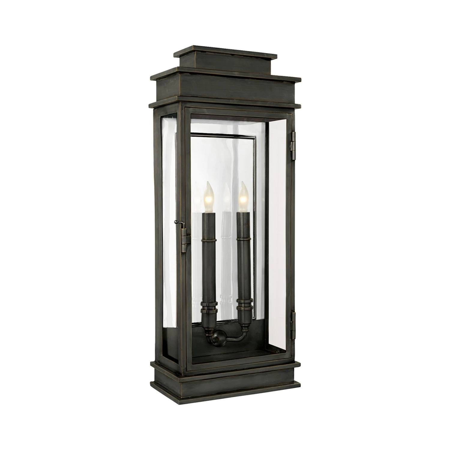 Eclectic with a stacked silhouette fashioned to replicate a box form, the Linear Outdoor Wall Light from Visual Comfort Signature delivers a striking look with an abundance of upscale elegance. Metal construction forms a lantern-style design with hinged doors and glass panels offering full view of a stylish candelabra cluster. Definition and dimension drive the style narrative of this fashionable light that lifts the mood of an exterior space.