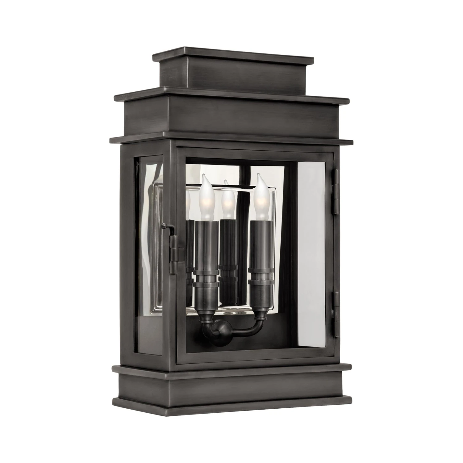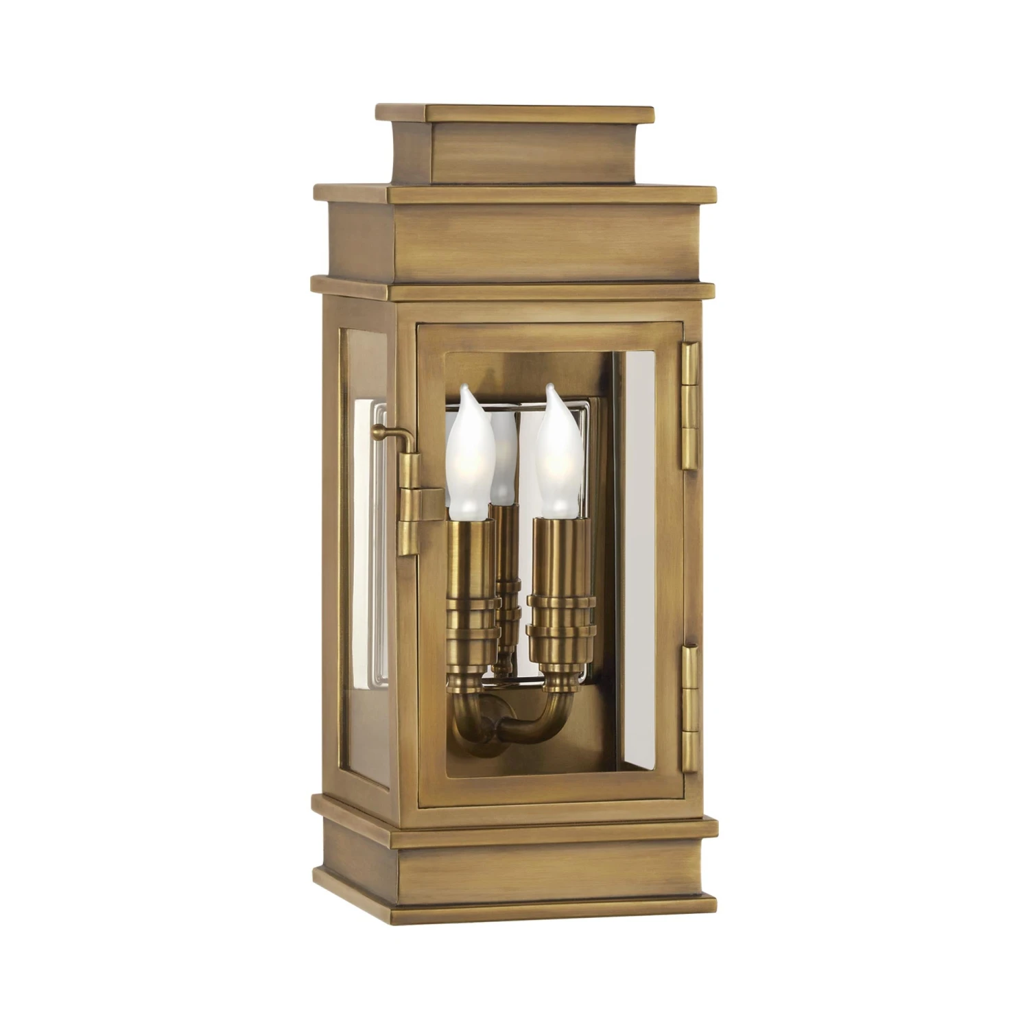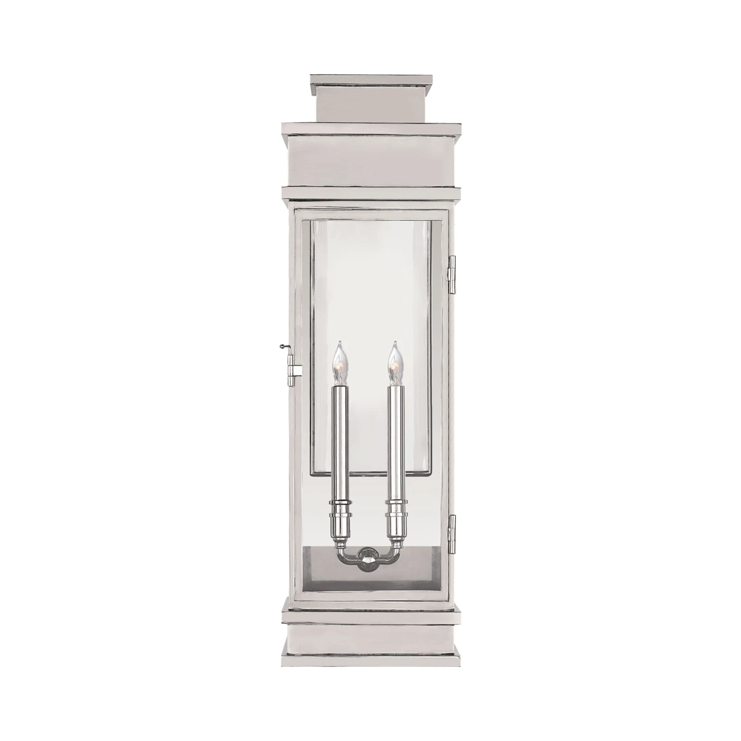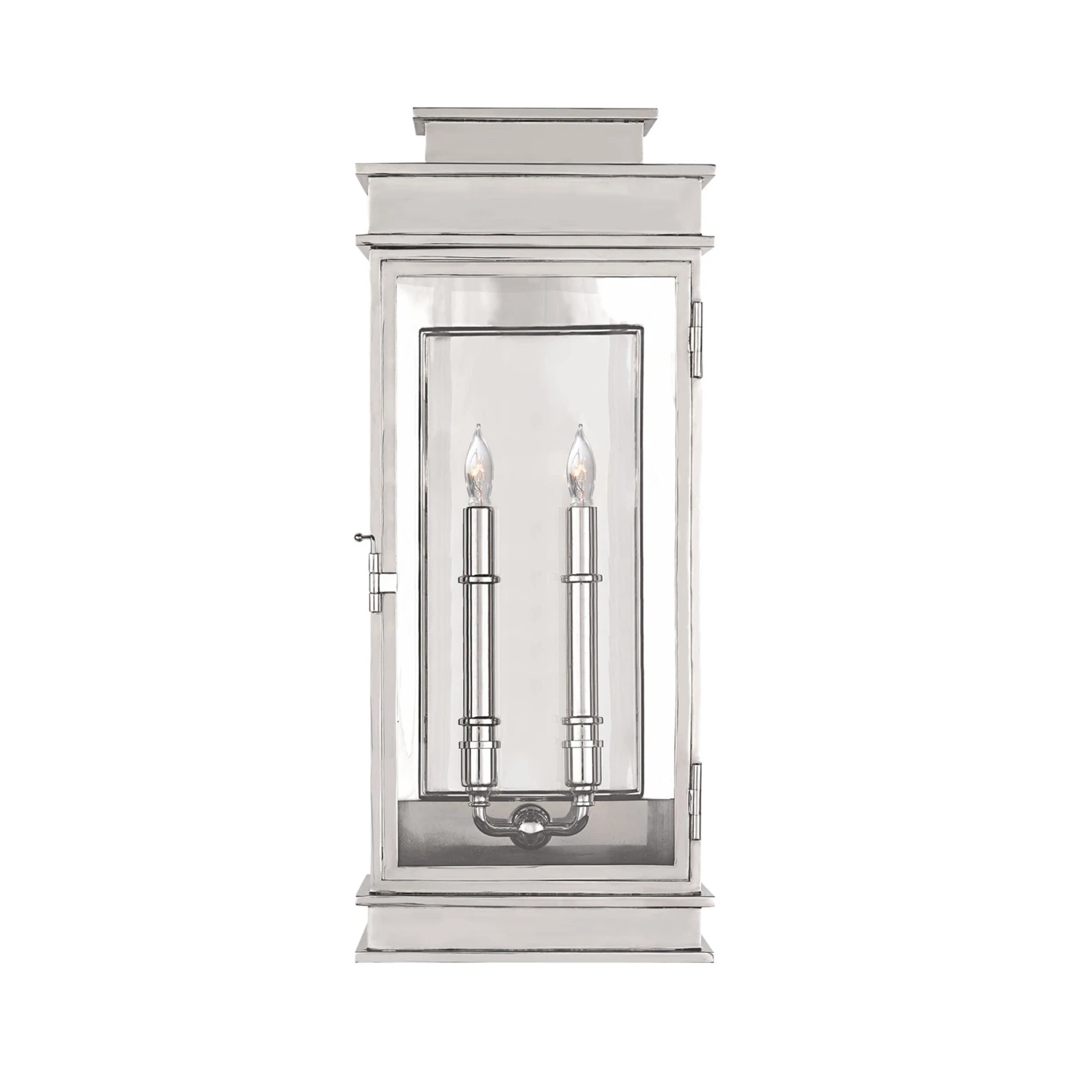 Eclectic with a stacked silhouette fashioned to replicate a box form, the Linear Outdoor Wall Light from Visual Comfort Signature delivers a striking look with an abundance of upscale elegance. Metal construction forms a lantern-style design with hinged doors and glass panels offering full view of a stylish candelabra cluster. Definition and dimension drive the style narrative of this fashionable light that lifts the mood of an exterior space.