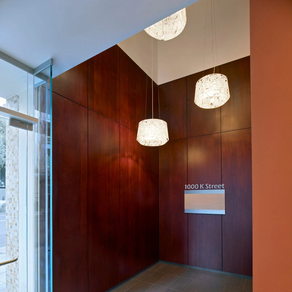 The interplay of light and shadow create unique energy and artistry for the Collage Pendant Light from Louis Poulsen. A trio of laser cut acrylic drums feature different patterns and are layered to disguise the lamping and create diffused, downward illumination. Matte white adds to a modern sensibility and is sure to offer a lovely complement to surrounding decor.
