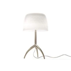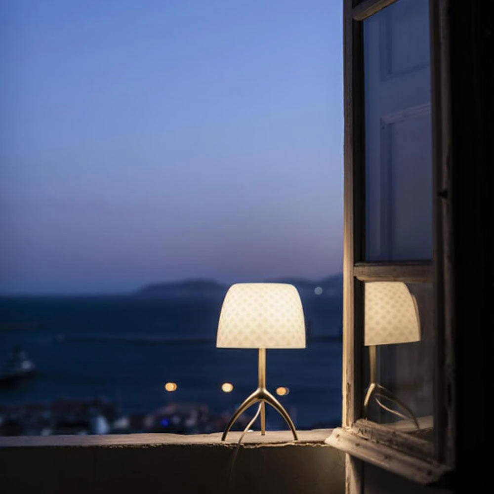 Multiple eras blend as one with this Lumiere 30th Table Lamp from Foscarini. The white lampshade with a geometric pattern and tripod makes an eye-catching impression in any living space or master suite.