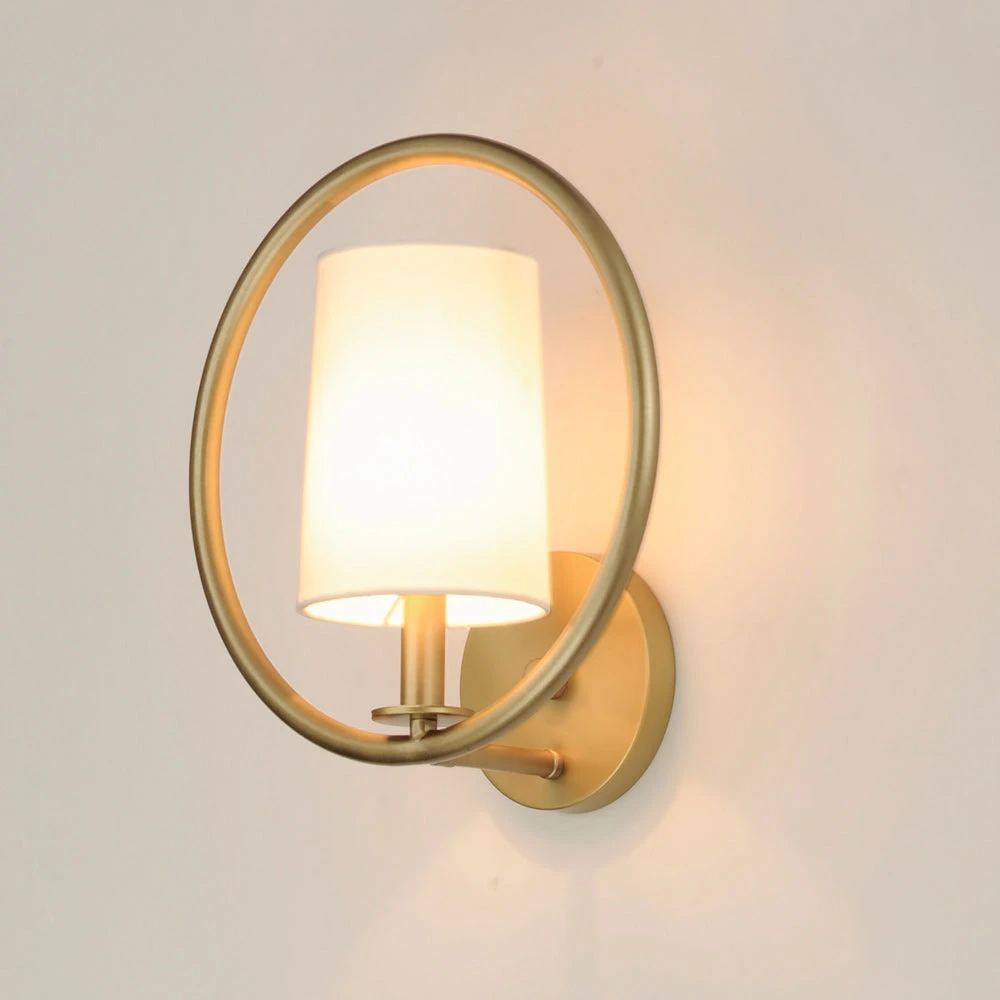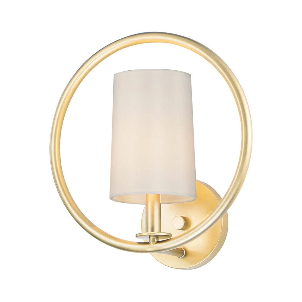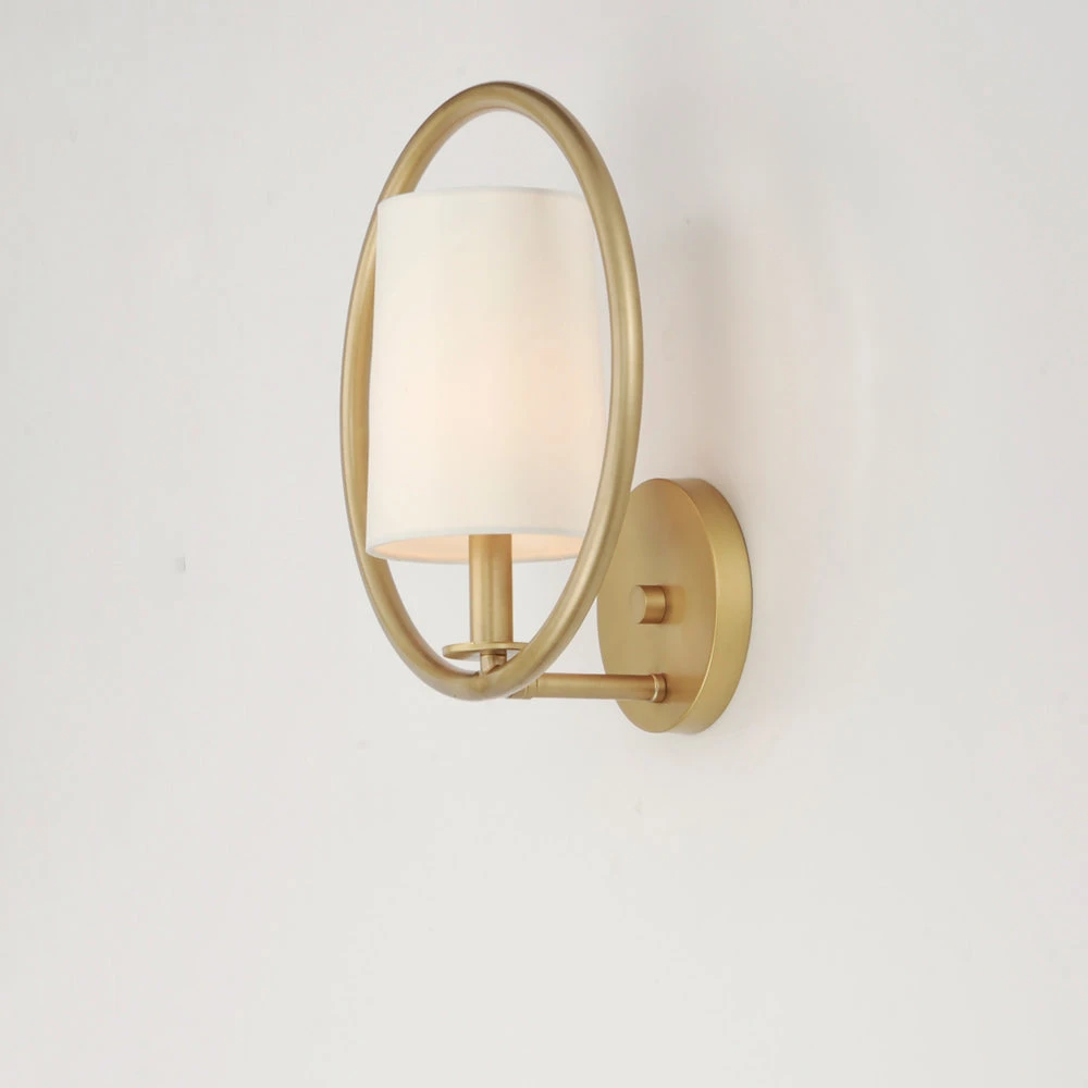 The never-ending flow of a perfect circle is epitomized in the Meridian Wall Light from Maxim Lighting. The heavy gauge ring that centers the fixture is complemented with a lovely natural aged brass finish that instills contemporary warmth and a sense of luxurious indulgence. Within the circle of this chic fixture is a tall, off-white linen drum shade for excellent, inviting illumination.