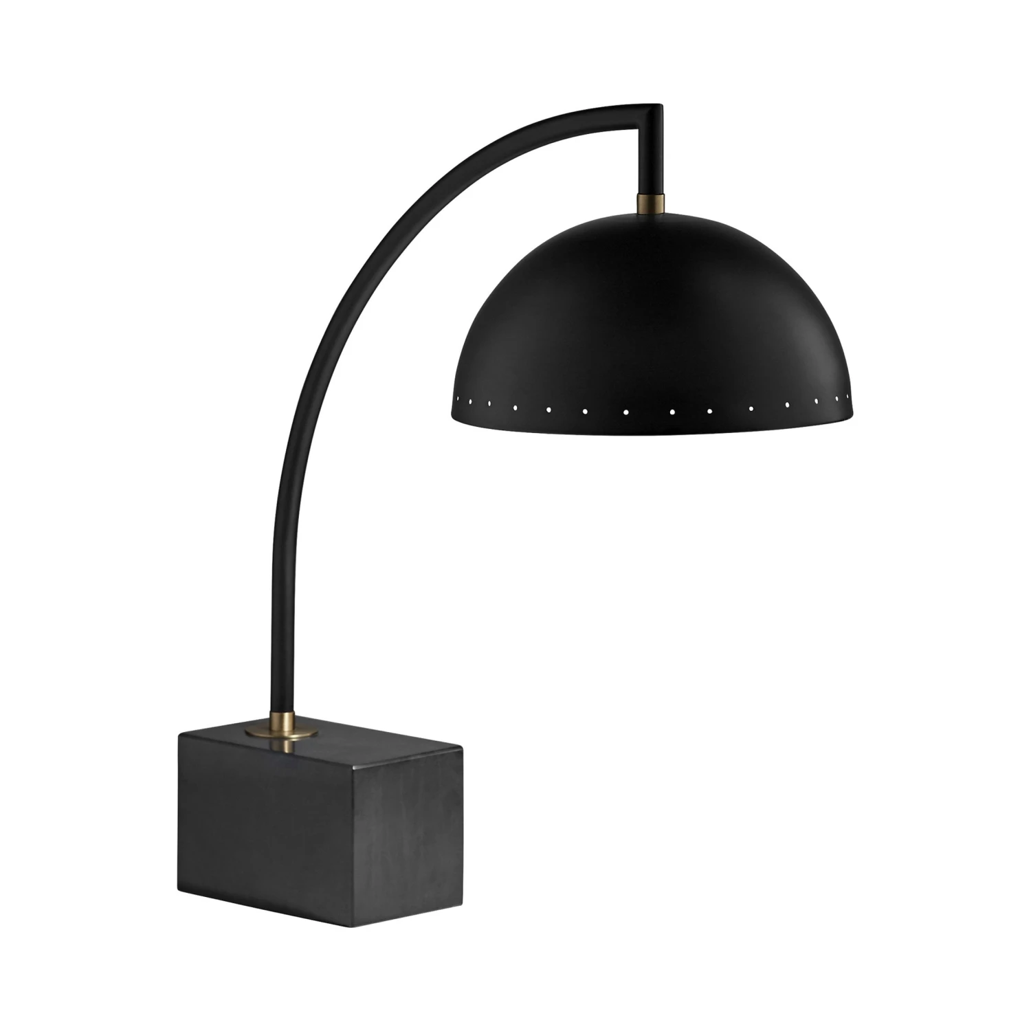 This fascinating table lamp is the epitome of minimalism. Its semi-spherical lamp head is magnificently complimented with a cubed base. A single curvy extension links the two geometric shapes.