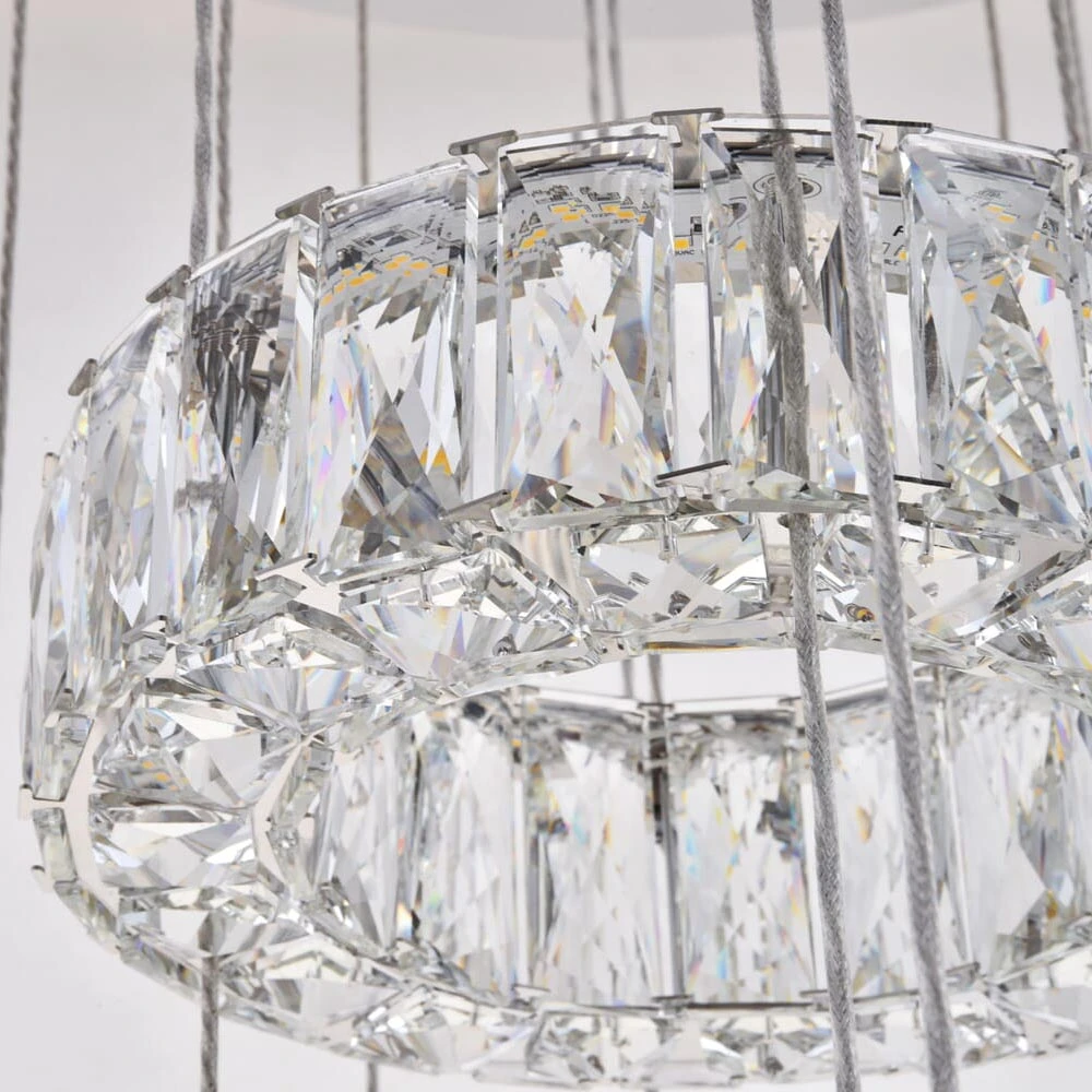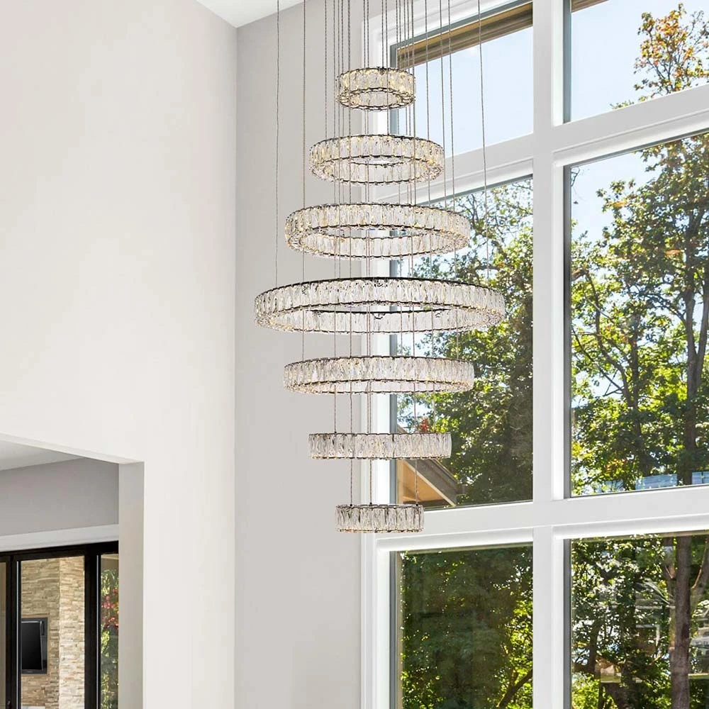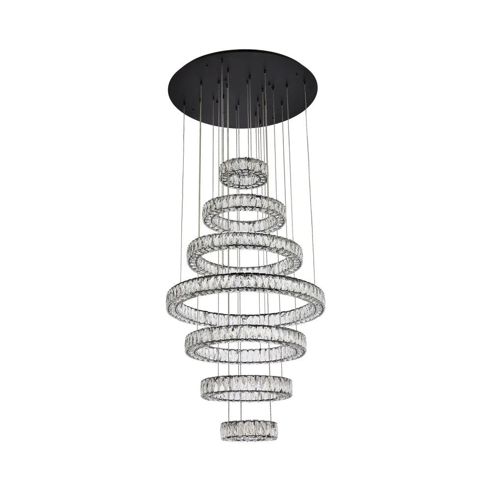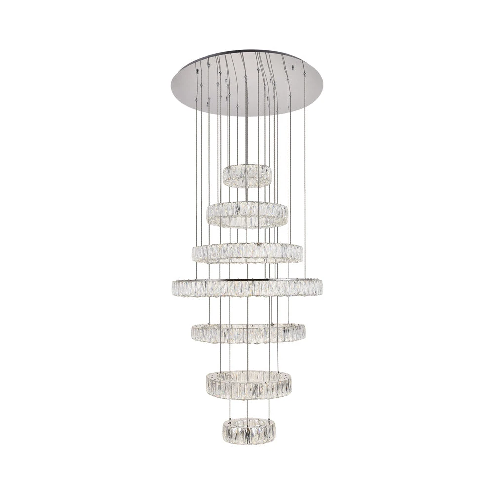 Lighting truly becomes art in the exquisite Monroe LED Chandelier from Elegant Lighting. Graduated rings of crystal sparkle with sophistication, suspended to create the illusion they’re floating in space, delivering airy luxury over a staircase or dining table. A perfect blend of modern energy efficiency and bold glamour.