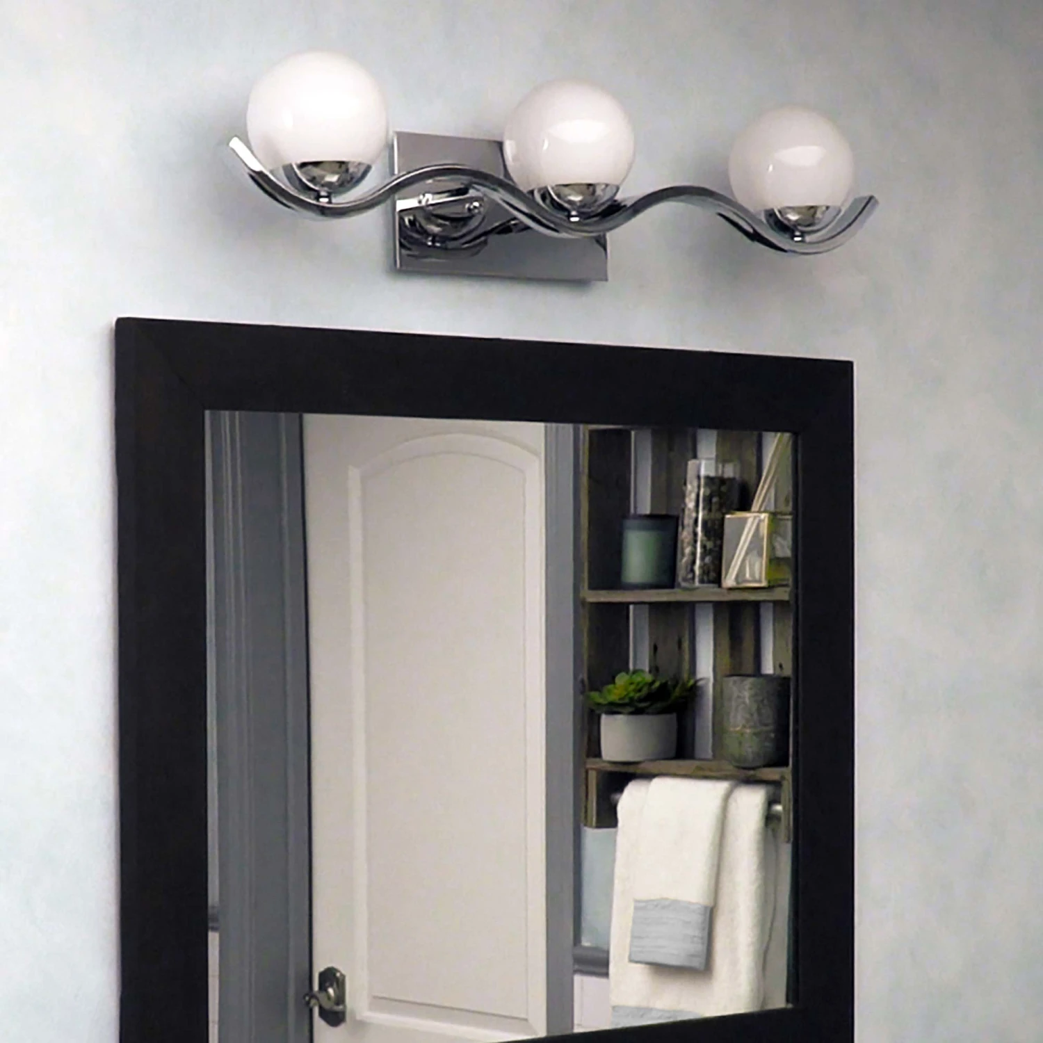 Sculptural and serene, the Motion Bath Vanity Light from Maxim Lighting transforms your bathroom into a luxurious retreat. Opal white glass orbs dangle like gentle droplets of light, suspended from a sleek, polished chrome arm that flows like a wave. Its clean, contemporary design offers a sense of tranquility while providing the perfect illumination for your space.