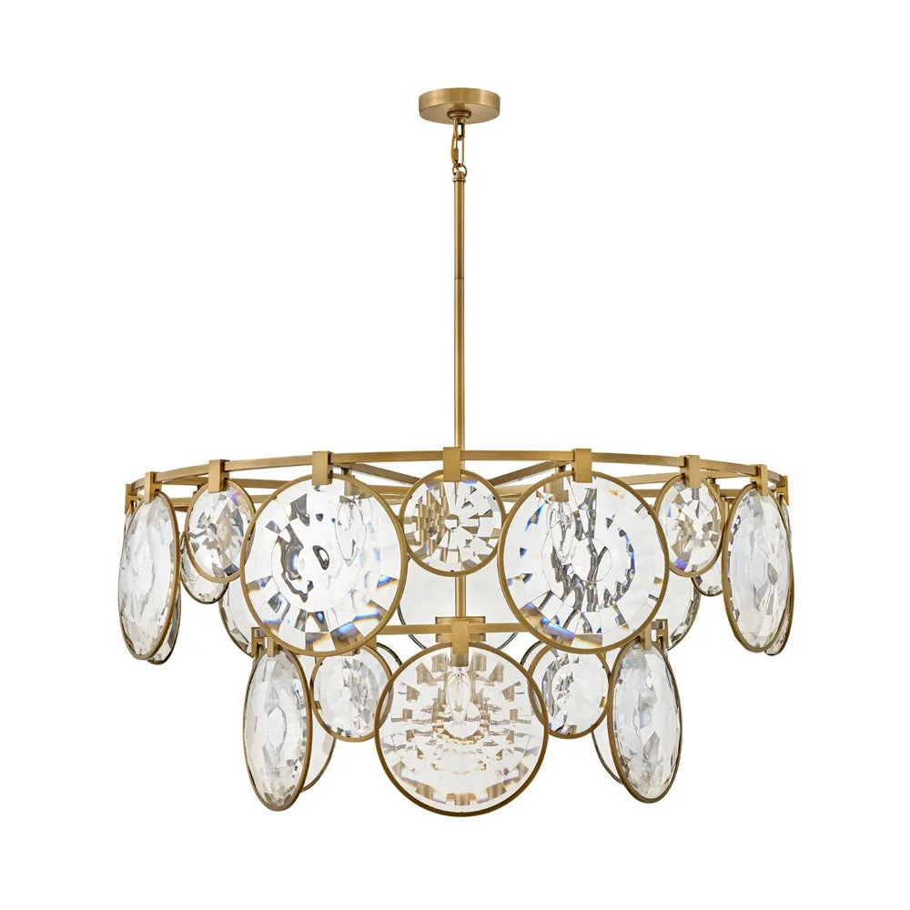 Double tiers of framed, optic crystal discs embody the rugged elegance and sophistication of the Nala Chandelier from Fredrick Ramond. Attached with clips to a minimalist steel framework, each optic crystal lens is multi-faceted, creating a truly engaging scattering of illumination that captures attention over a foyer or in a dining room.