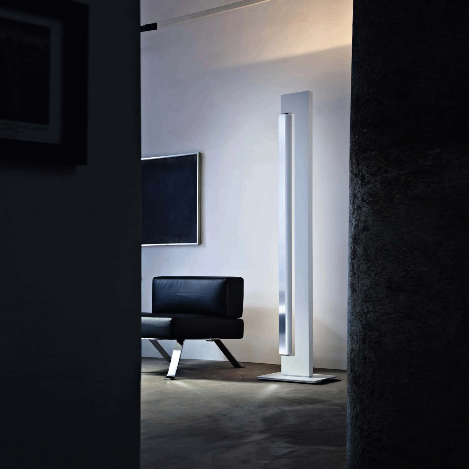 The Ara LED Floor Lamp from NEMO simplifies light delivery with a crisp linear play on silhouetting and a functional design that makes the most of room illumination. Energy-saving light flows through an integrated power supply and dimmer, adding a technical focal point to the paired-down minimalist modern style of this vertically oriented tower-style floor lamp.