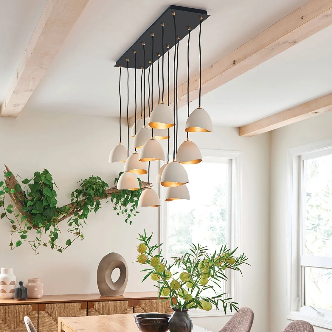 Nula Linear Pendant Light is a work of art. A juxtaposition of industrial elements and organic influencers transmutes simplicity into decadence. Pairing a dense Shell Black or Shell White exterior with a gleaming; gold leaf interior elicits a dramatic effect. Several designs offer flexibility to customize for unique installations.