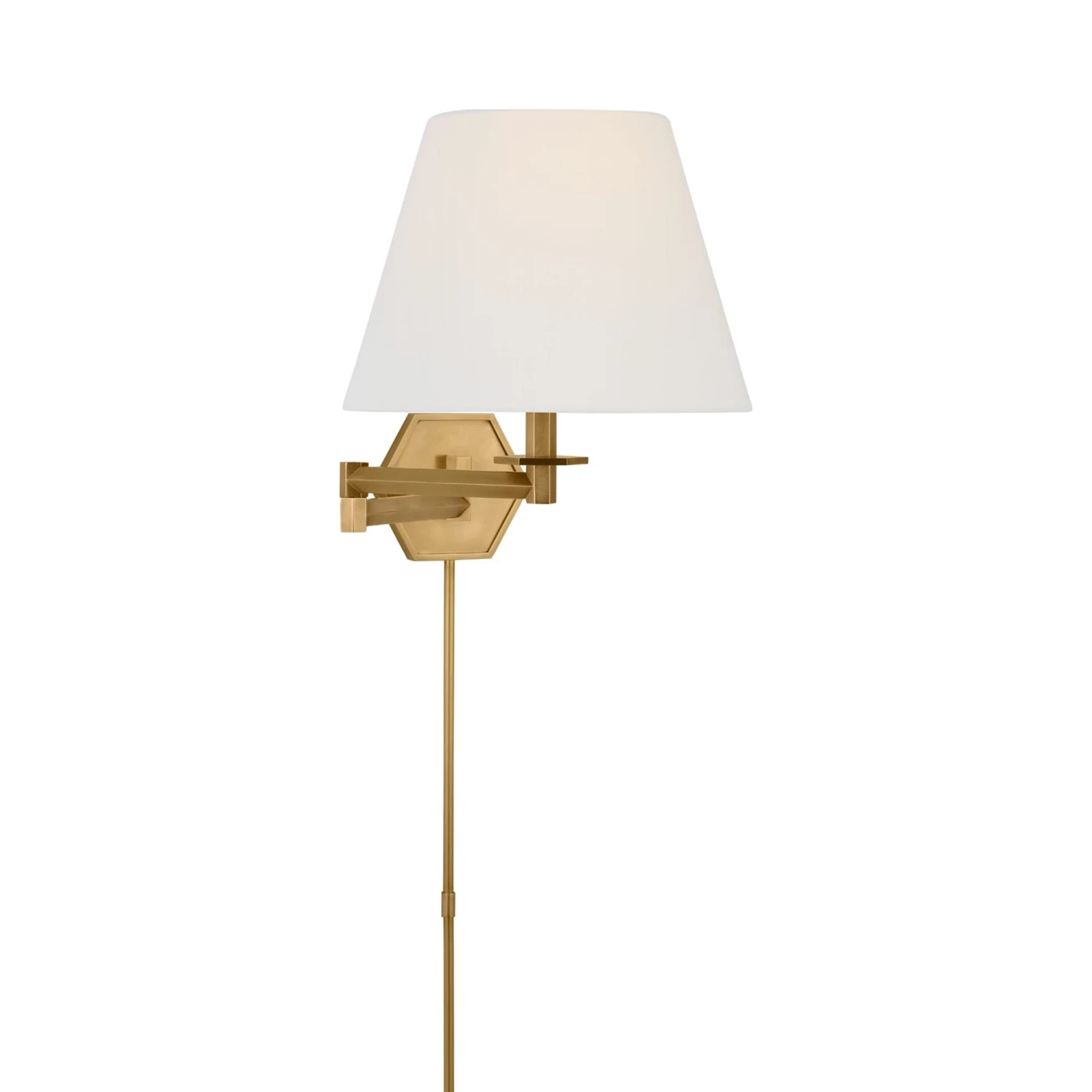 Designers know well enough to work with what worked well and update it to restart a style trend. The Olivier Swing Arm Wall Light from Visual Comfort Signature mimics the traditional swing-arm lamp motif, adding interesting shapes, thicknesses, and angles to whet the palette of classic ambiance. An adjustable arm lies flush against a hexagonal backplate, leaving a pipe-like configuration to introduce a bit of industrial style, as a linen shade is a perfect highlight.